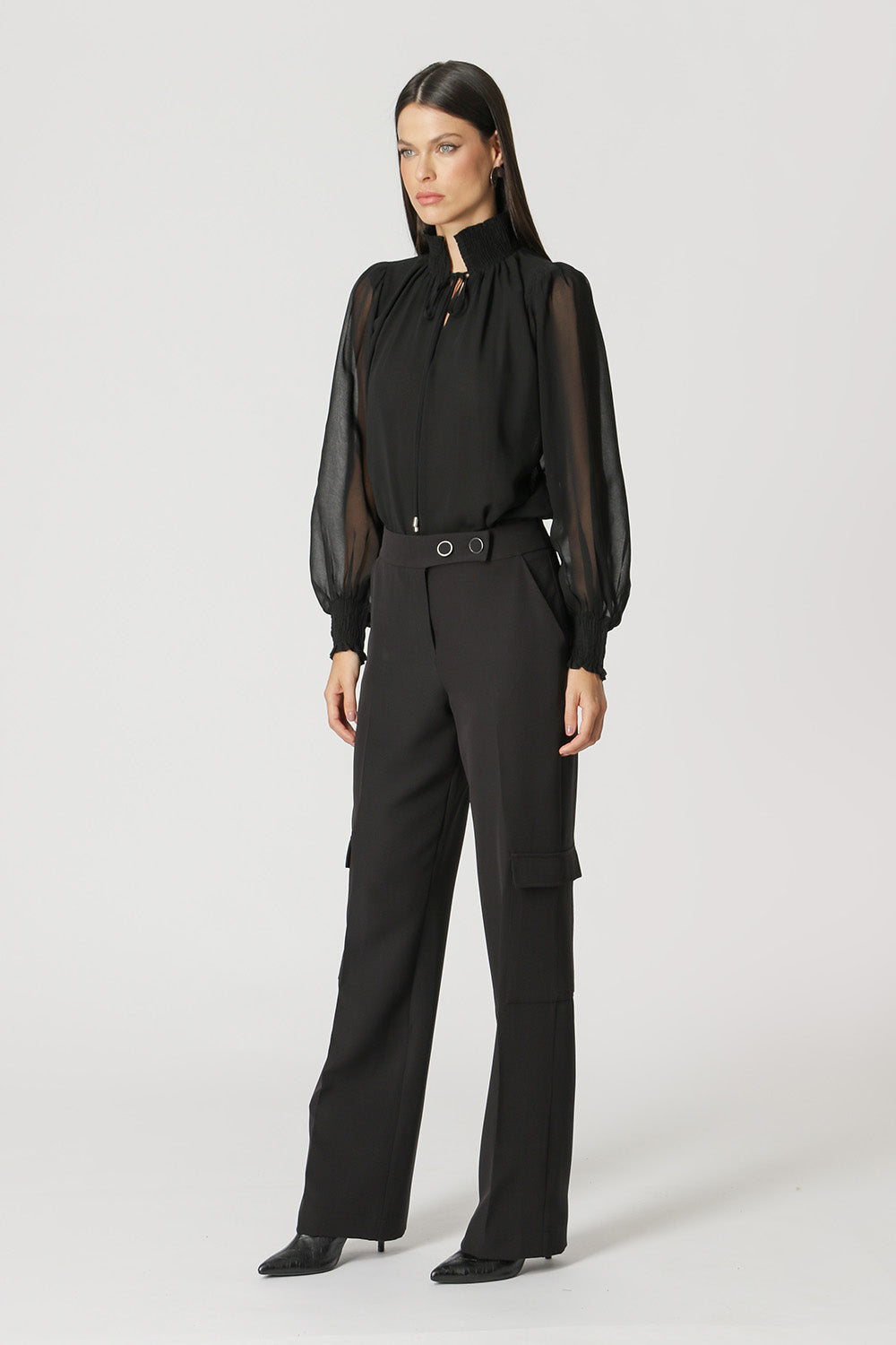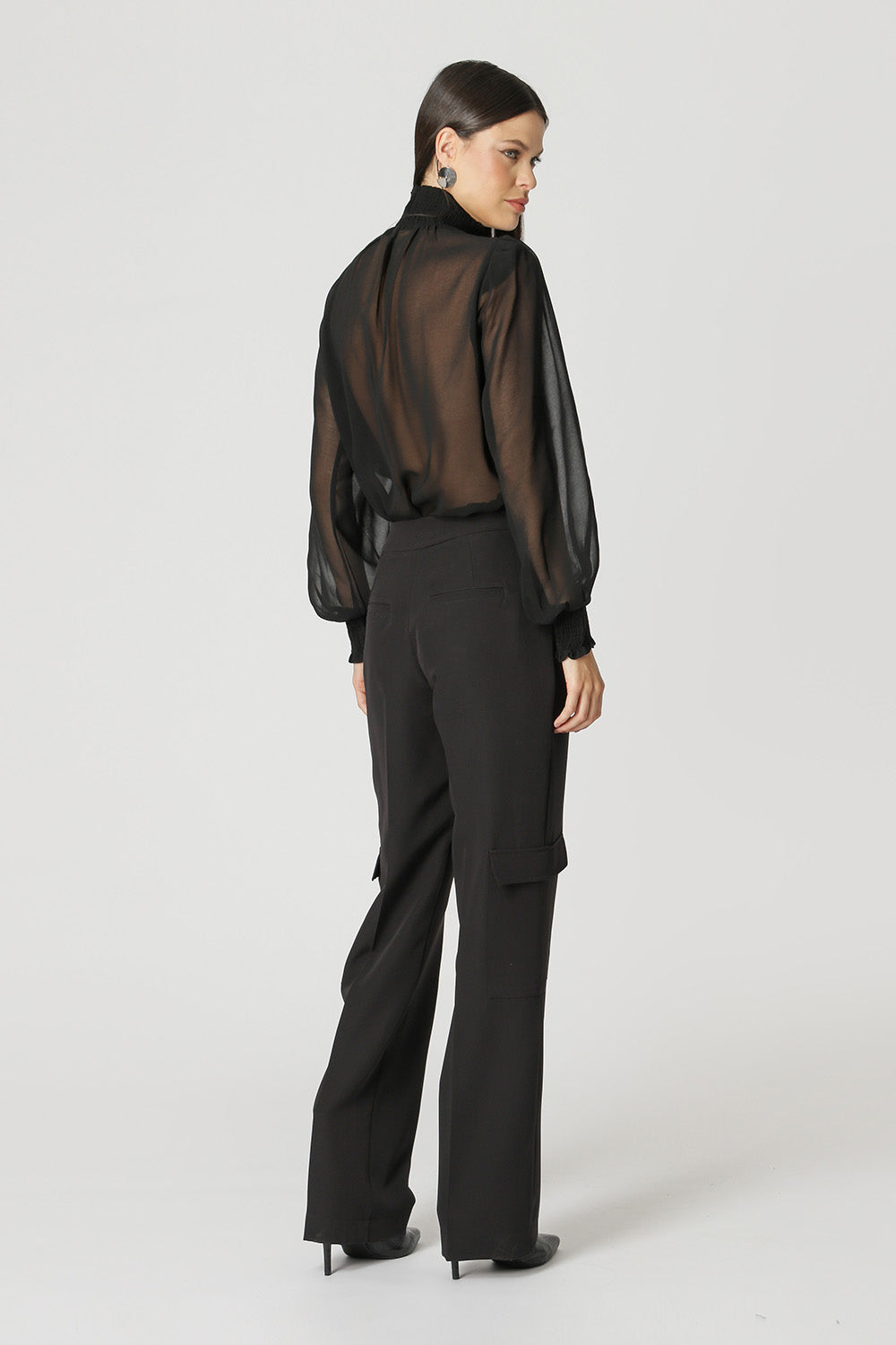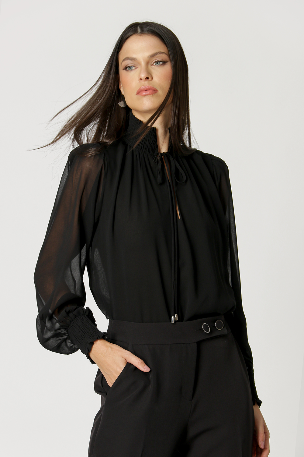 Blusa manga longa bufante em detalhes de lastex na gola e punho. Confeccionada em tecido crepe light. Uma peça elegante e ideal para compor looks work.