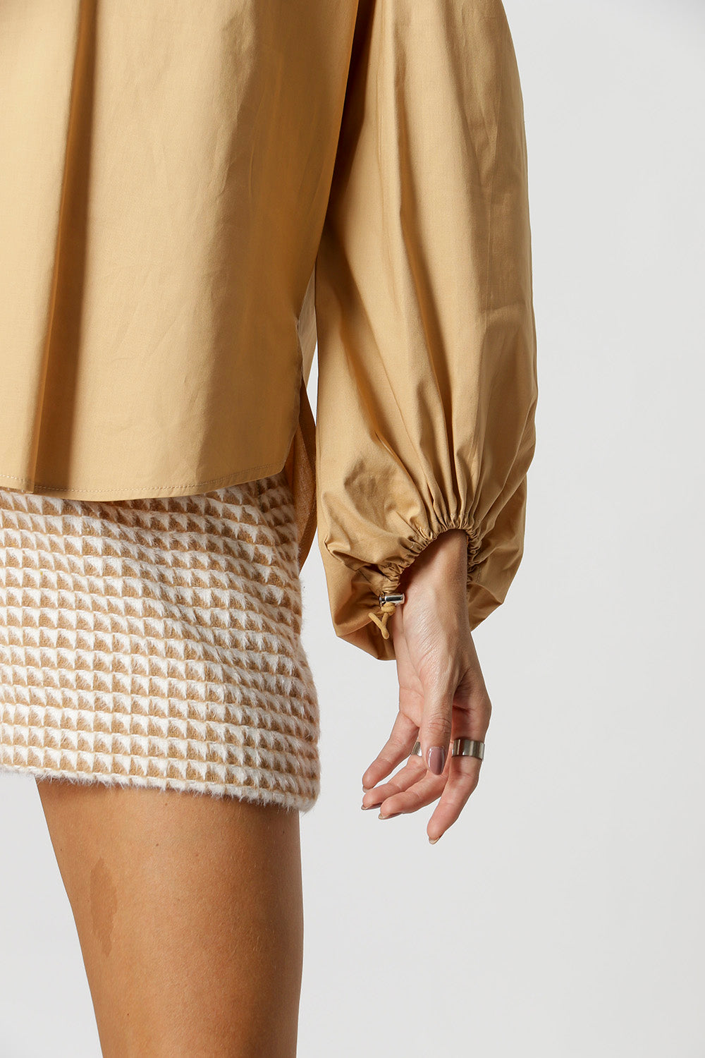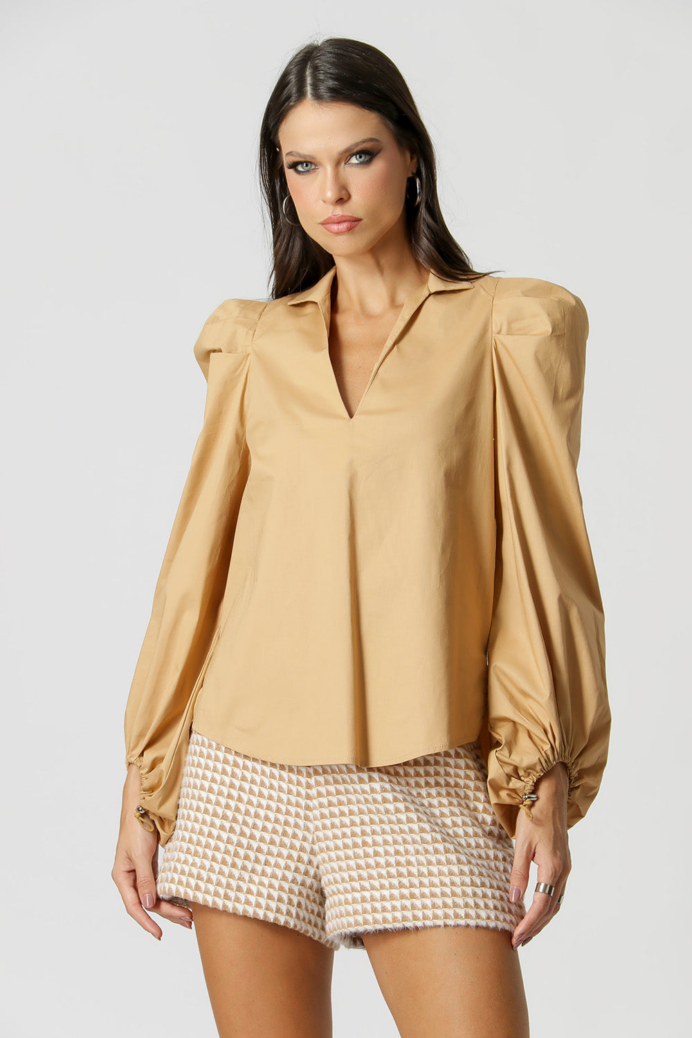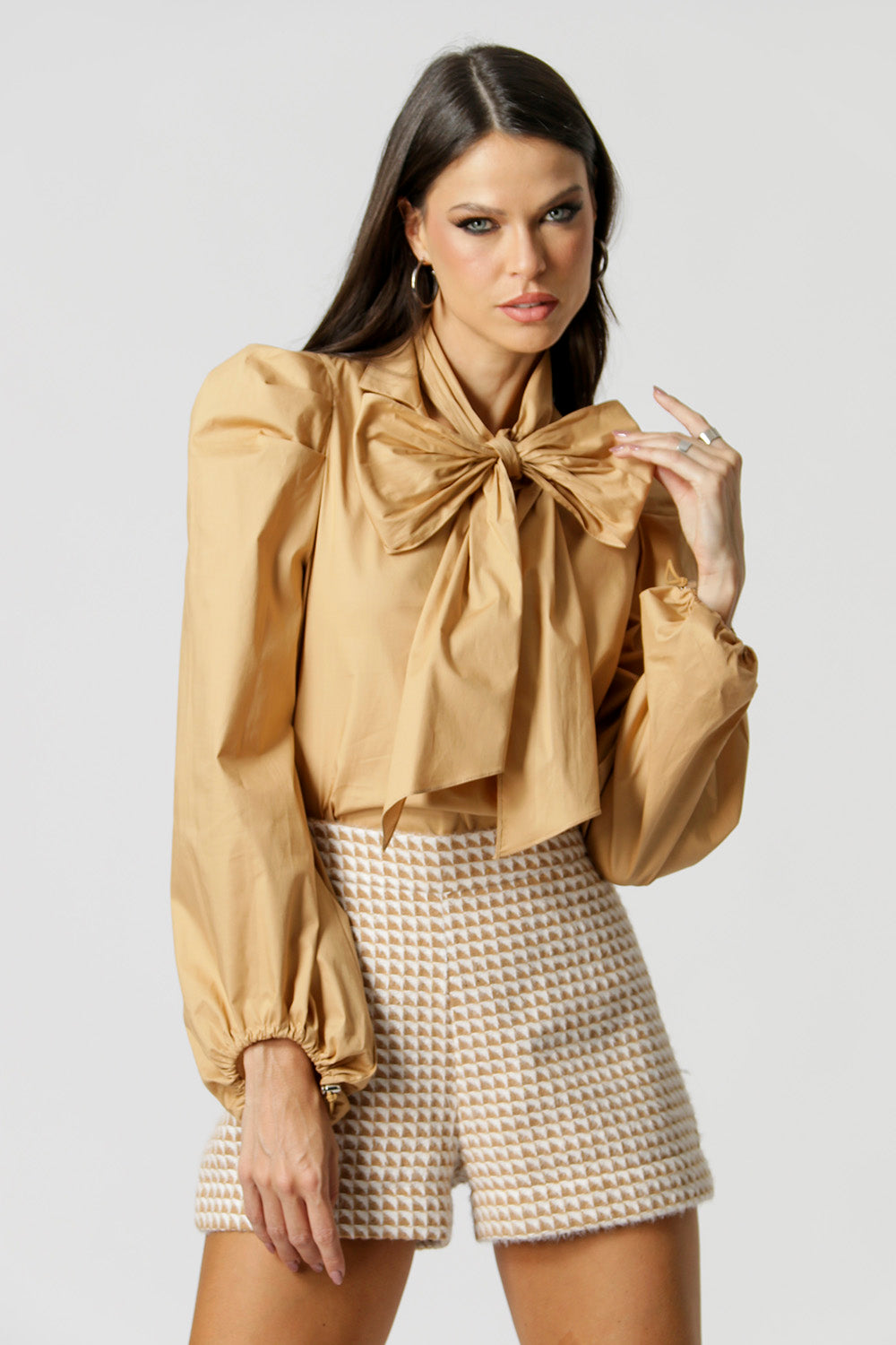 Blusa manga longa com pregas e regulador diferenciado na barra com detalhes de laço na gola. Peça confeccionada em tecido tricoline. Uma peça super charmosa e ao mesmo tempo diferenciada para criar looks lindos.