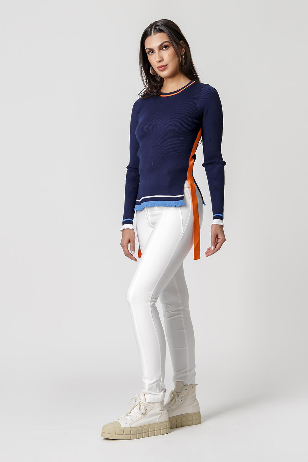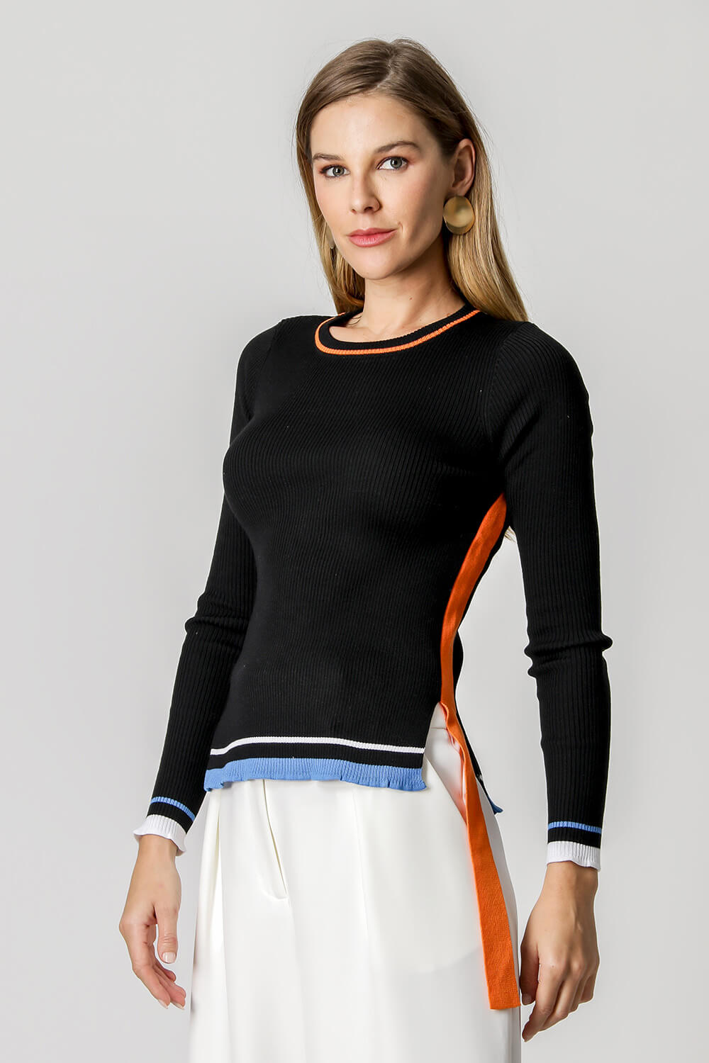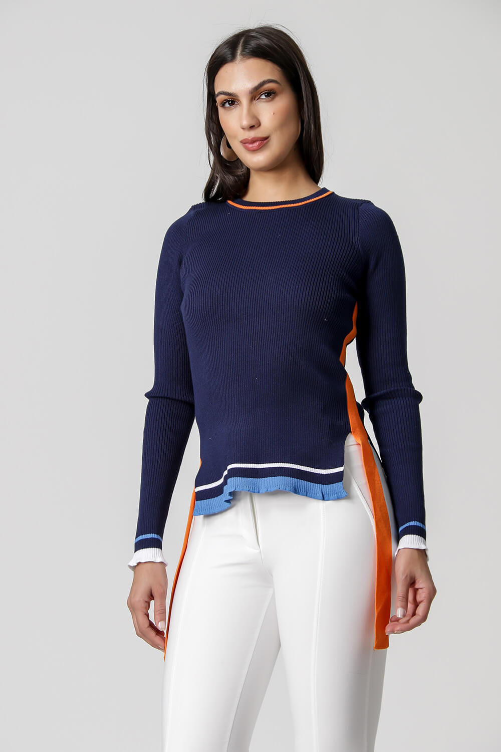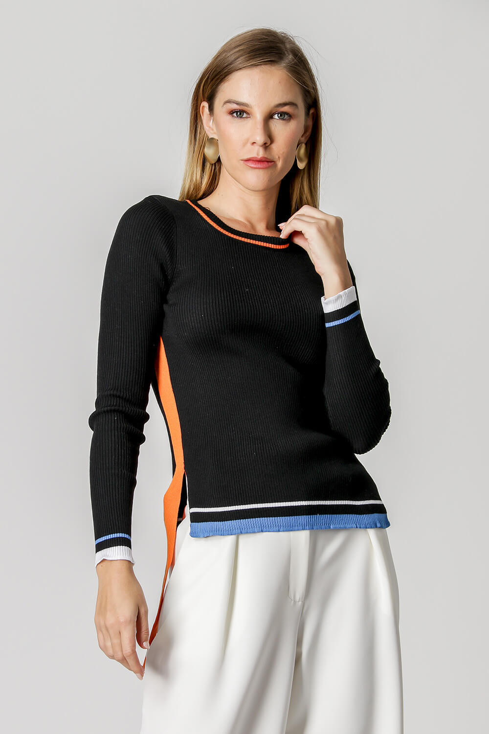 Blusa de retilínea com manga longa, possui decote arredondado e cores mais fortes nas mangas, decote, na barra e nas laterais. Item fashion e decolado para looks mais casuais.