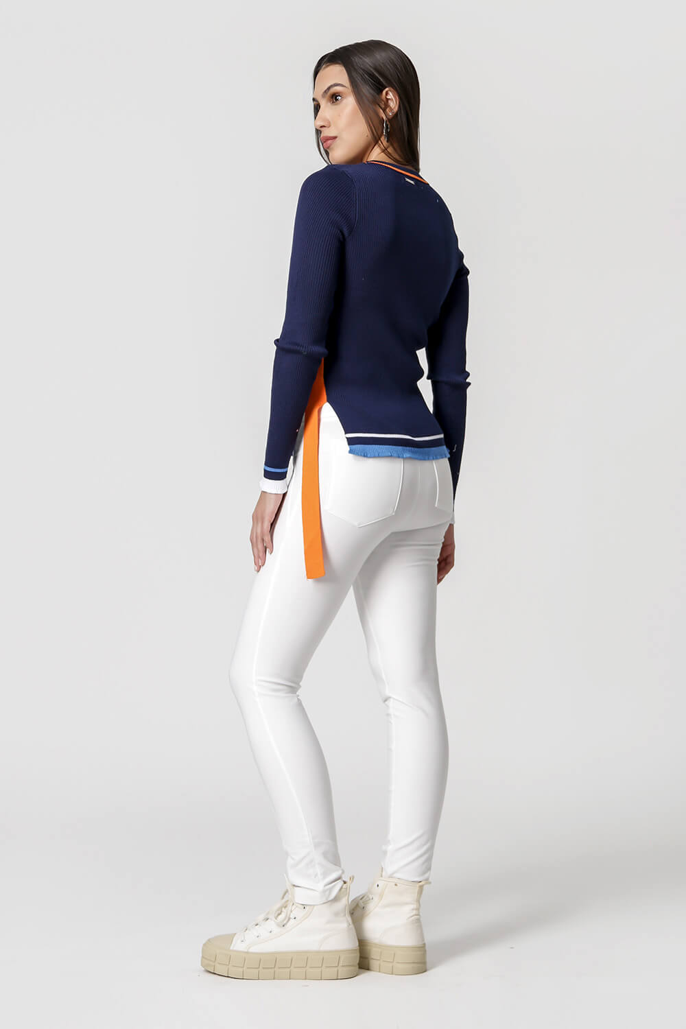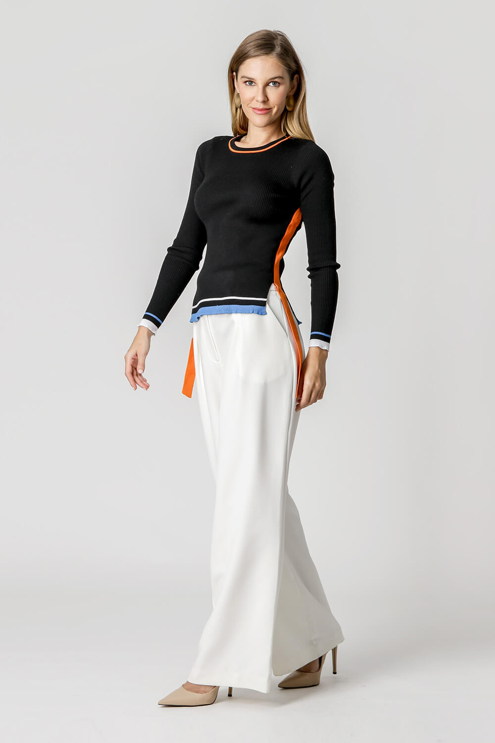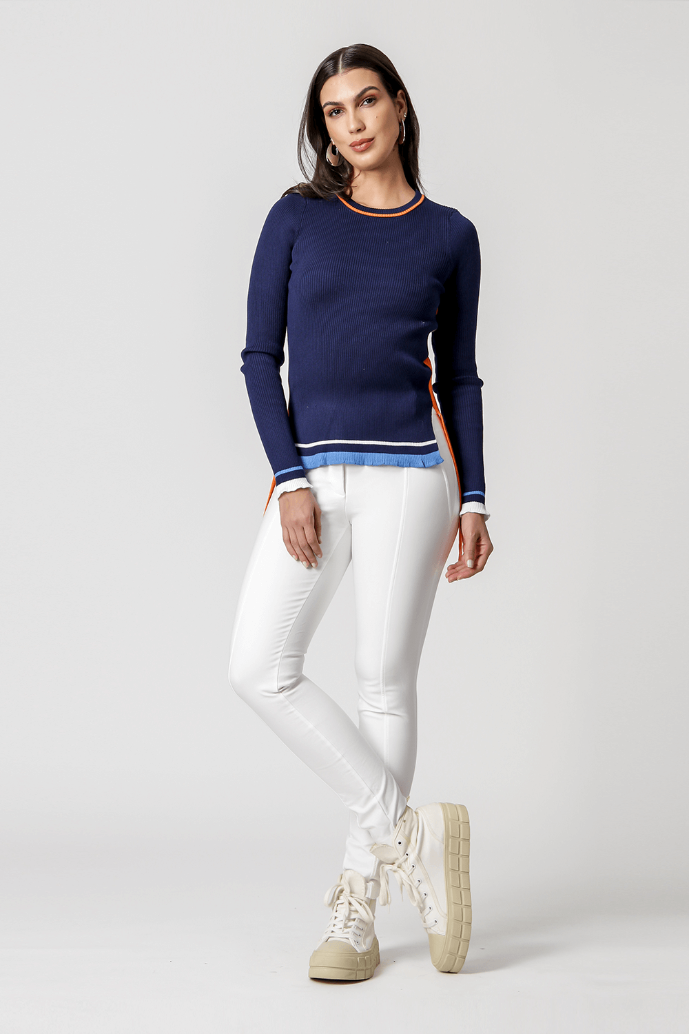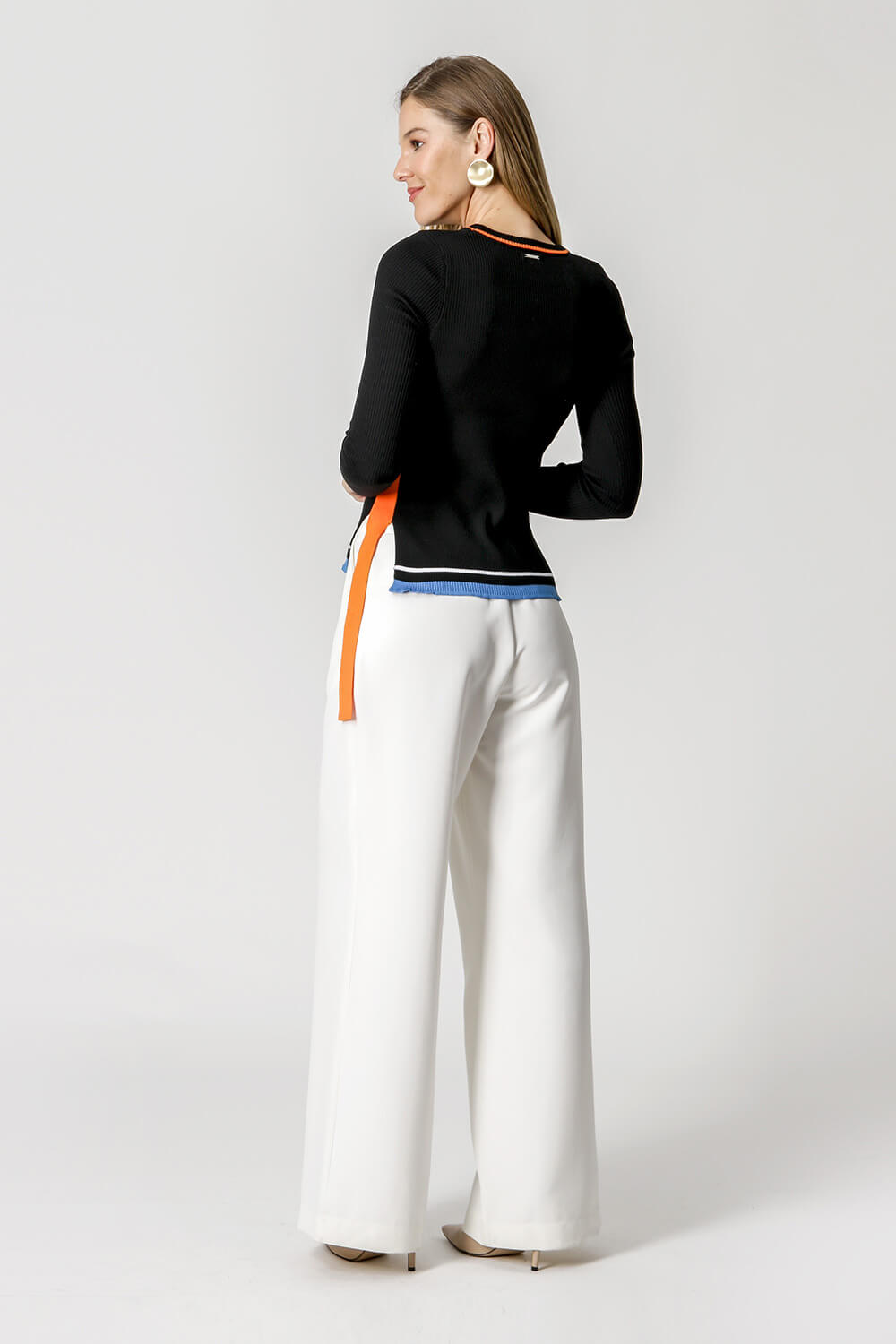 Blusa de retilínea com manga longa, possui decote arredondado e cores mais fortes nas mangas, decote, na barra e nas laterais. Item fashion e decolado para looks mais casuais.