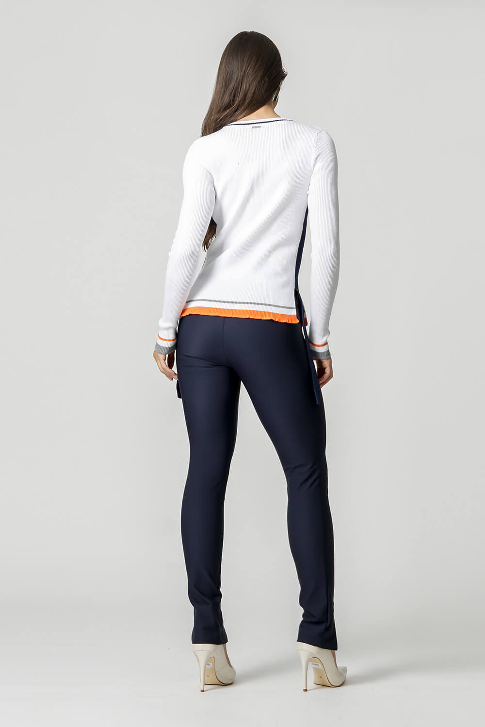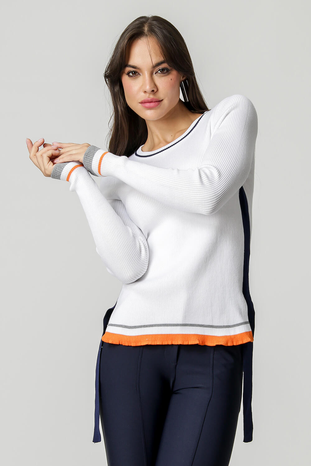 Blusa de retilínea com manga longa, possui decote arredondado e cores mais fortes nas mangas, decote, na barra e nas laterais. Item fashion e decolado para looks mais casuais.