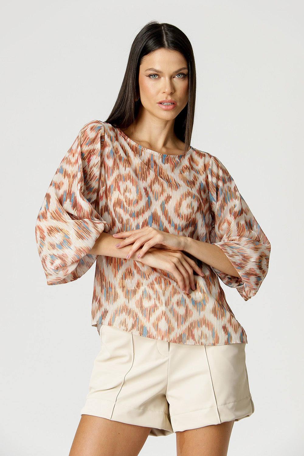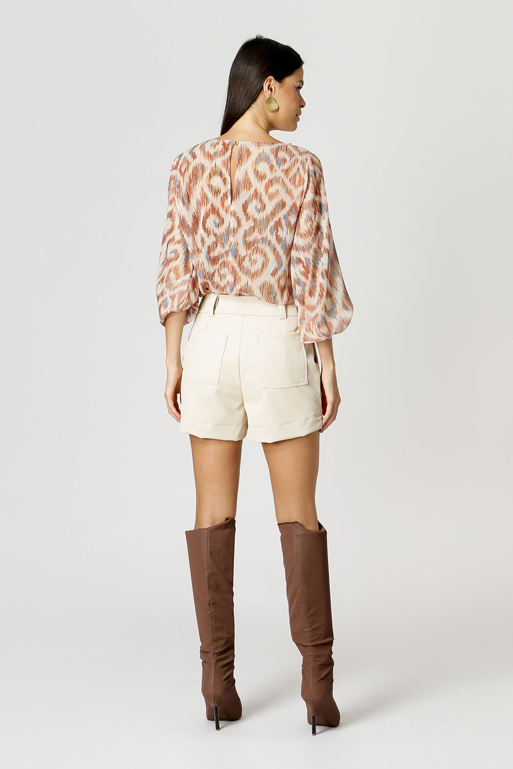Blusa manga longa com volume. Confeccionada em tecido chiffon estampado com fio metalizado. Peça com caimento leve e modelagem solta perfeito para o dia a dia.