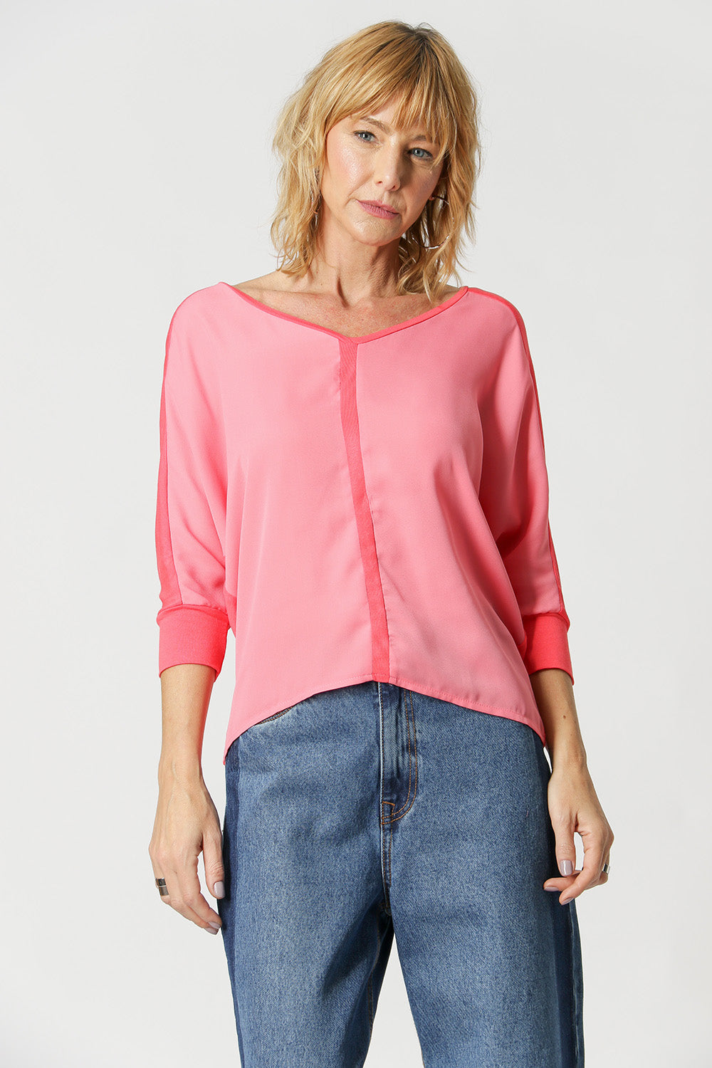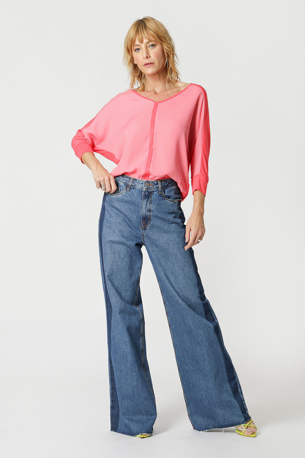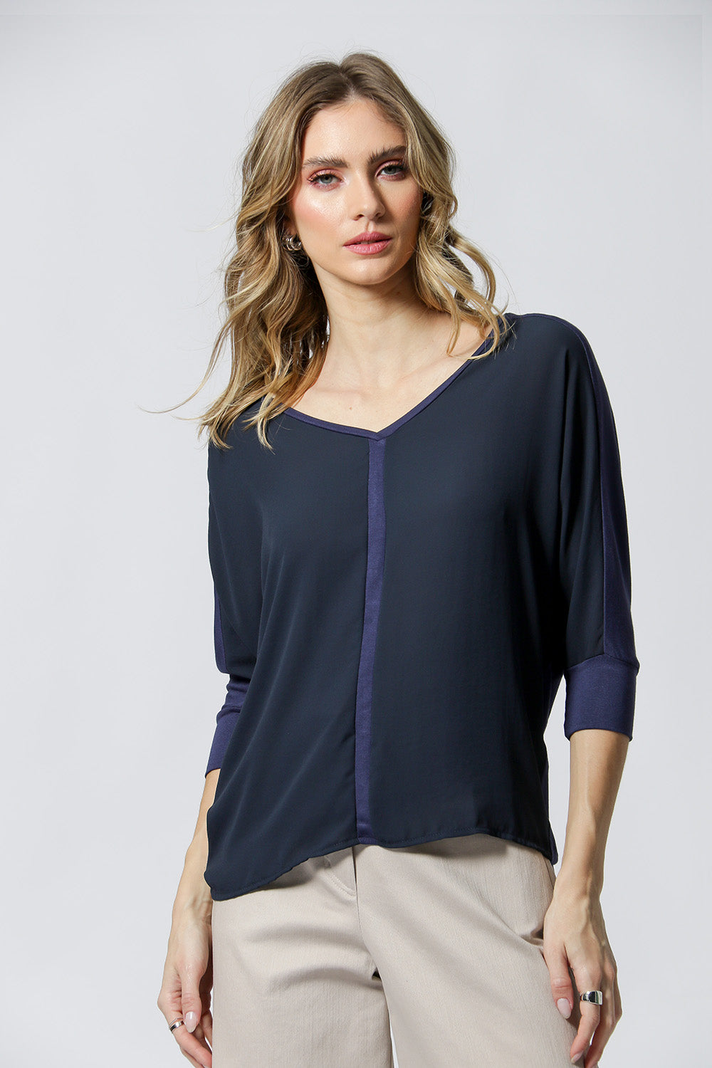 Blusa ampla, com manga morcego e recortes. Feita com mix de tecidos. A peça ideal para criar looks com estilo e com o conforto que você merece!