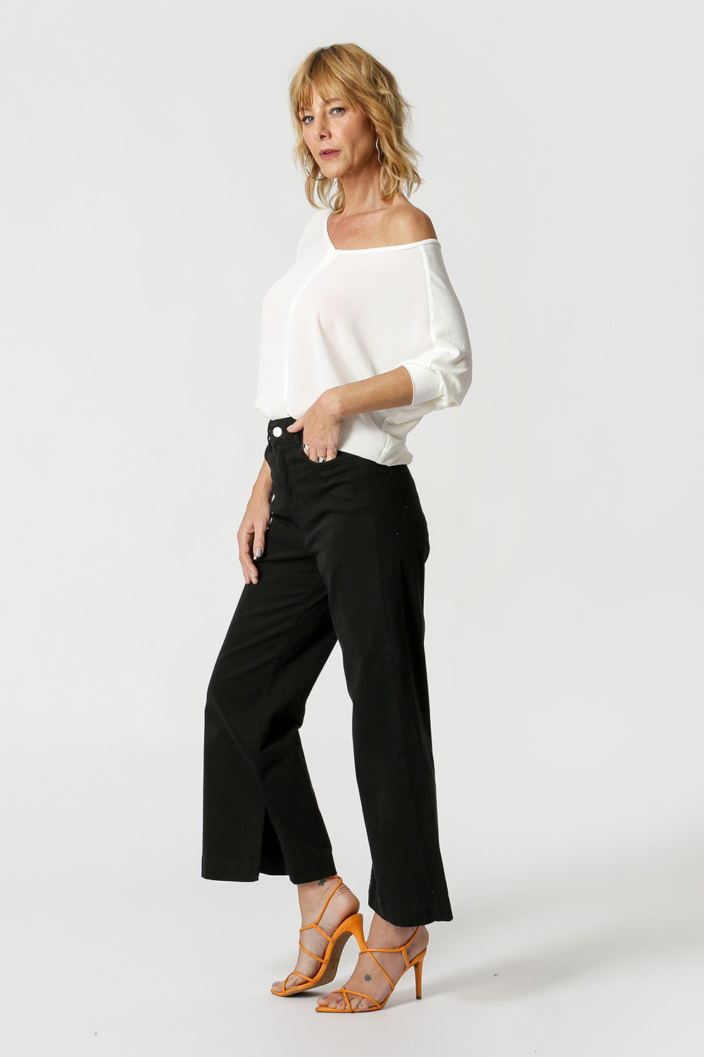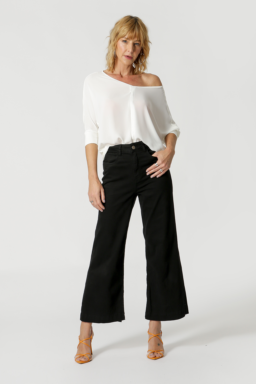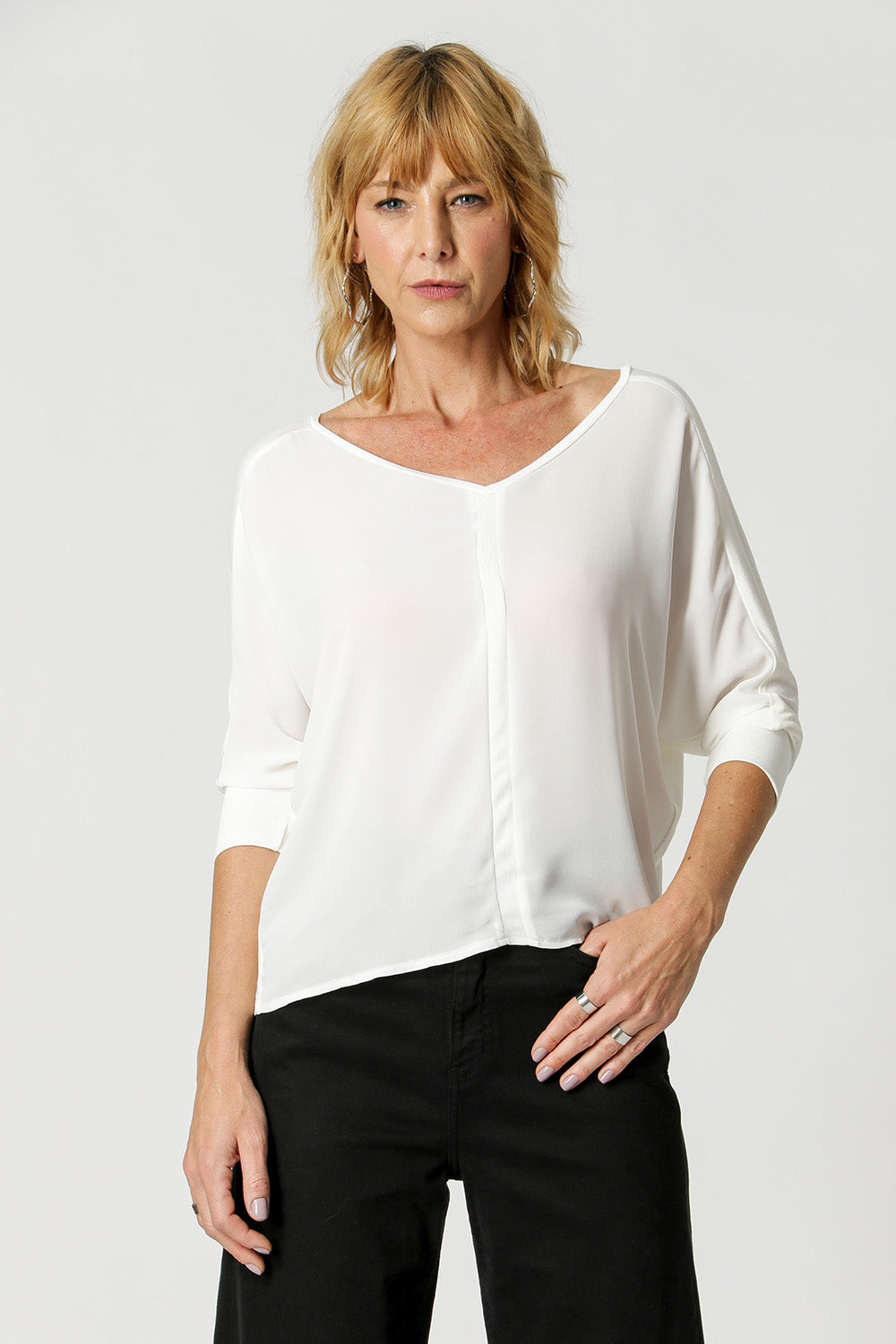 Blusa ampla, com manga morcego e recortes. Feita com mix de tecidos. A peça ideal para criar looks com estilo e com o conforto que você merece!