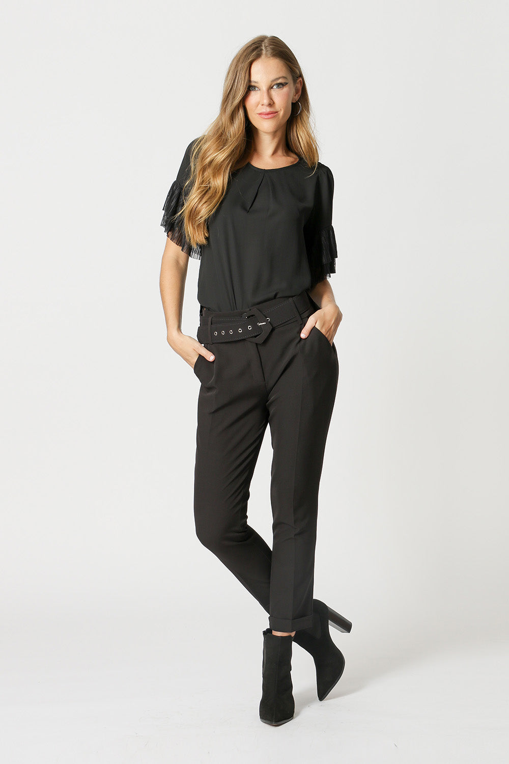Blusa com detalhe na manga plissada. Confeccionada em tecido fluido, com texturas em tule. Linda peça para um look de trabalho poderoso.