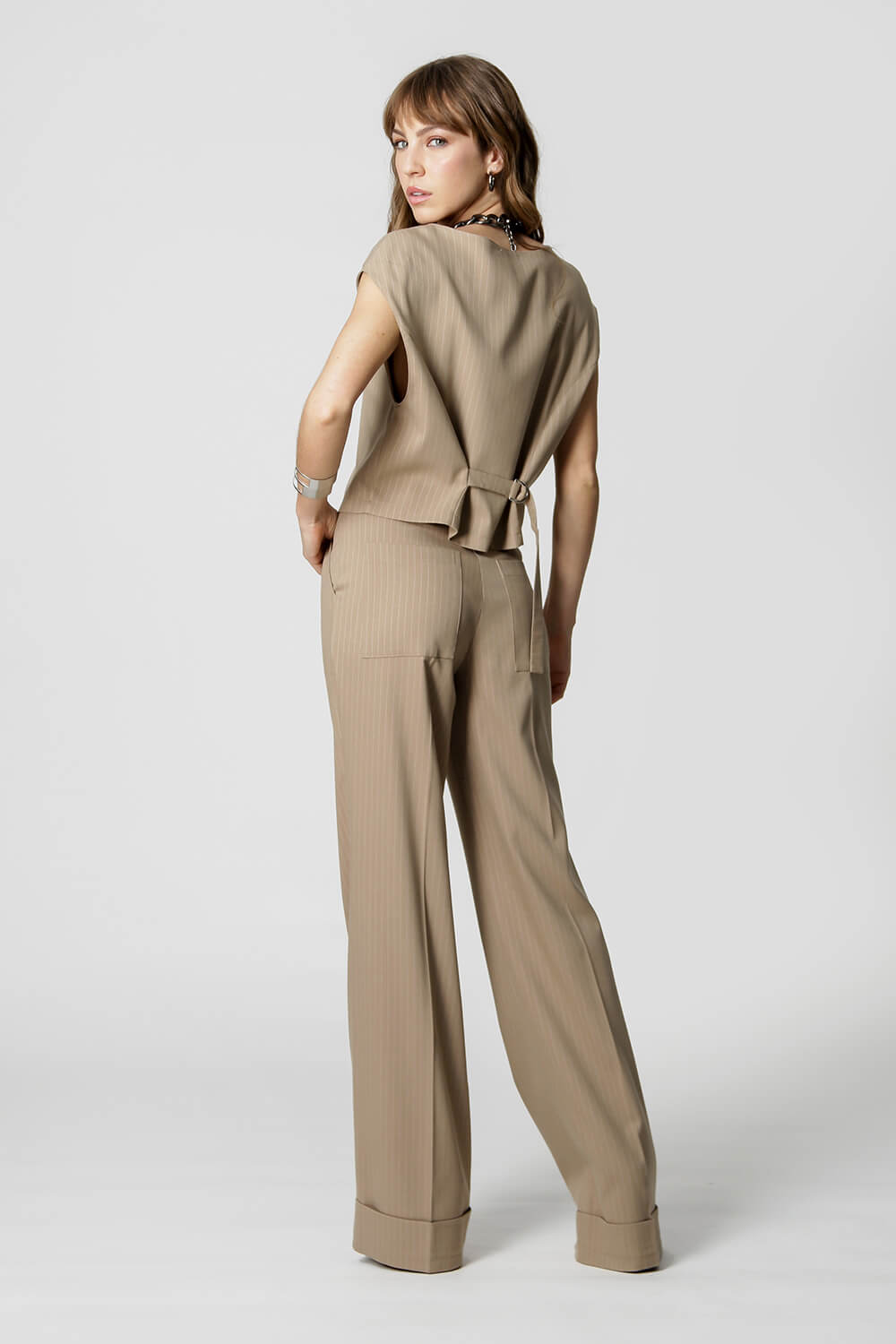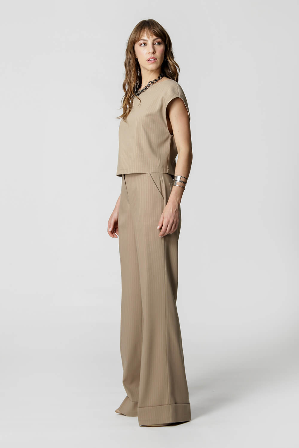 Blusa Minimalista com detalhe de fivela de metal na parte posterior para ajuste. Modelo confeccionado em tecido alfaiataria risca de giz. Com caimento solto, reto e confortável para look mood work.