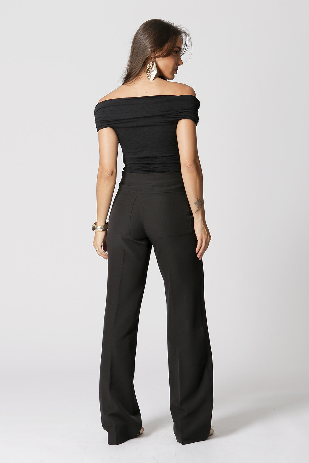 Blusa ombro a ombro, possui um charmoso drapeado nos ombros que traz um ar romântico para o look.