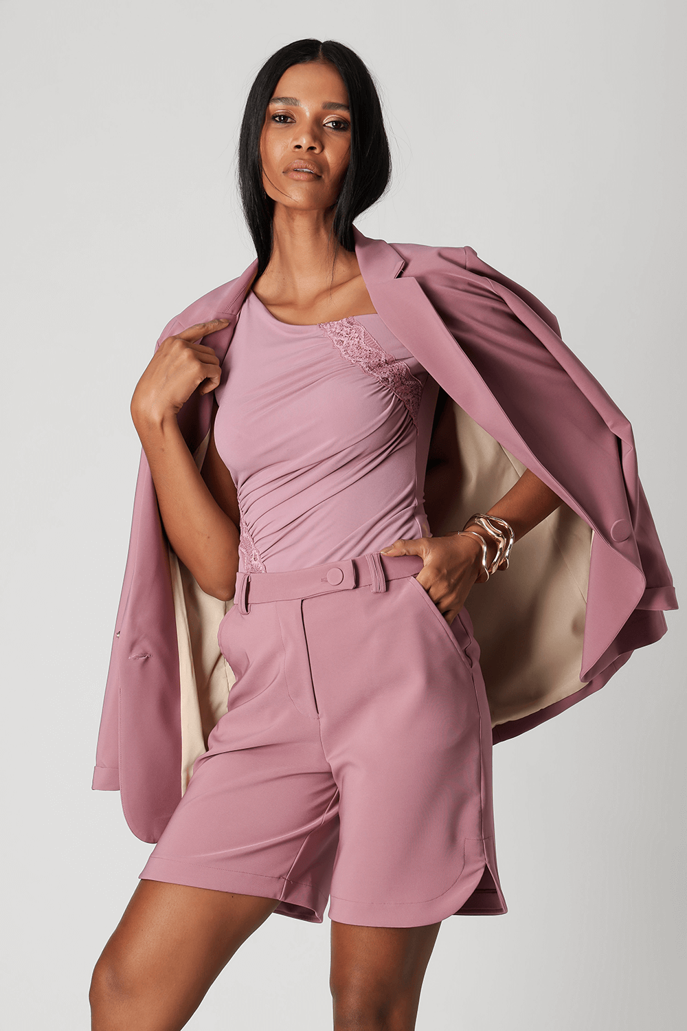 Blusa em malha ITY com ombro assimétrico, detalhe de renda vazada no decote e na barra, unindo feminilidade, conforto e caimento leve.