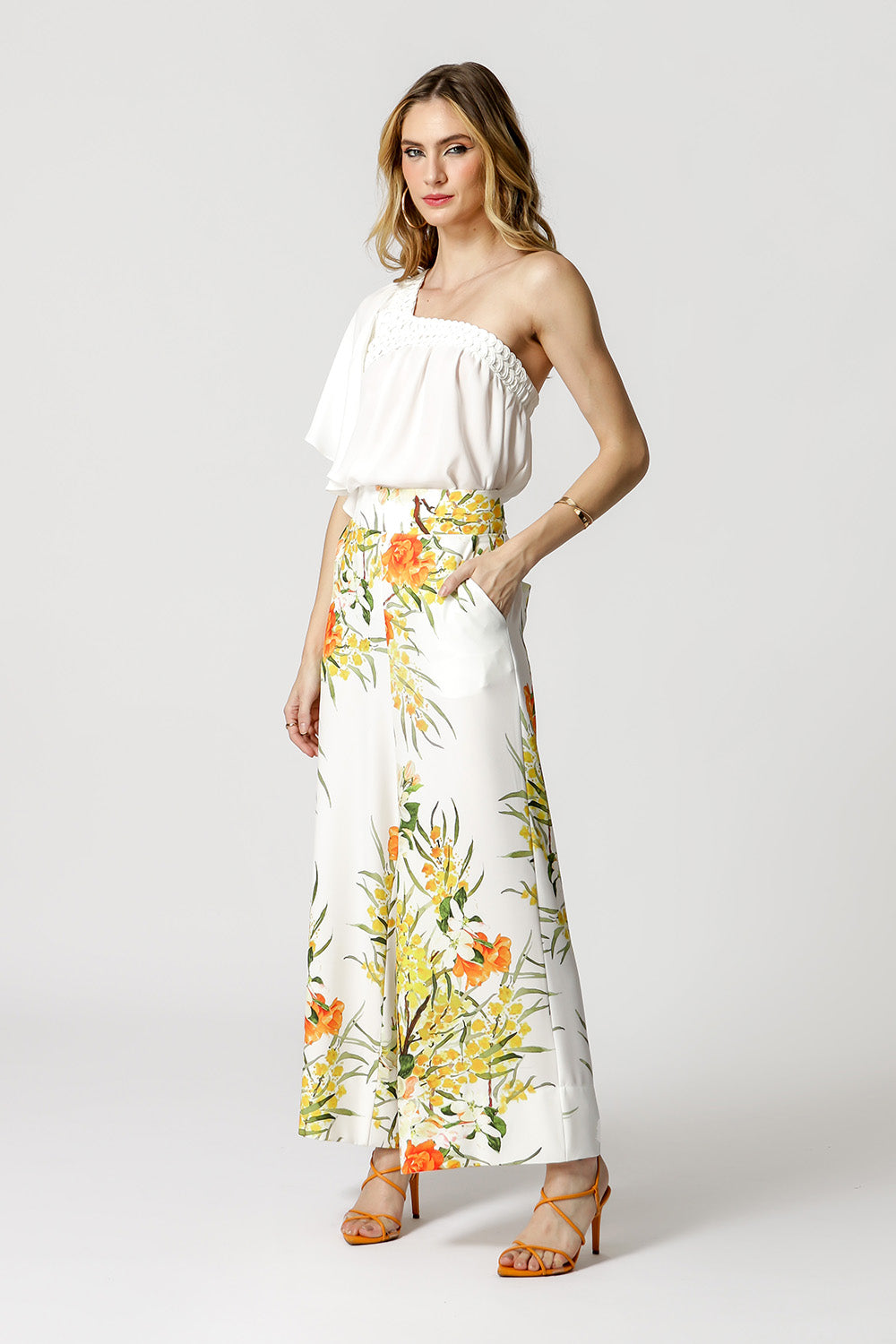 Blusa ombro único com detalhe de macramê. Uma peça confeccionada em tecido crepe fluído. Um modelo elegante,cheia de charme para compor looks casual.