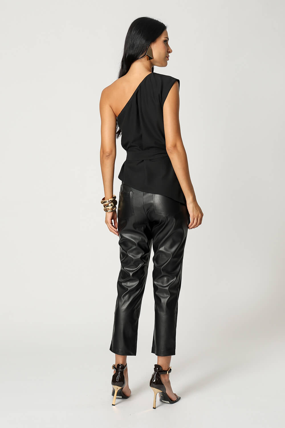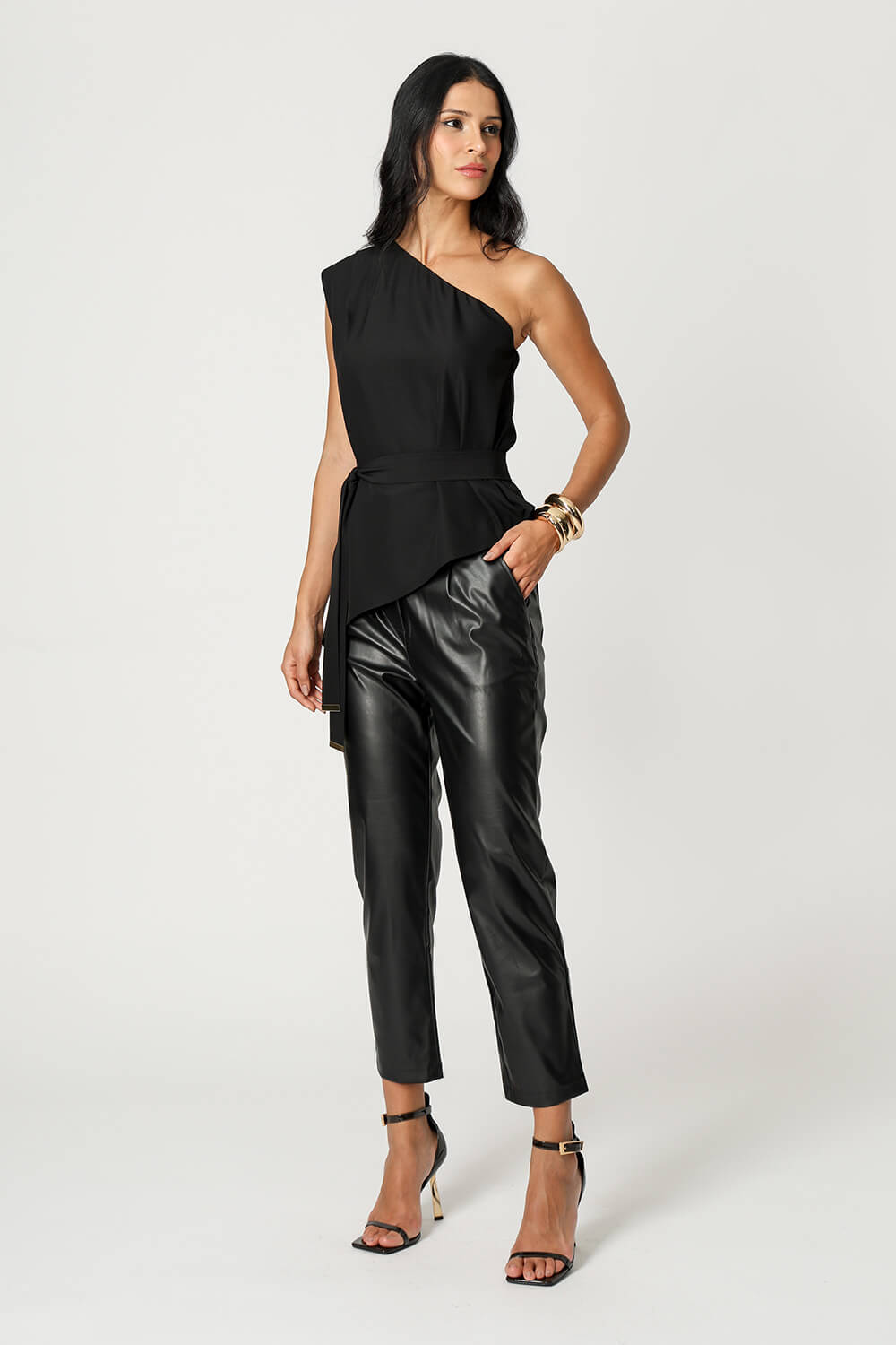 Com design assimétrico e sofisticado, esta blusa traz elegância em cada detalhe. O destaque fica por conta das pregas estruturadas e do cinto faixa com ponteira jacaré em metal, que valoriza a silhueta com charme e estilo. Ideal para composições modernas e refinadas.