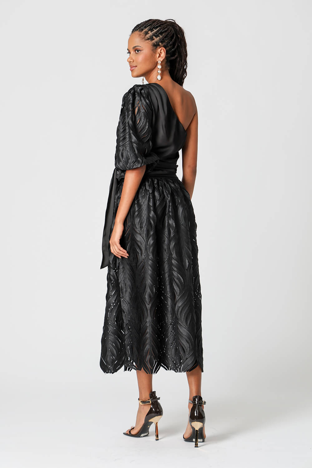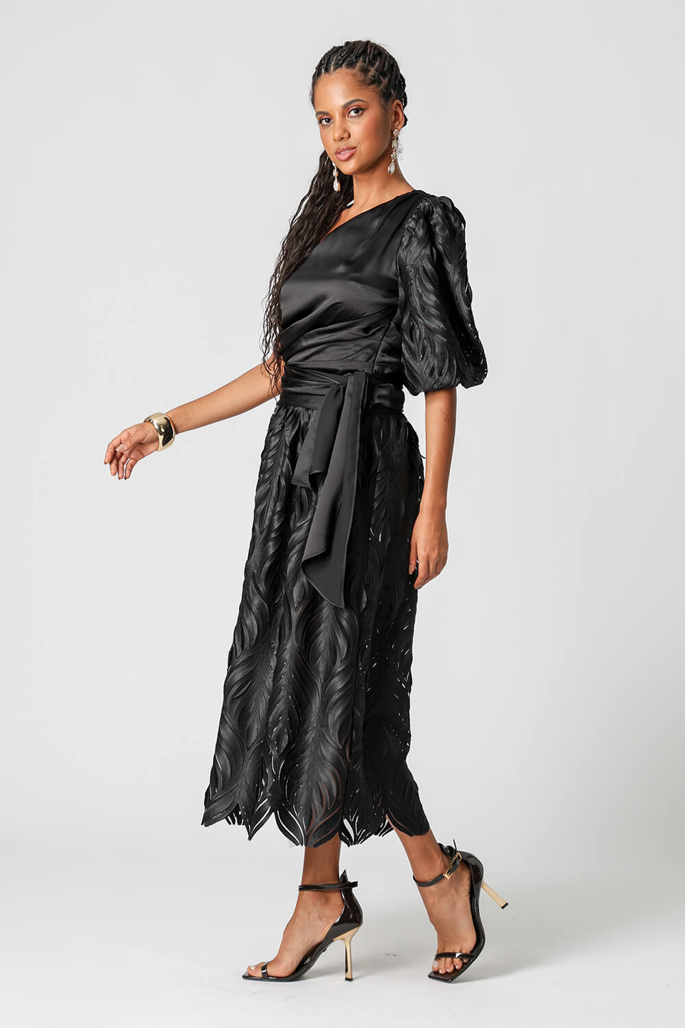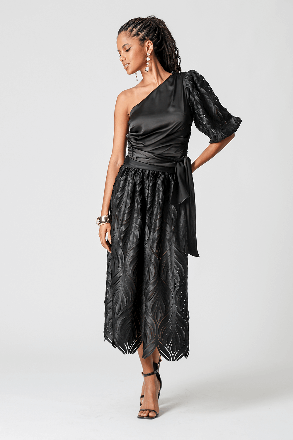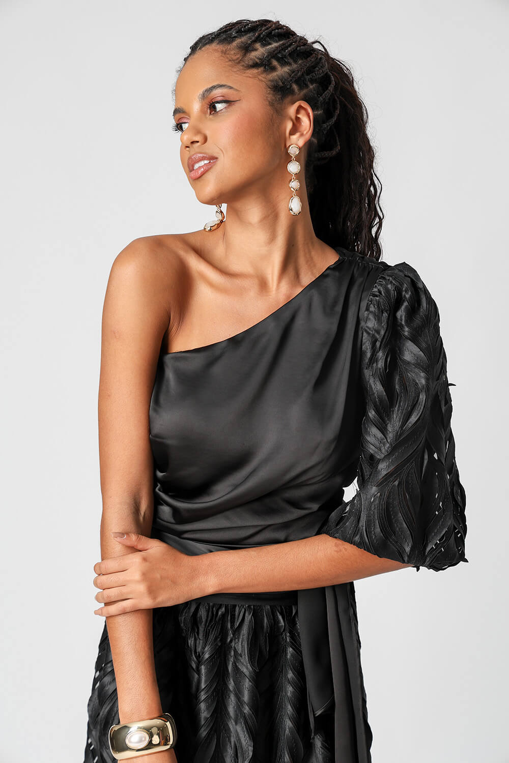 Blusa ombro único em cetim com tule bordado a laser, manga bufante de renda e frente franzida. Possui lenço na barra para amarração, unindo romantismo e sofisticação em uma única peça.
