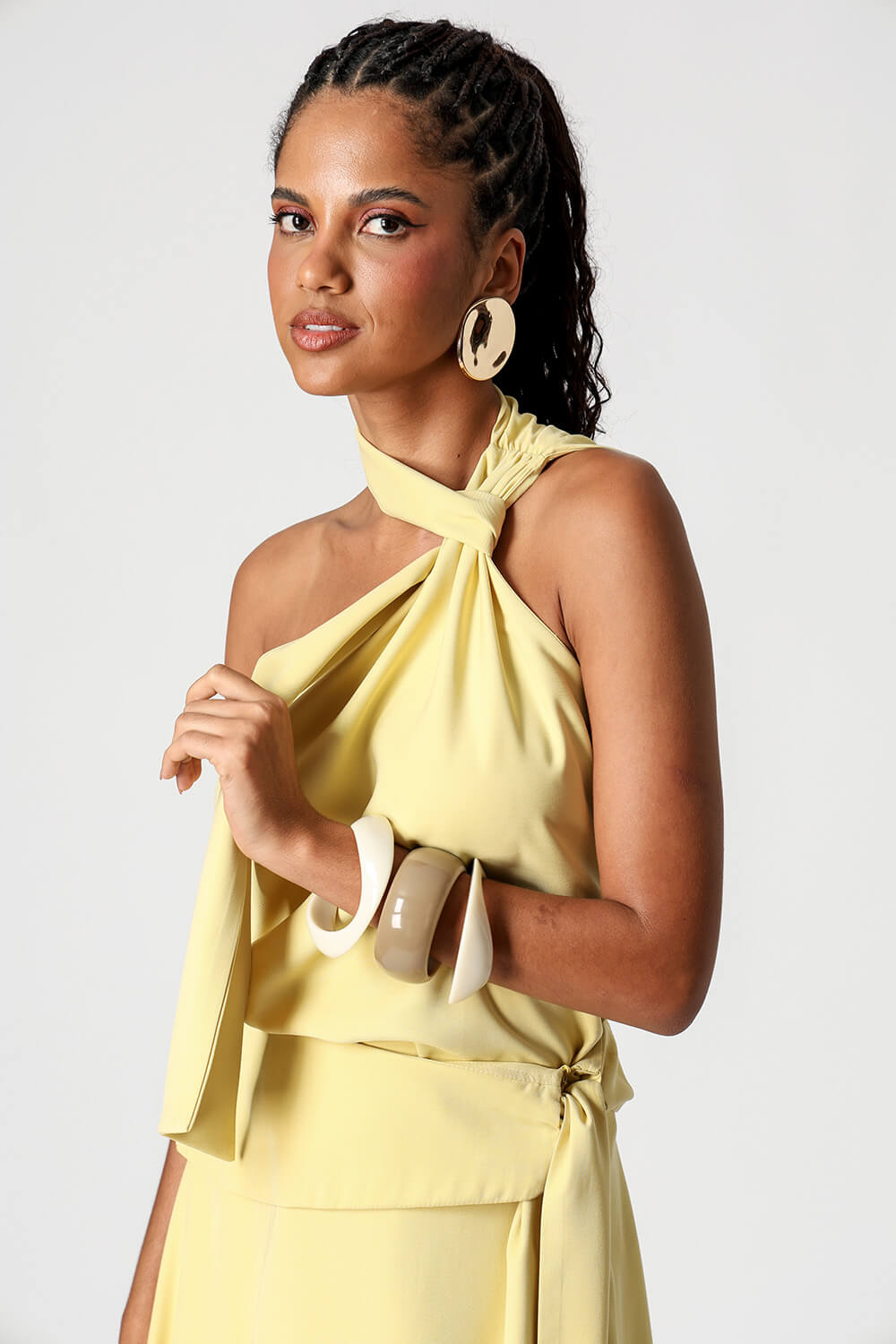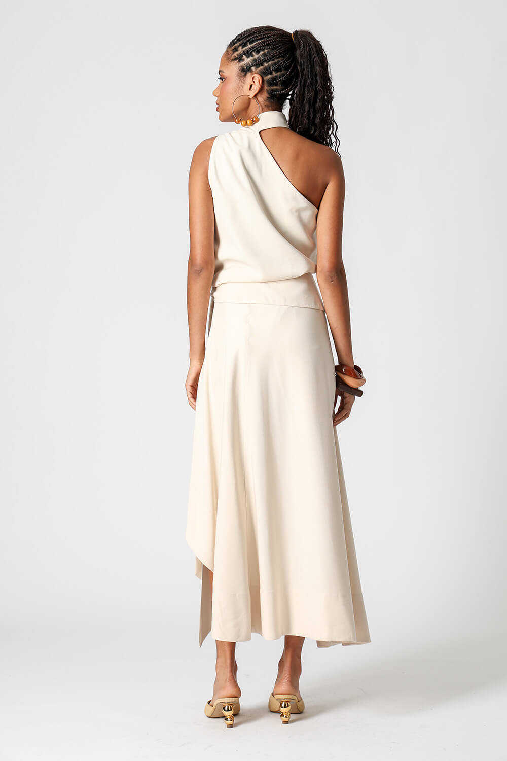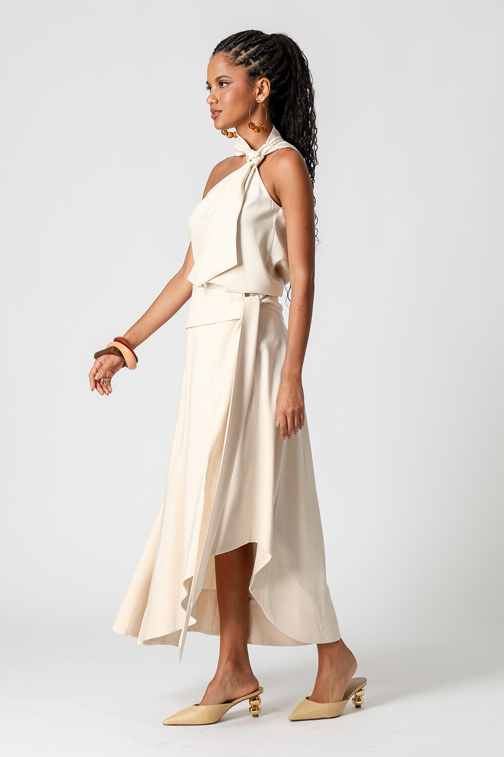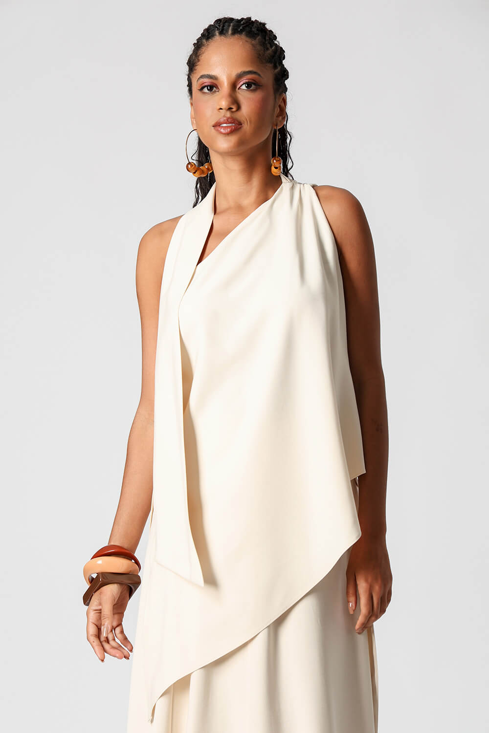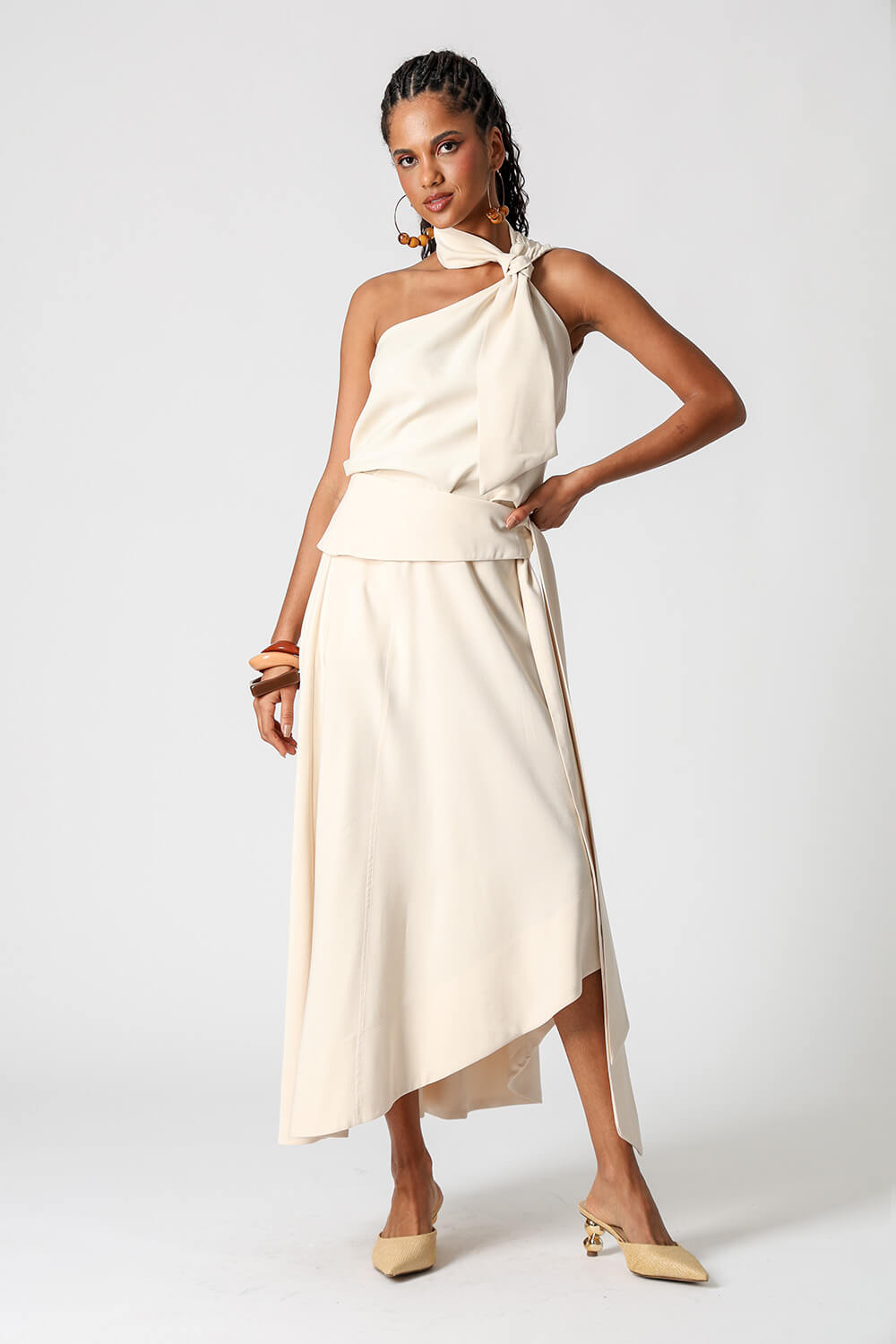 Blusa moderna de ombro único em tecido Tencel, com faixa embutida no pescoço e barra assimétrica com fenda lateral. Leve, elegante e perfeita para looks sofisticados e despojados.