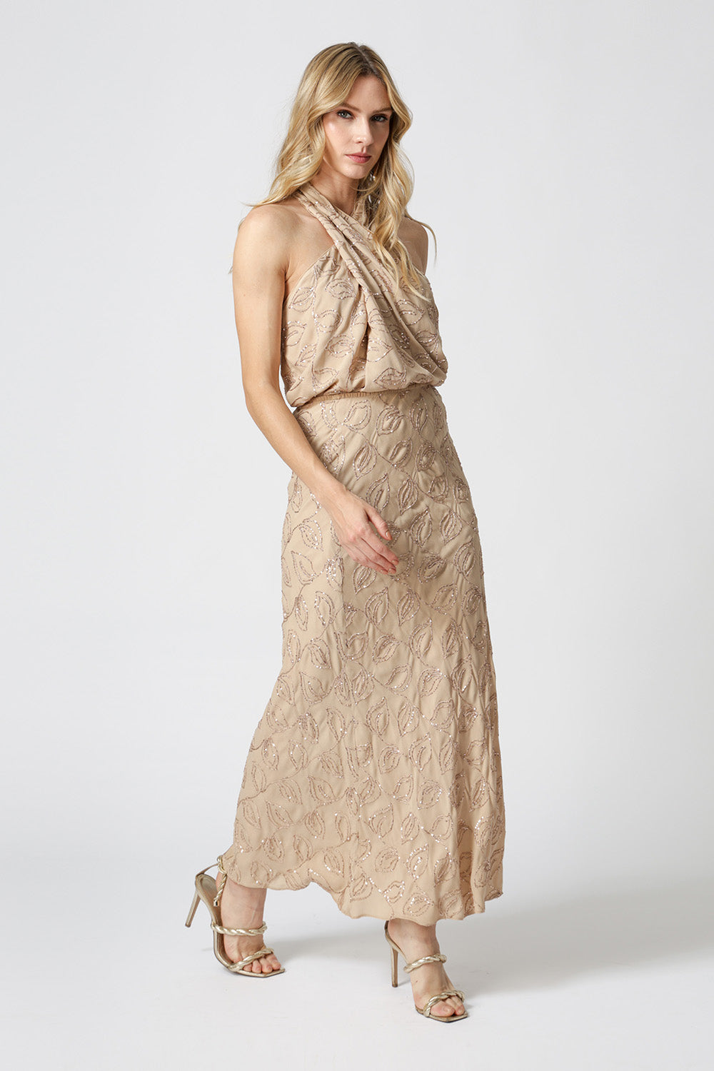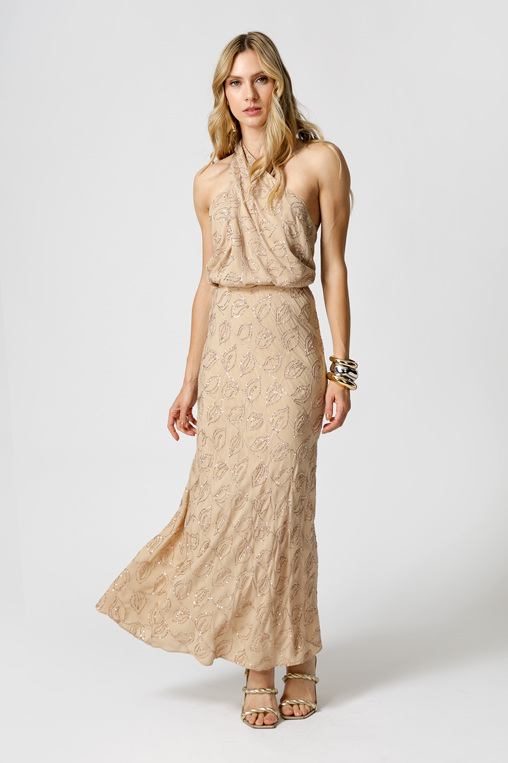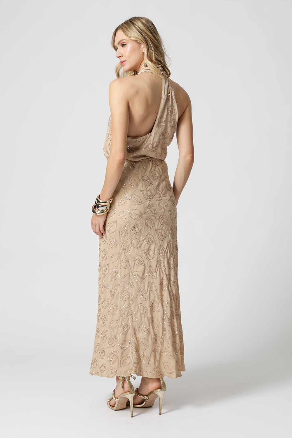 Blusa sofisticada com bordado em paetê de folhas, decote cruzado e costas assimétricas com detalhe único em tecido. Ideal para compor looks elegantes com um toque moderno.