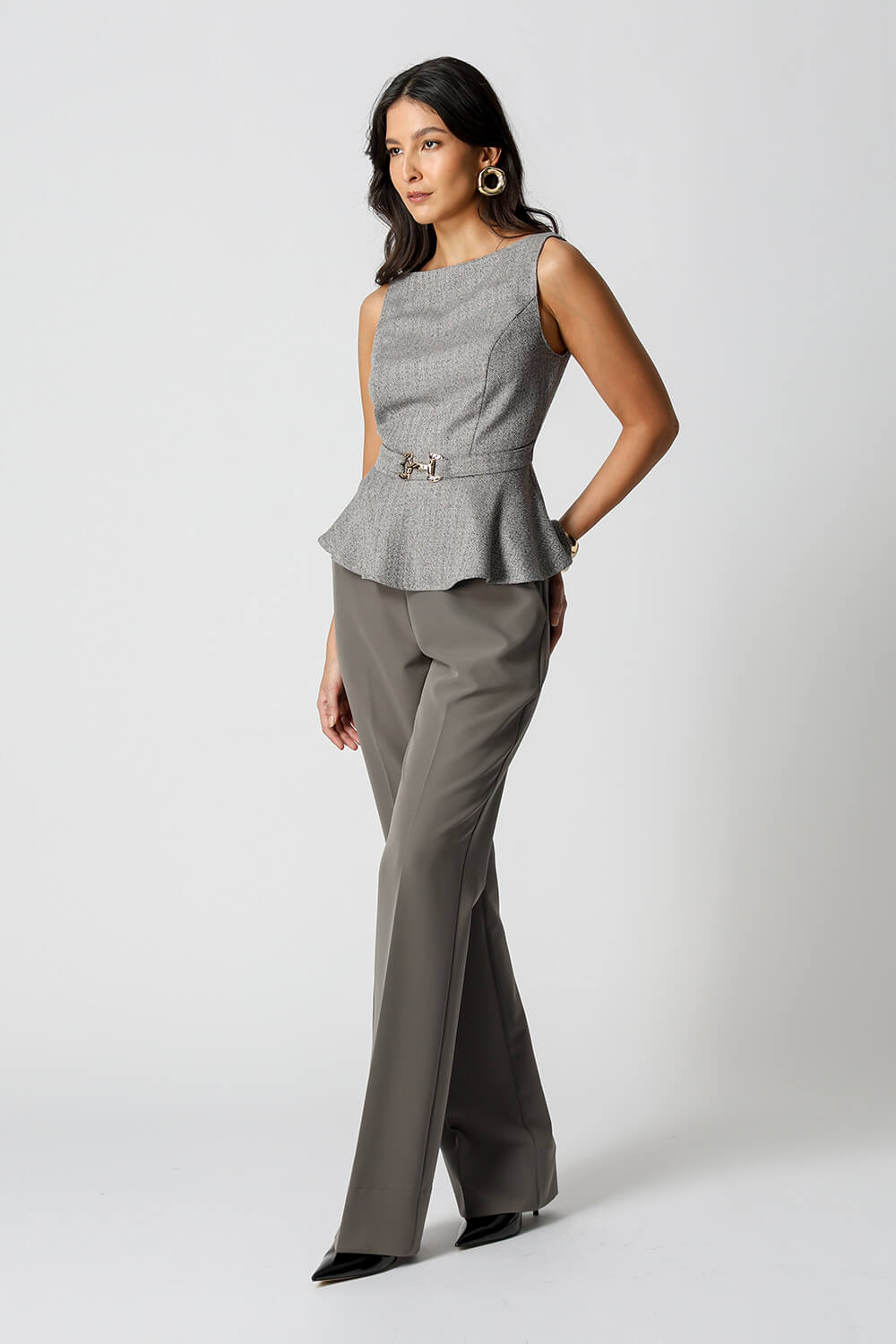 Esta blusa peplum traz um design sofisticado, com cinto embutido na frente e fivela dourada orgânica, que acrescenta um toque de elegância à peça. Confeccionada em tecido jacquard chevron, ela proporciona um caimento estruturado e moderno, ideal para looks casuais ou mais formais.