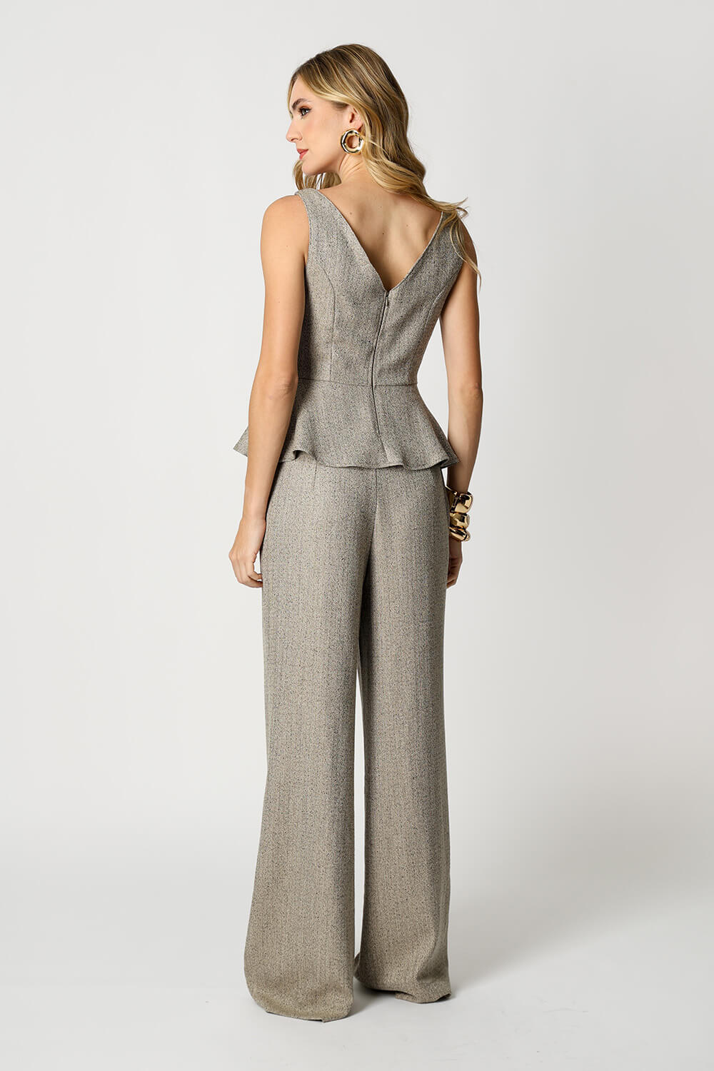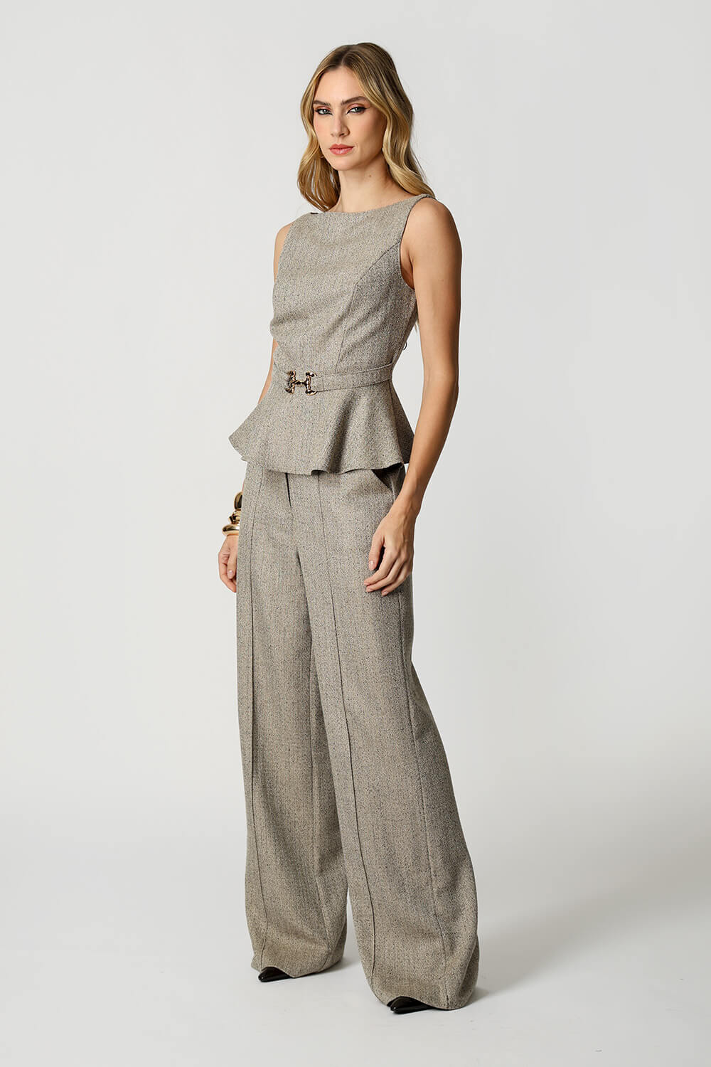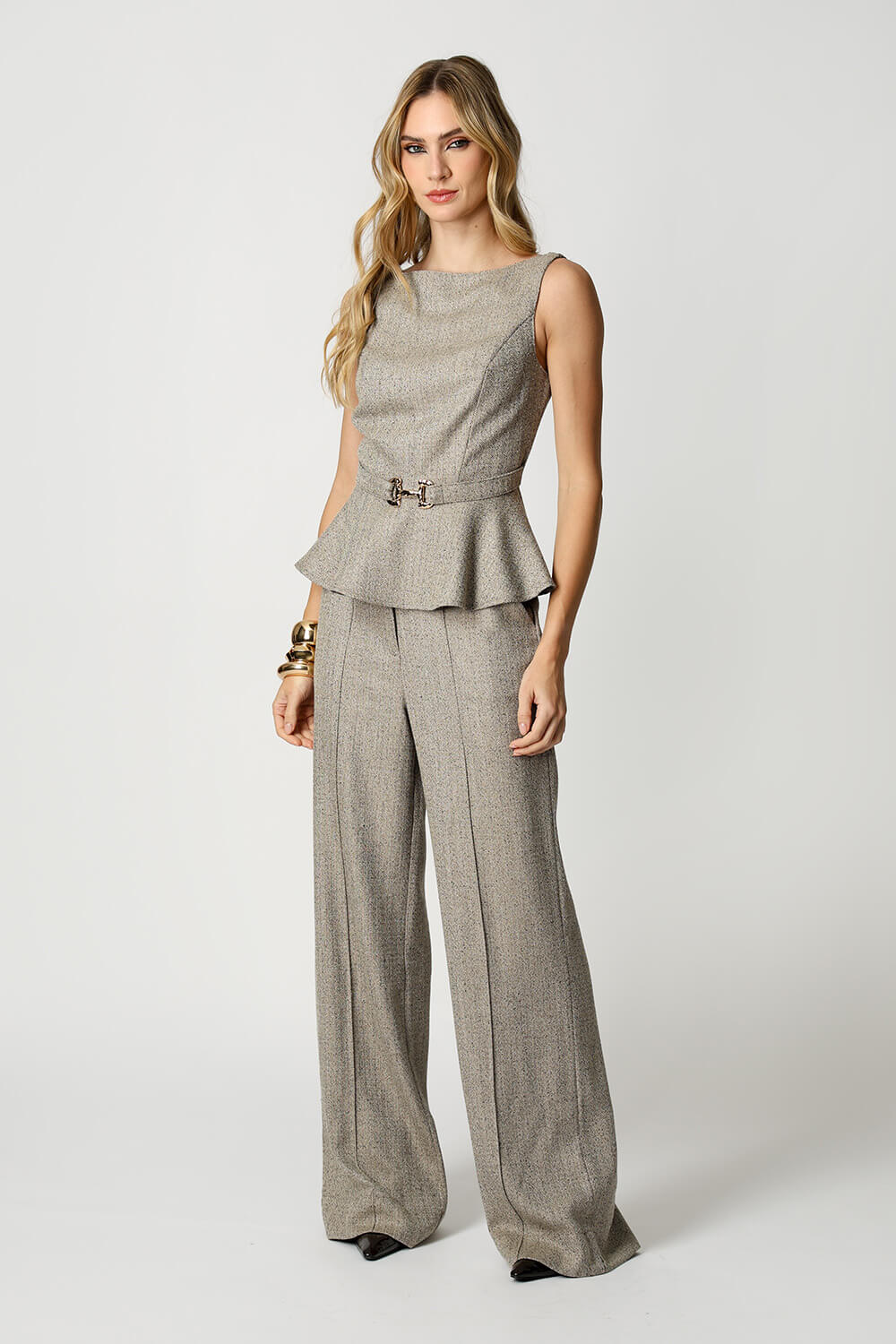 Esta blusa peplum traz um design sofisticado, com cinto embutido na frente e fivela dourada orgânica, que acrescenta um toque de elegância à peça. Confeccionada em tecido jacquard chevron, ela proporciona um caimento estruturado e moderno, ideal para looks casuais ou mais formais.