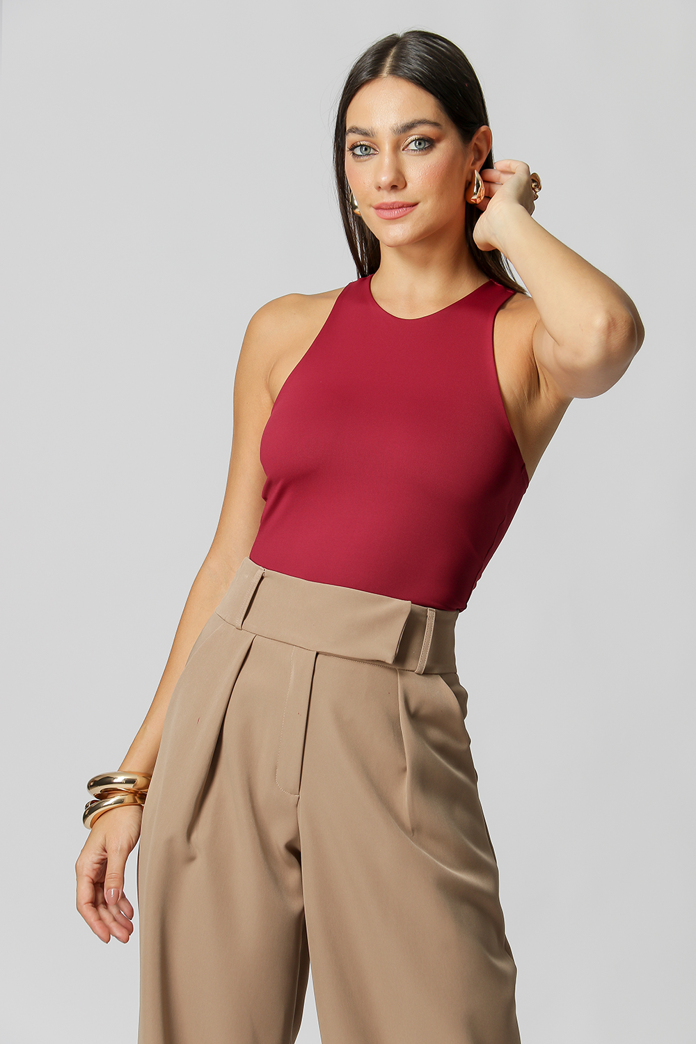 Blusa regata de malha basica. Com detalhe plaquinha de metal nas costas. Perfeita para combinar com looks casuais.