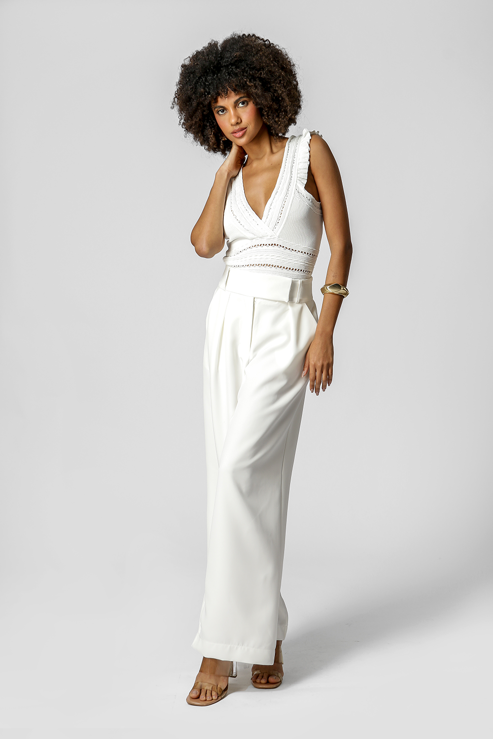 Blusa de retilínea confeccionada com fios de Poliaminda e Viscose. Com decote V que valoriza o colo, com shape que delineia o corpo e um delicado babado na alça para dar um charme á peça. É uma peça versátil para diversas opções de looks para o dia a dia.