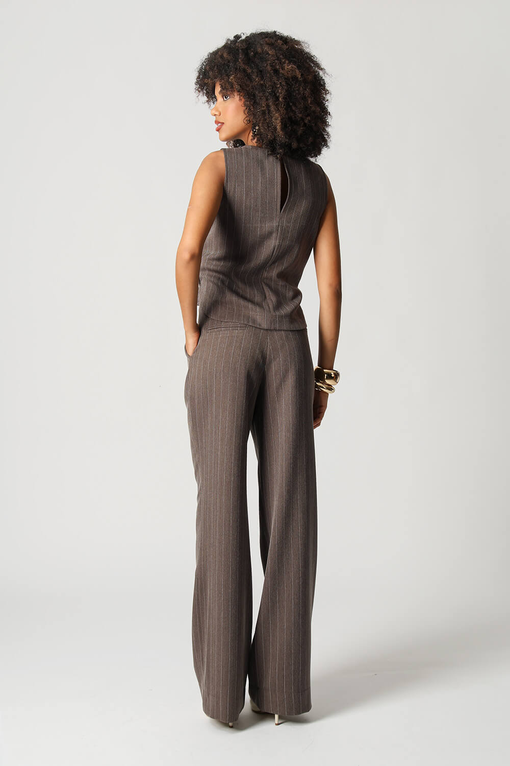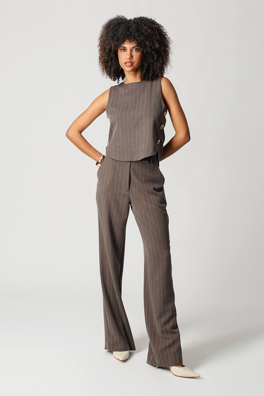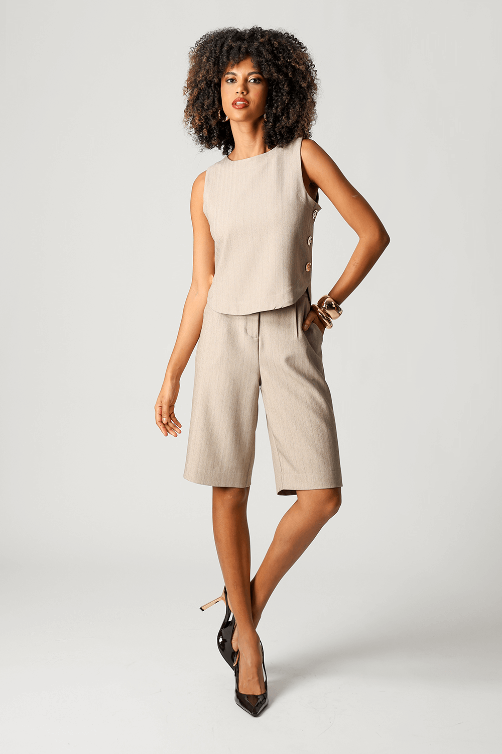 Com design minimalista e elegante, a blusa traz barra arredondada e fechamento lateral com botões, que adicionam um charme moderno à peça. A modelagem levemente estruturada valoriza a silhueta e garante versatilidade para composições casuais ou mais sofisticadas.