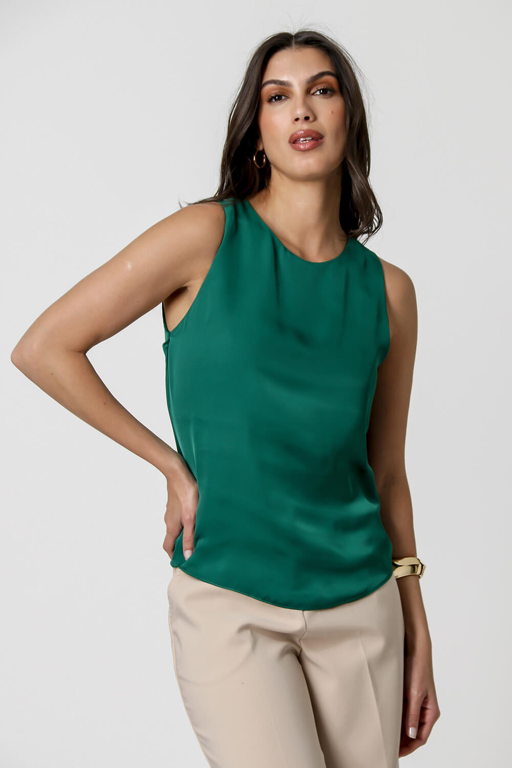 Blusa sem manga com botão de metal na parte posterior. Um modelo confeccionado em tecido de Cetim. Essa é uma peça coringa por ser prática, confortável e que pode montar diversos looks, uma peça essencial em seu guarda-roupa.