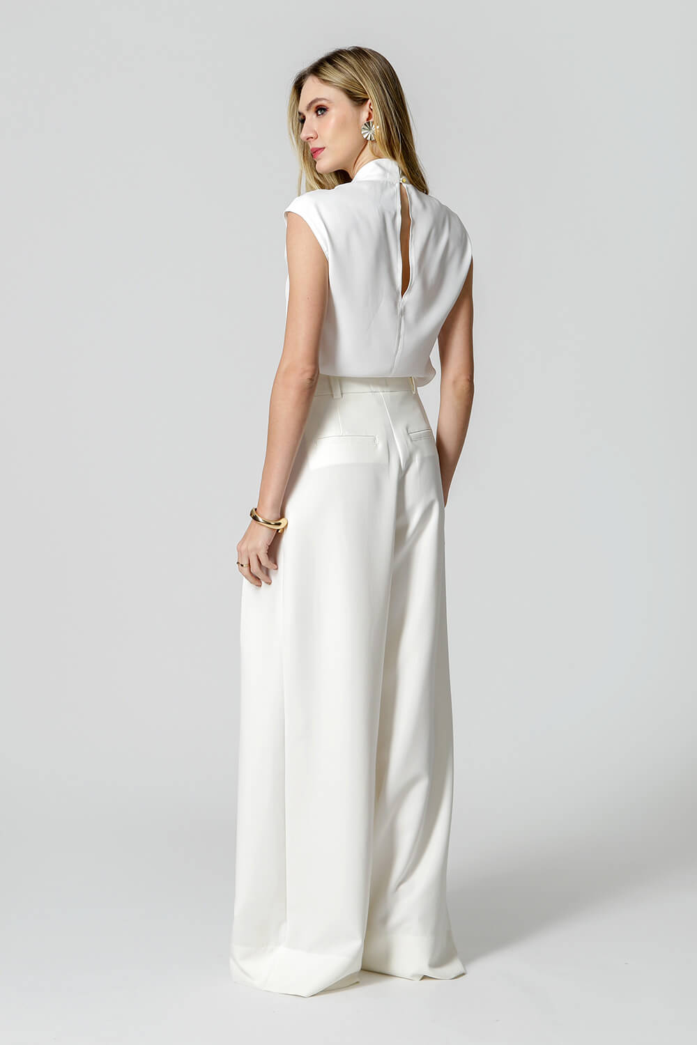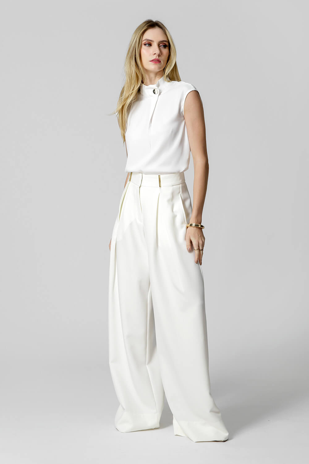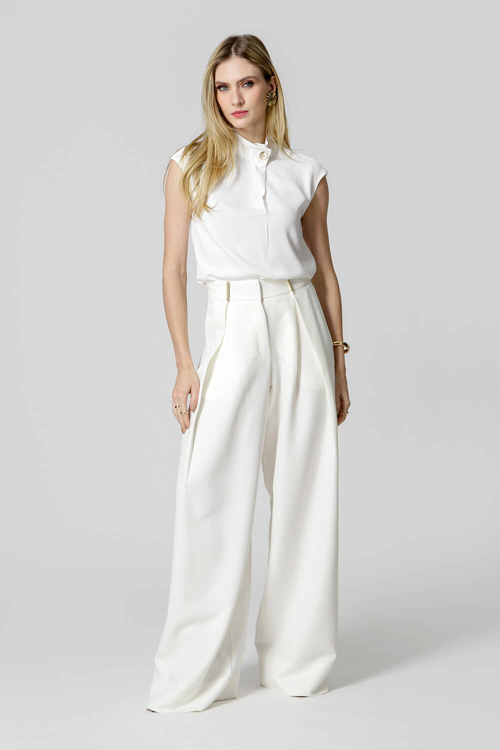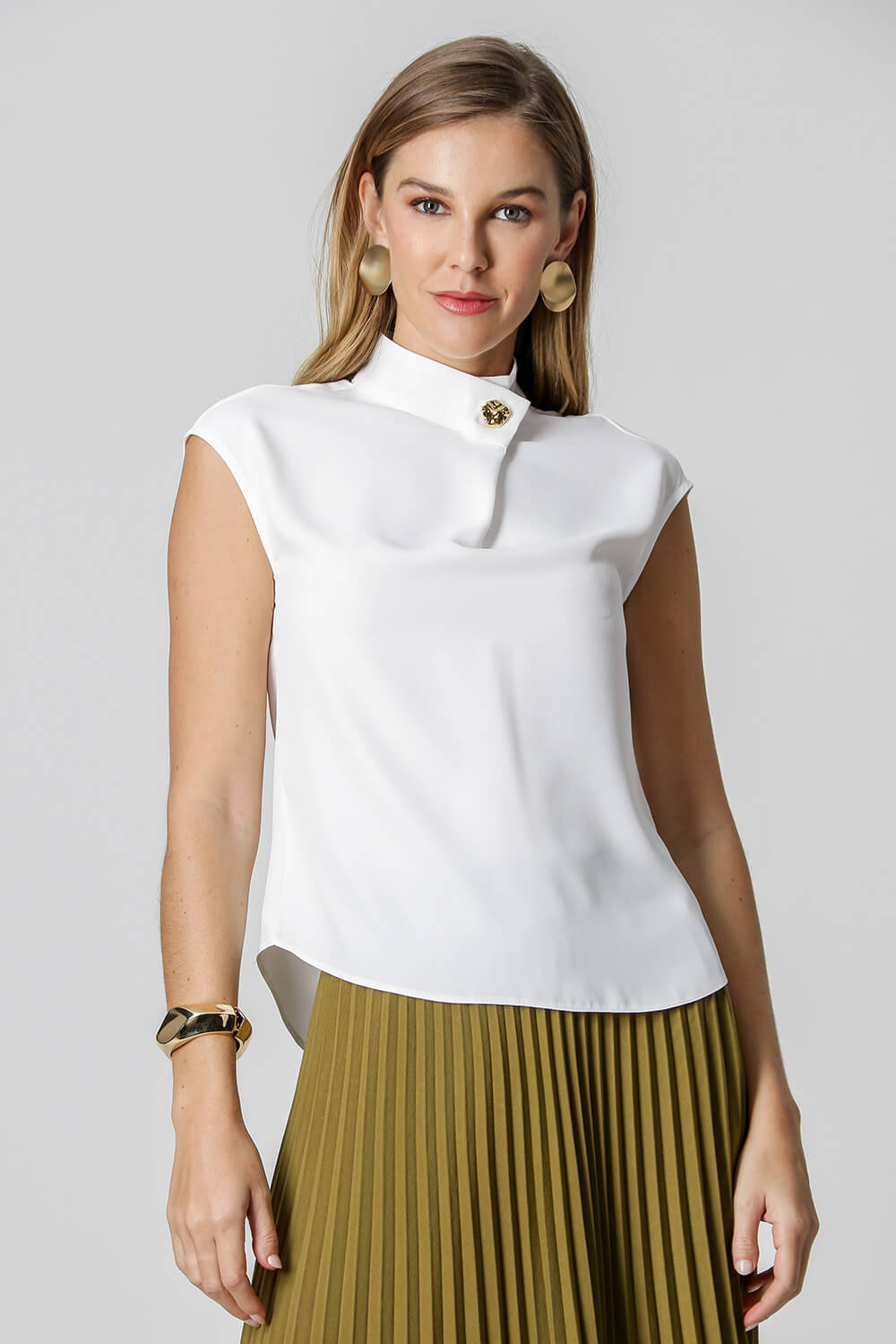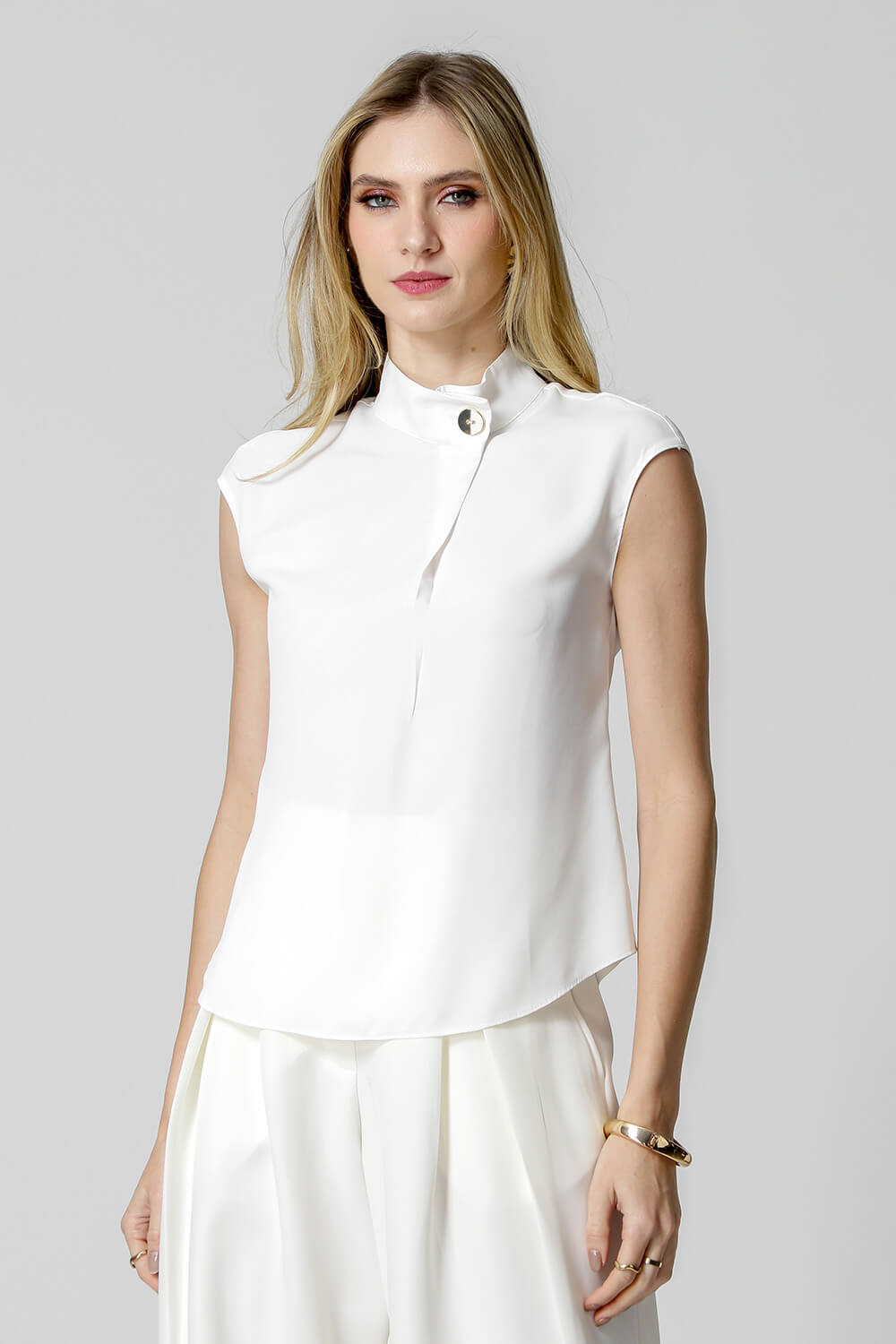 Blusa sem manga com gola transpassada e detalhe de botão metal texturizado na parte da frente. Uma peça confeccionada em tecido crepe fluído com caimento perfeito trazendo conforto em seus looks.