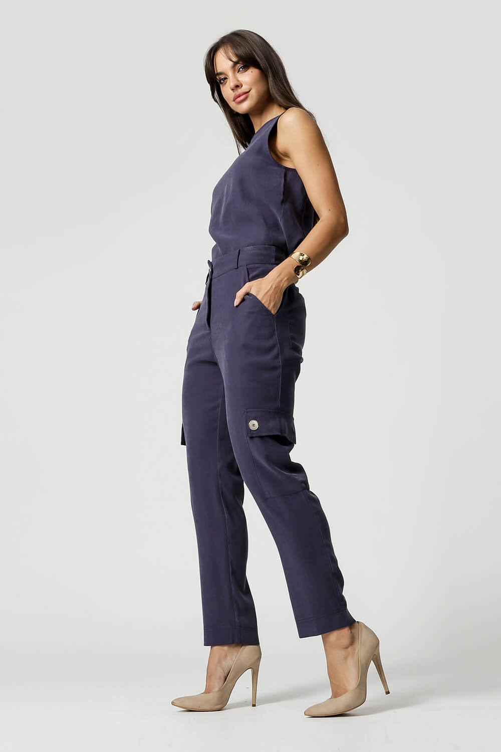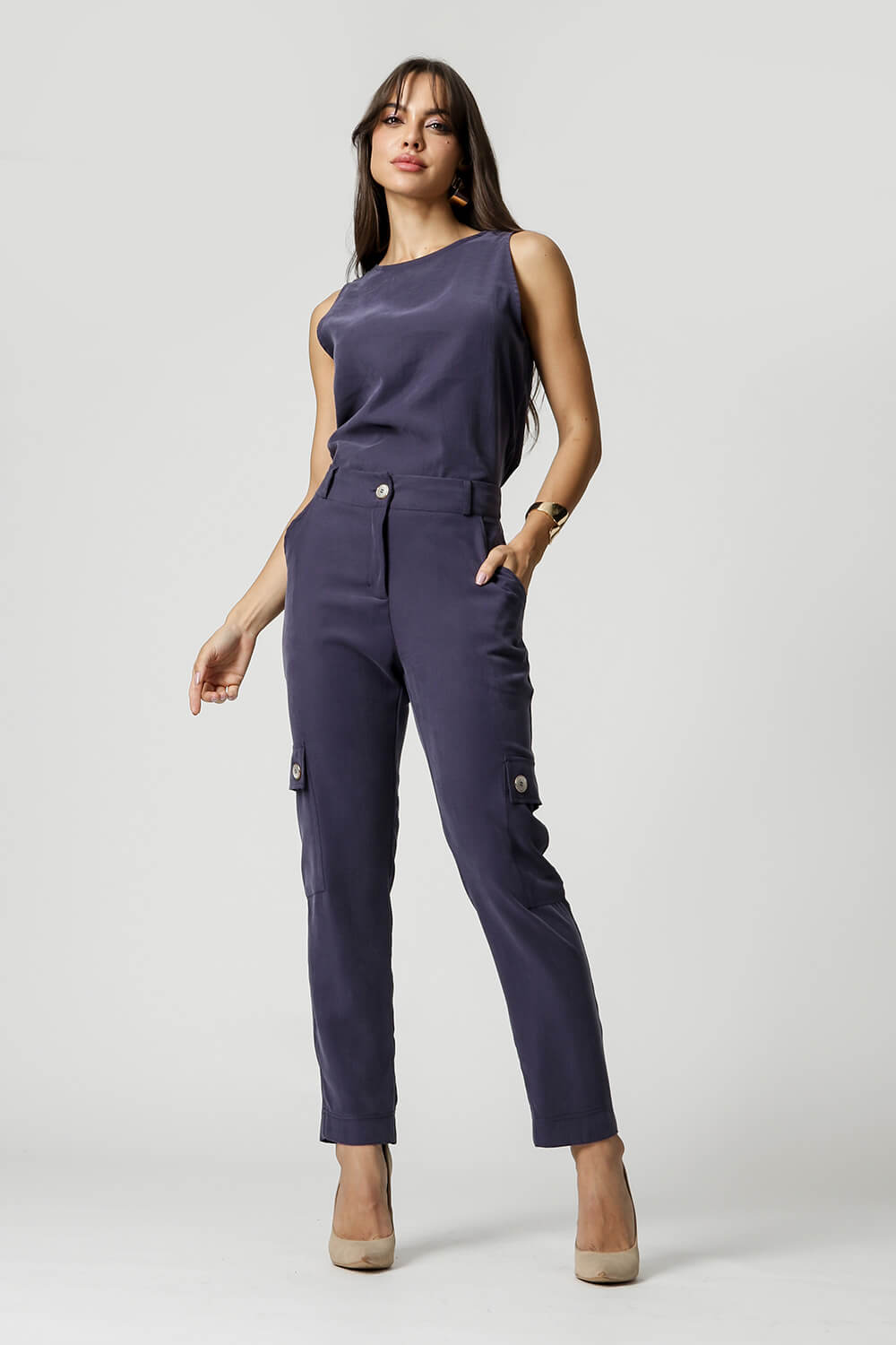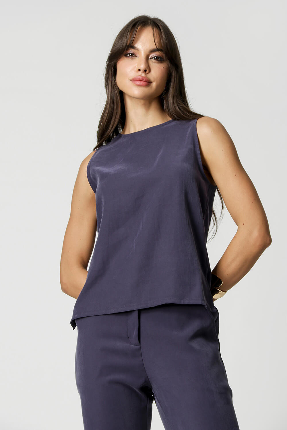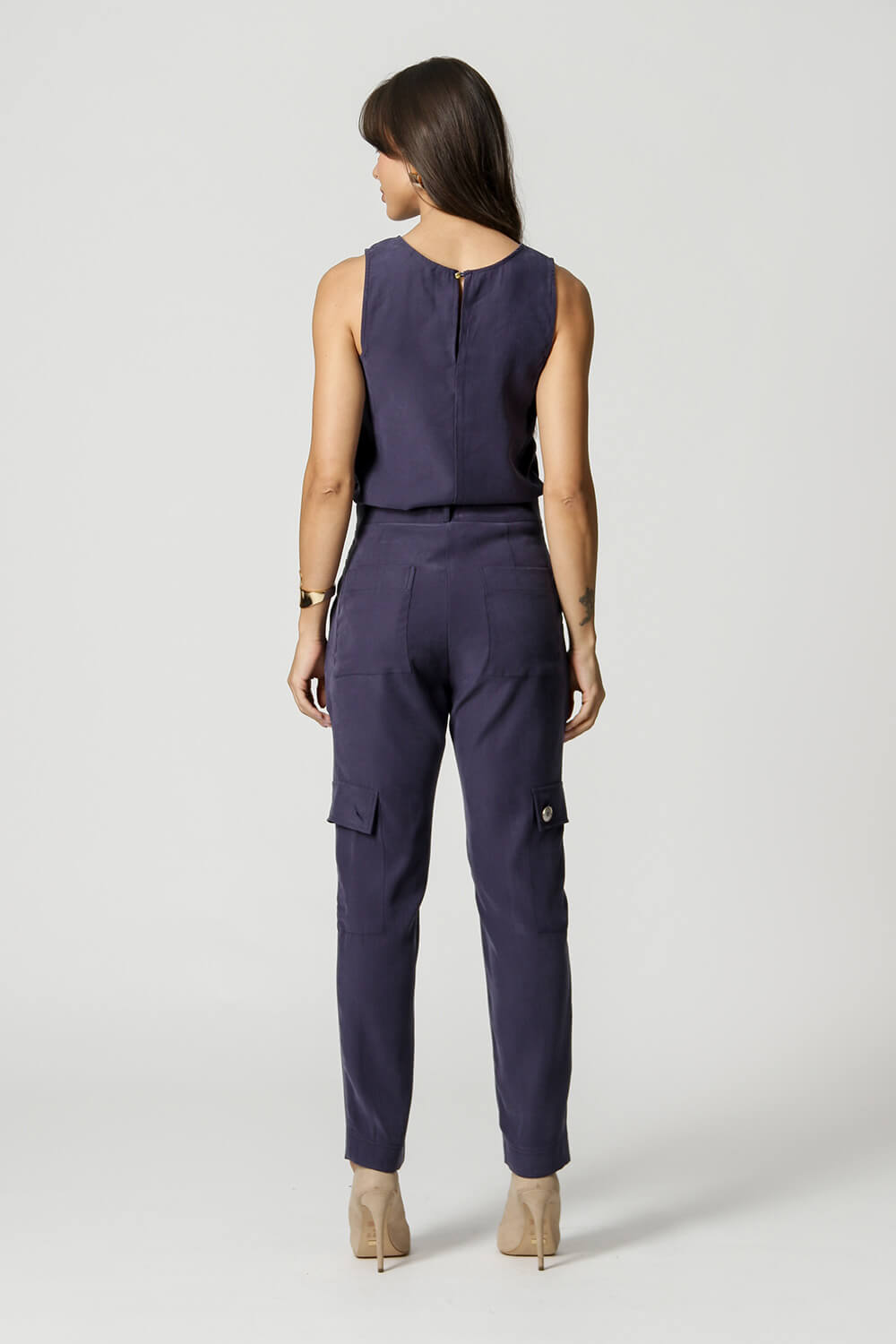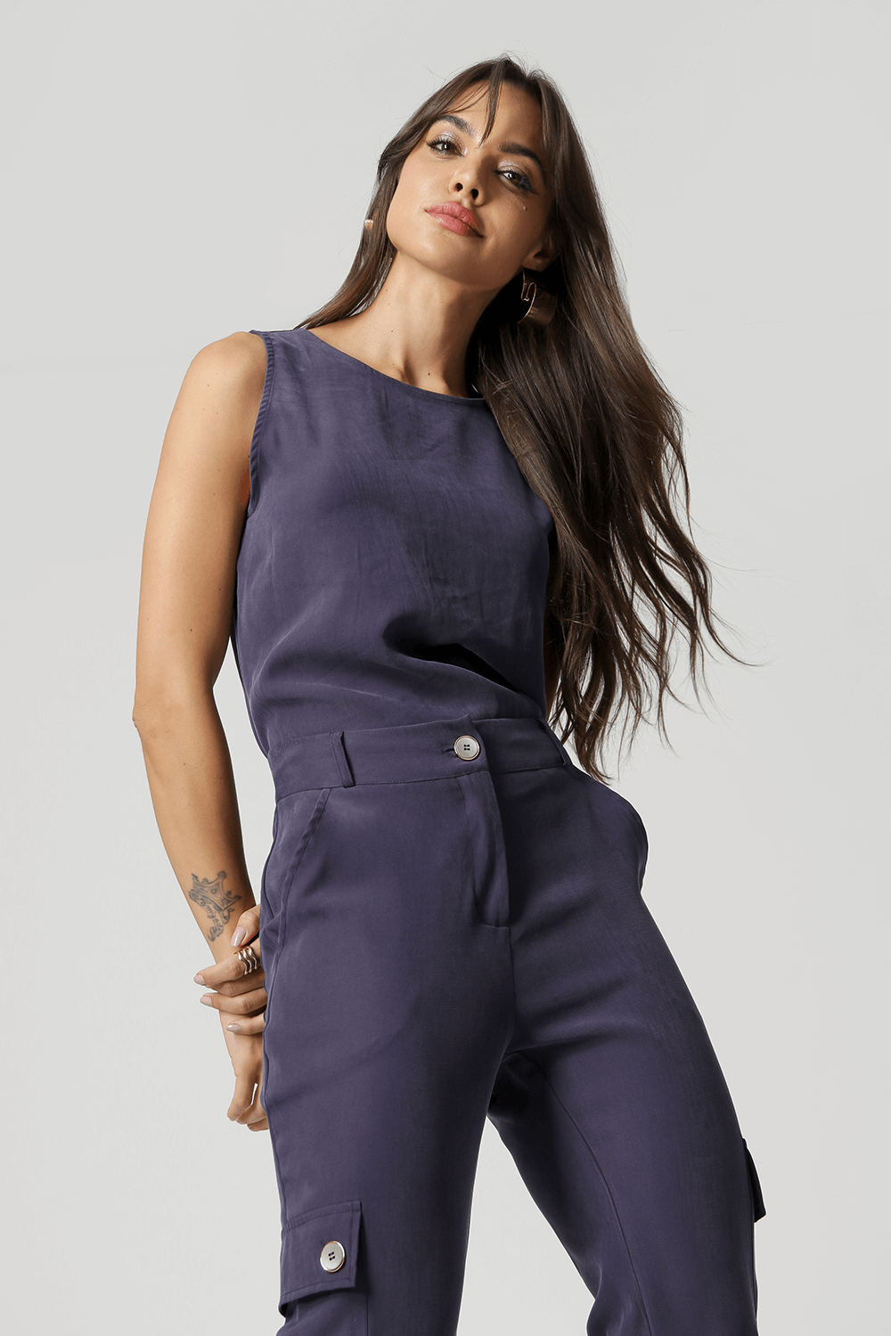 Blusa sem manga com botão atrás. Um modelo confeccionado em tecido Tencel. Uma peça perfeita para usar no dia-a-dia por ser bem confortável.