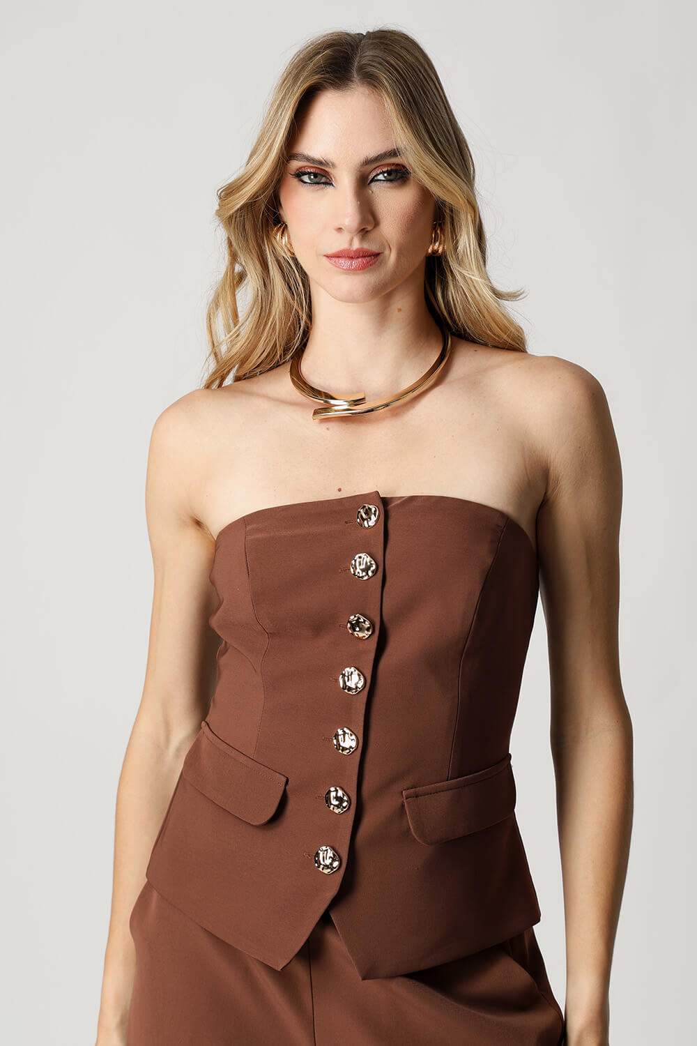 Blusa strapless com botões dourados é uma peça super elegante e sofisticada. Esse modelo traz um toque clássico, mas com um visual moderno.