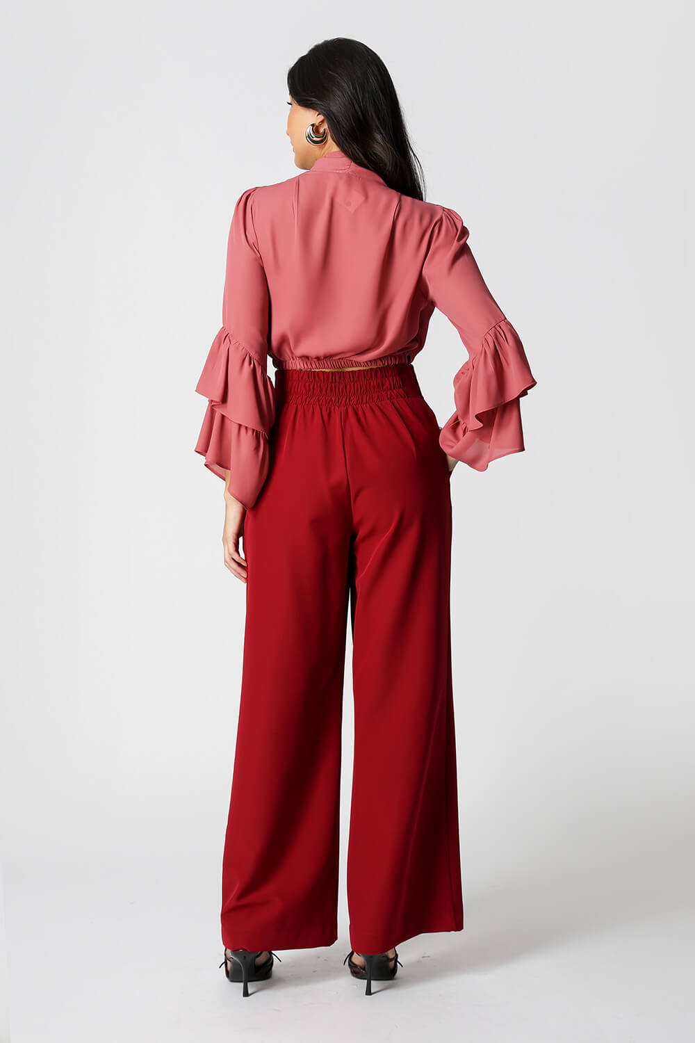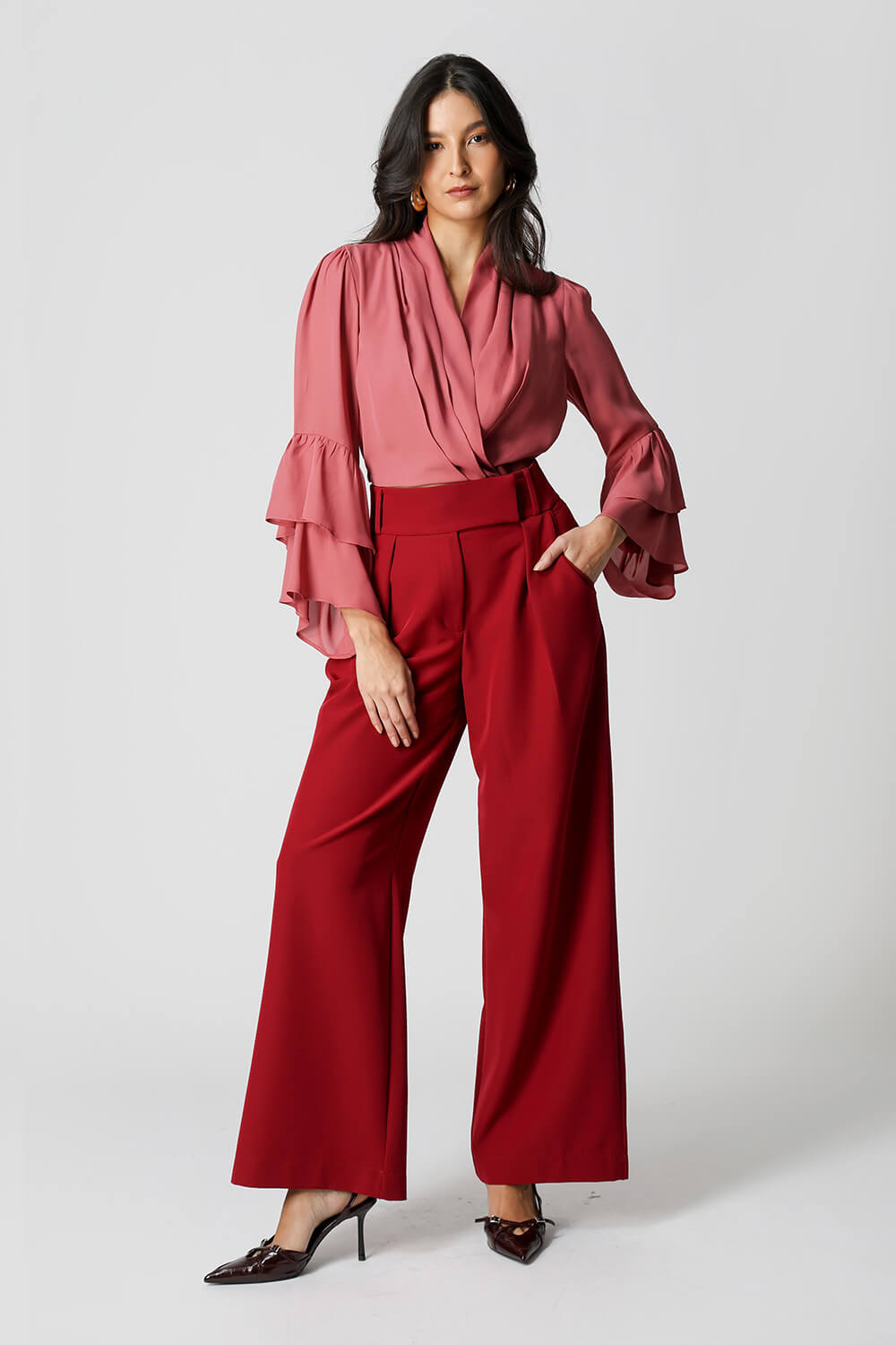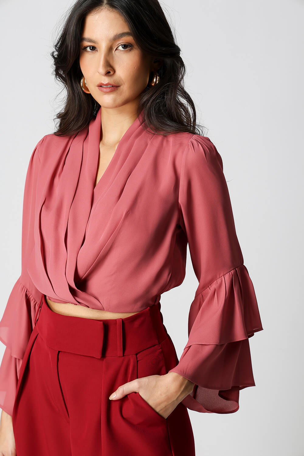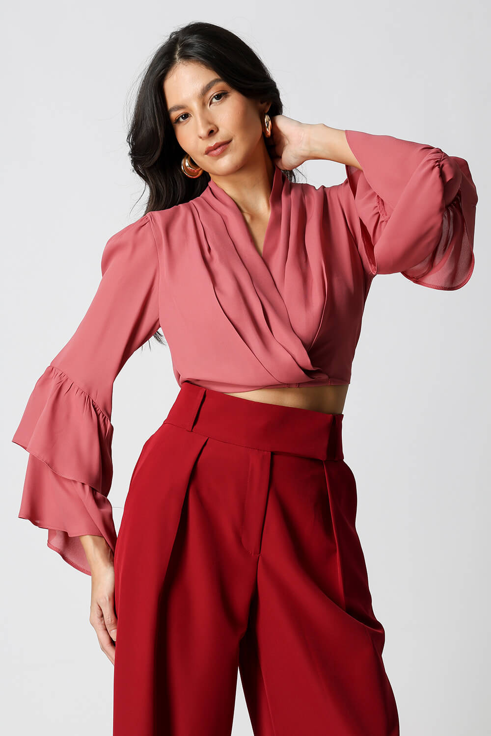 Blusa feminina em crepe leve, com modelagem transpassada na frente, manga longa com dois babados e elástico na barra para ajuste perfeito. Ideal para compor looks elegantes e confortáveis.