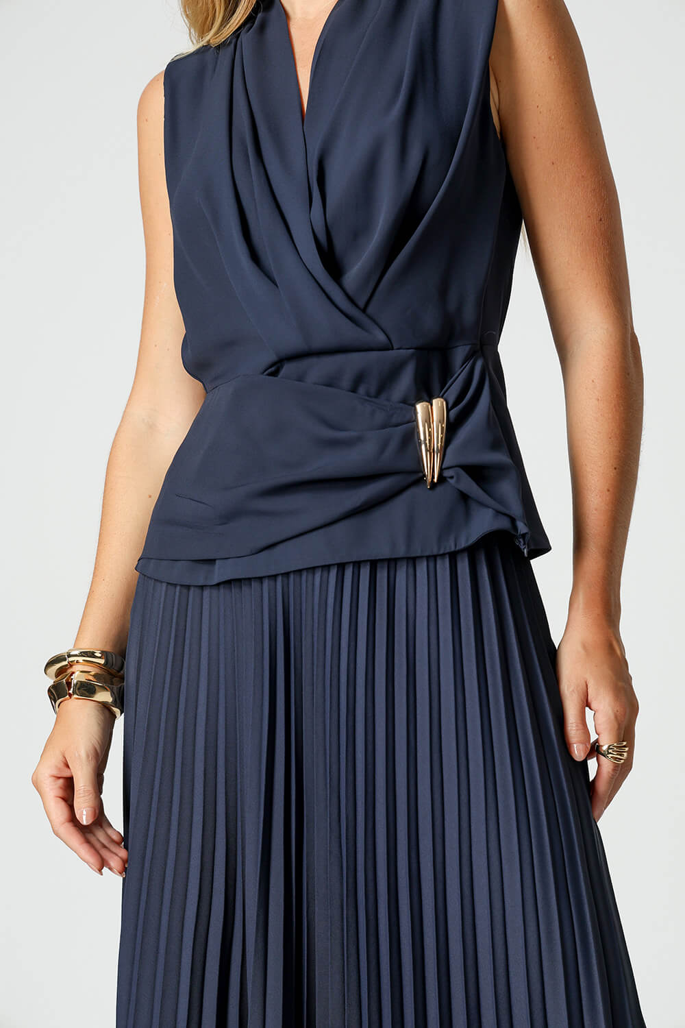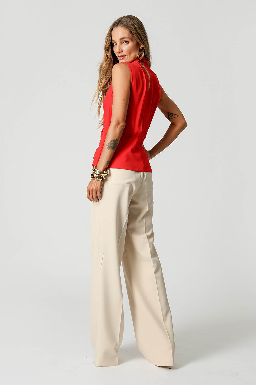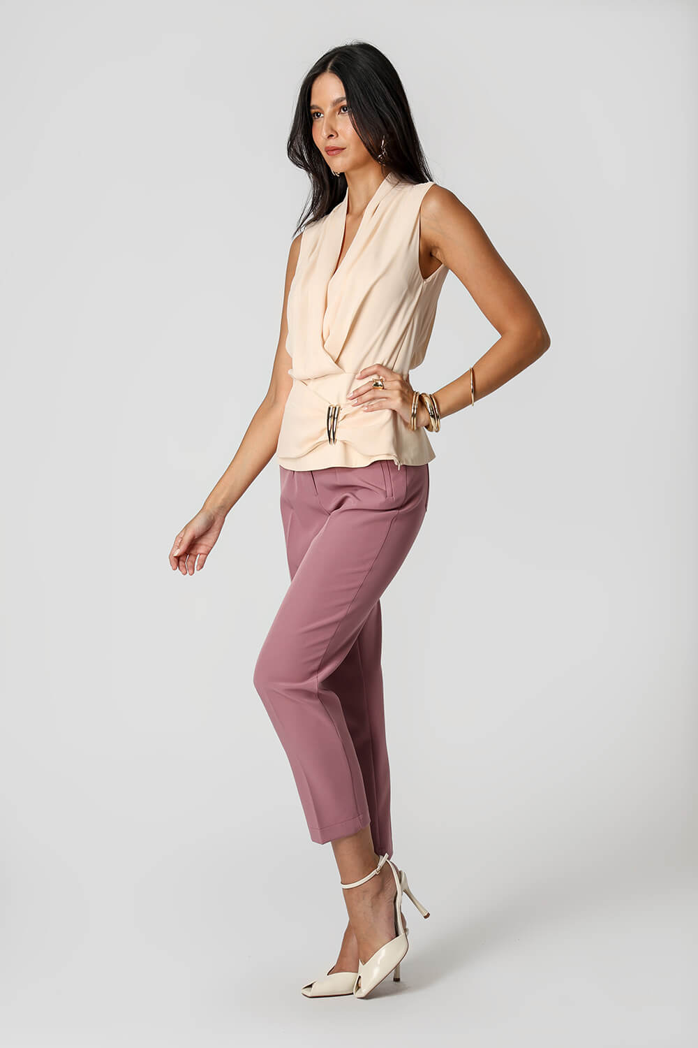 Blusa feminina em crepe fluido, modelagem de frente transpassada com pala e detalhe franzido ajustado por duas fivelas metálicas. Elegante, leve e perfeita para compor looks modernos com toque sofisticado.