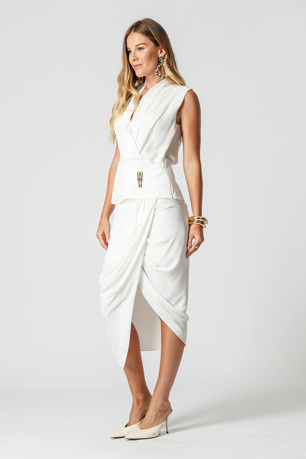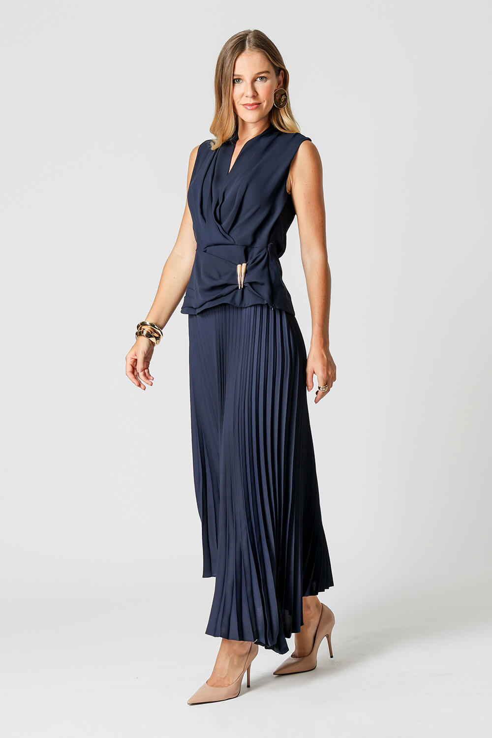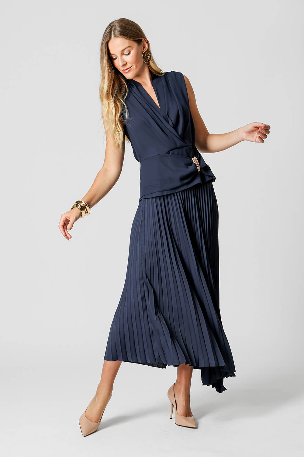 Blusa feminina em crepe fluido, modelagem de frente transpassada com pala e detalhe franzido ajustado por duas fivelas metálicas. Elegante, leve e perfeita para compor looks modernos com toque sofisticado.