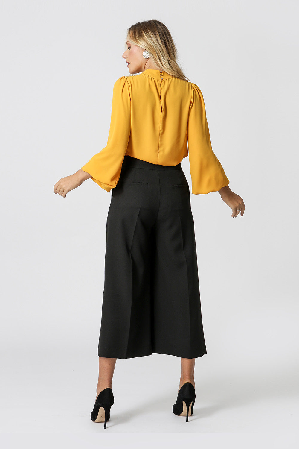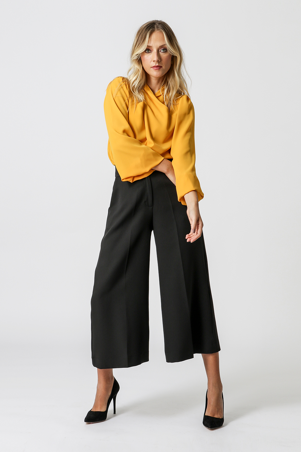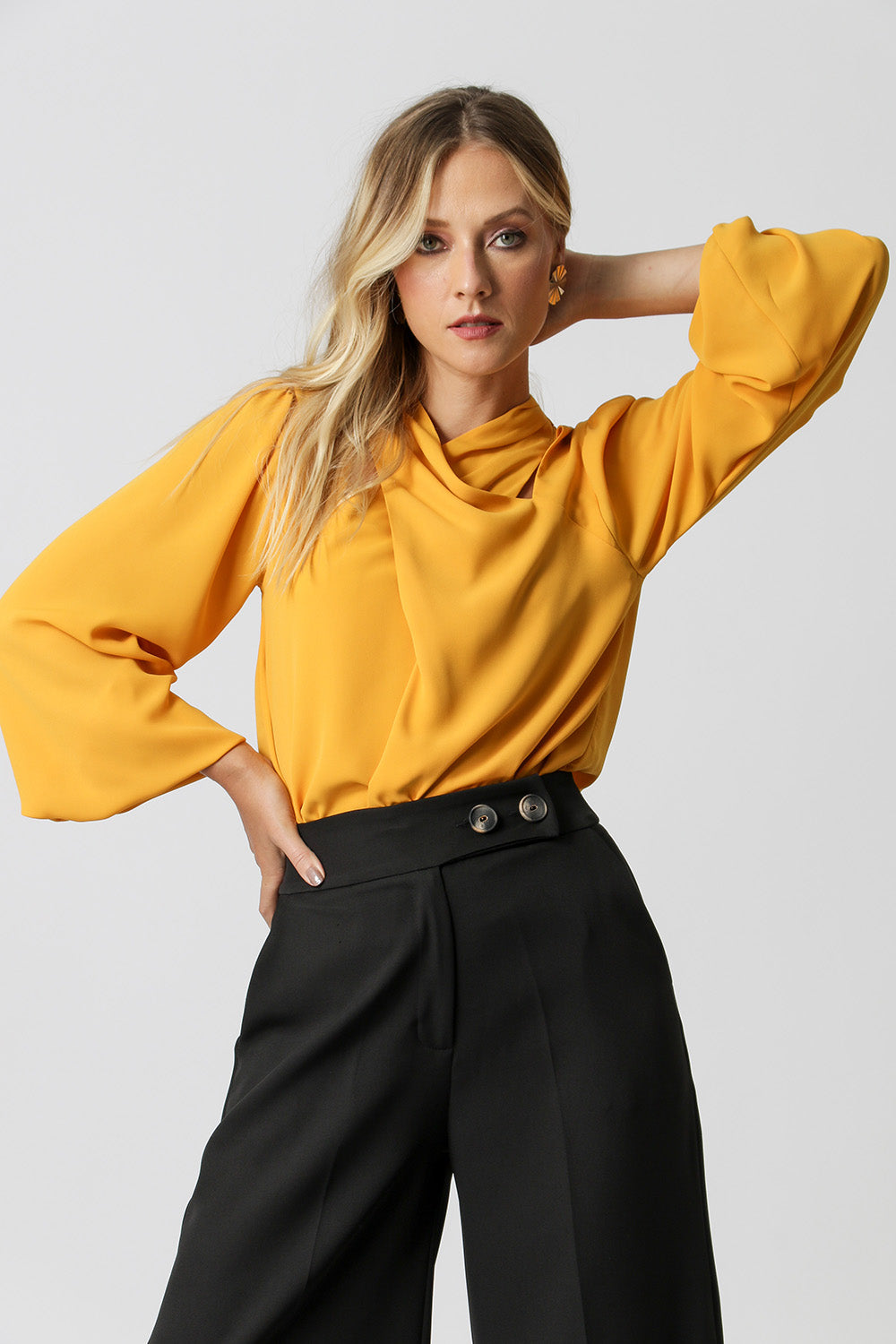 Blusa manga longa, feita em crepe fluído. Com detalhe de decote transpassado e fecho nas costas. Ideal para looks atemporais e clássicos.