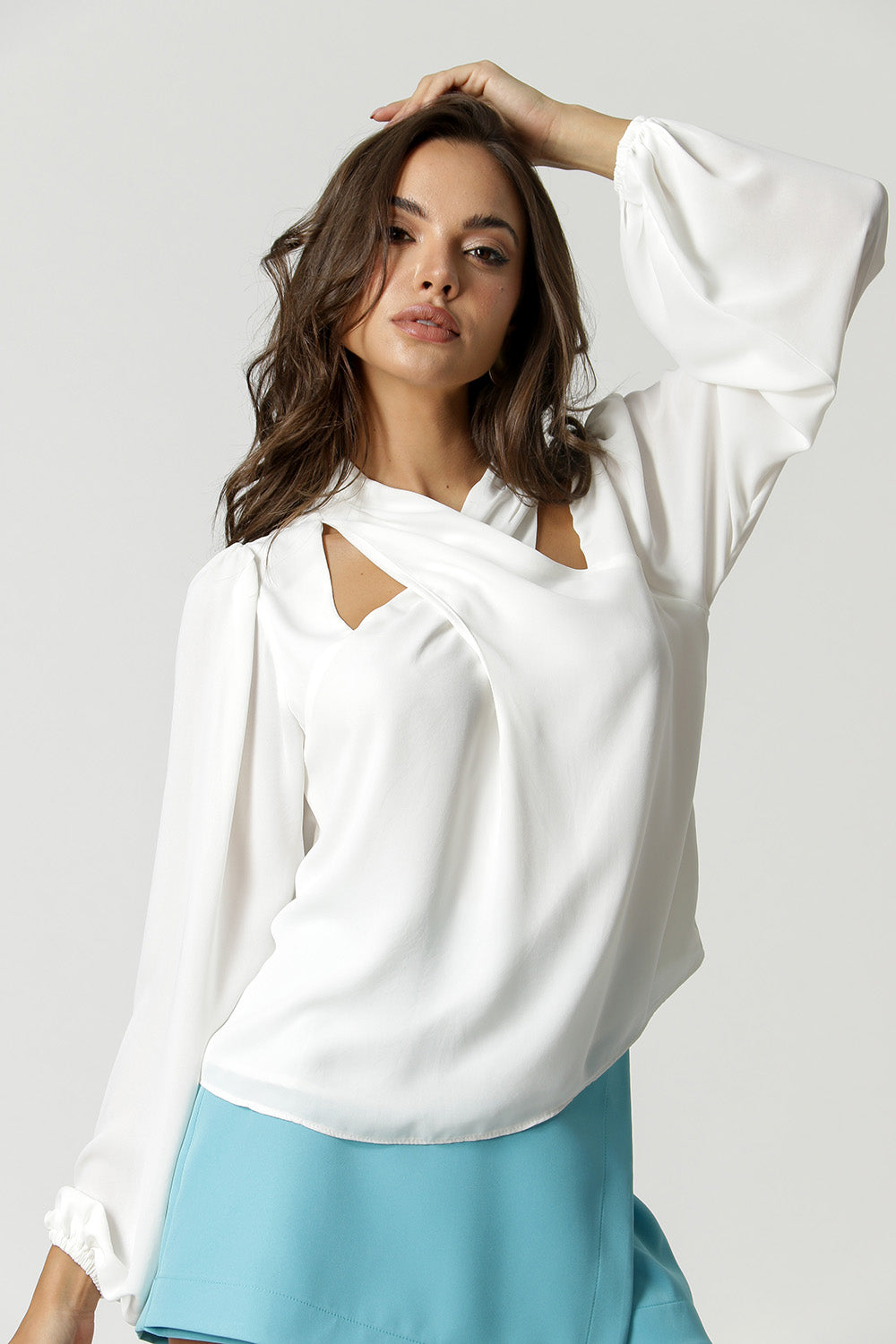 Blusa manga longa, feita em crepe fluído. Com detalhe de decote transpassado e fecho nas costas. Ideal para looks atemporais e clássicos.