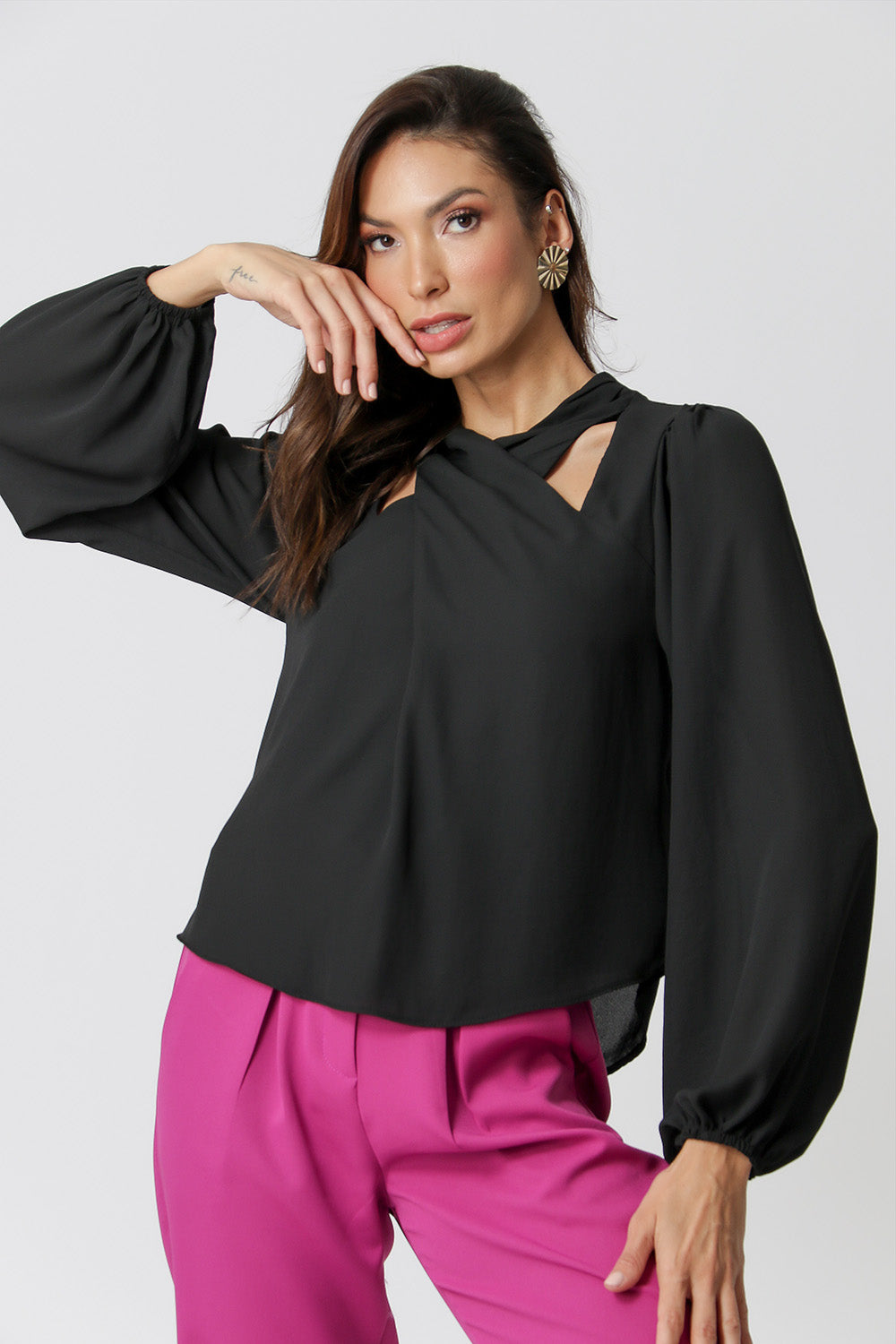 Blusa manga longa, feita em crepe fluído. Com detalhe de decote transpassado e fecho nas costas. Ideal para looks atemporais e clássicos.