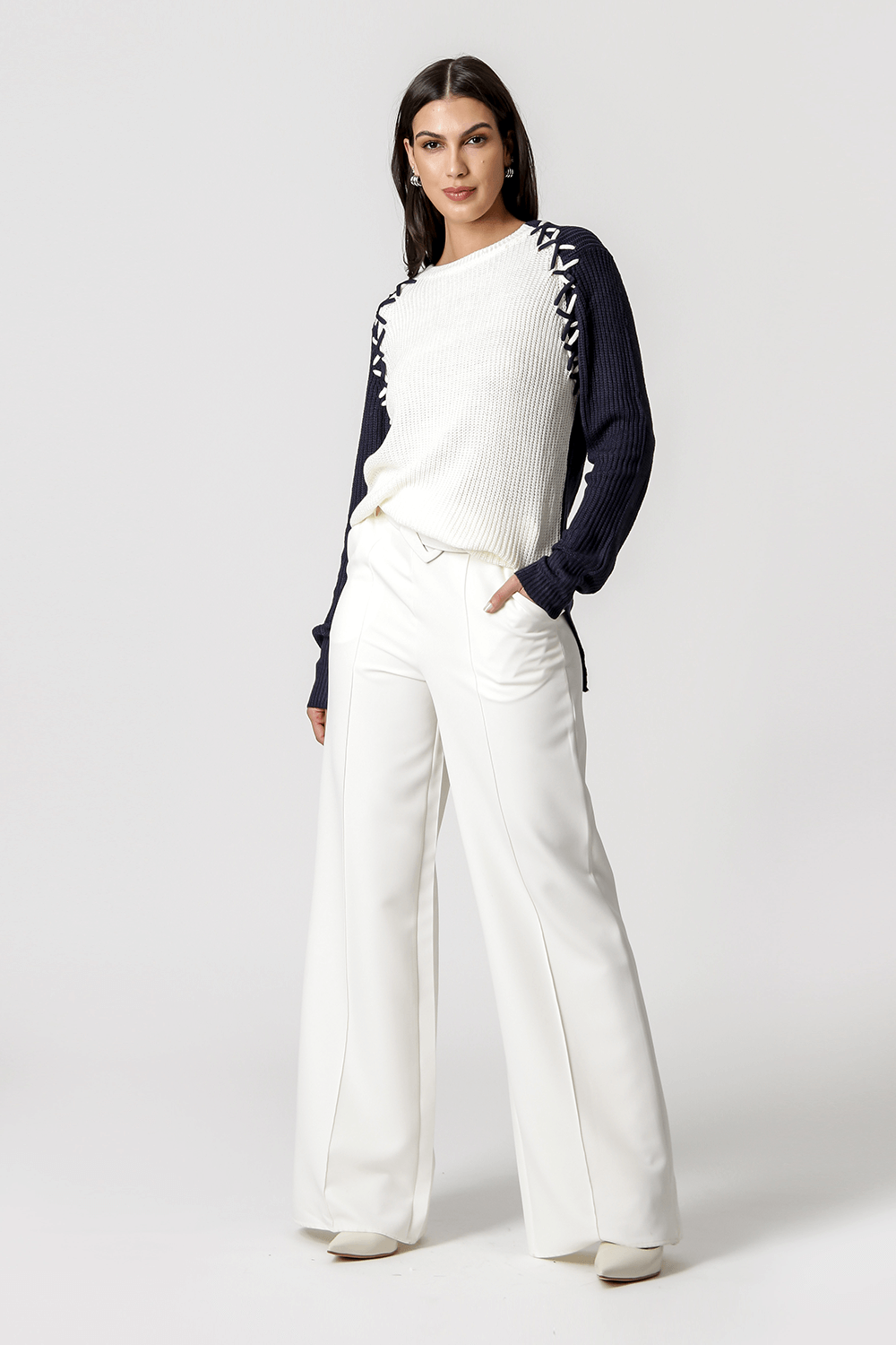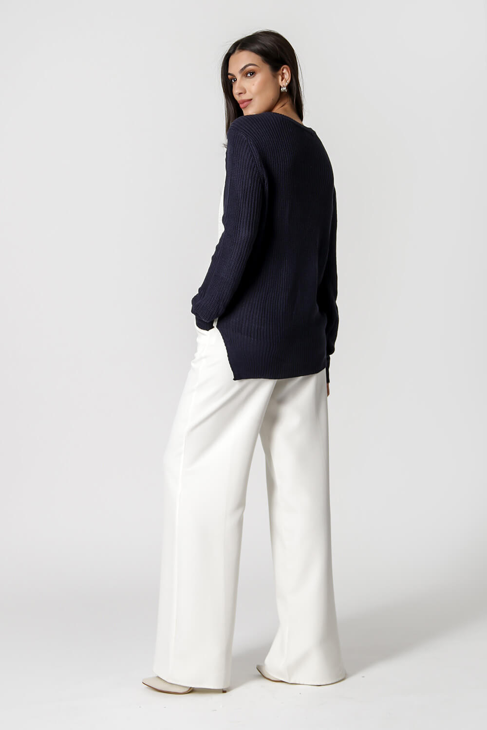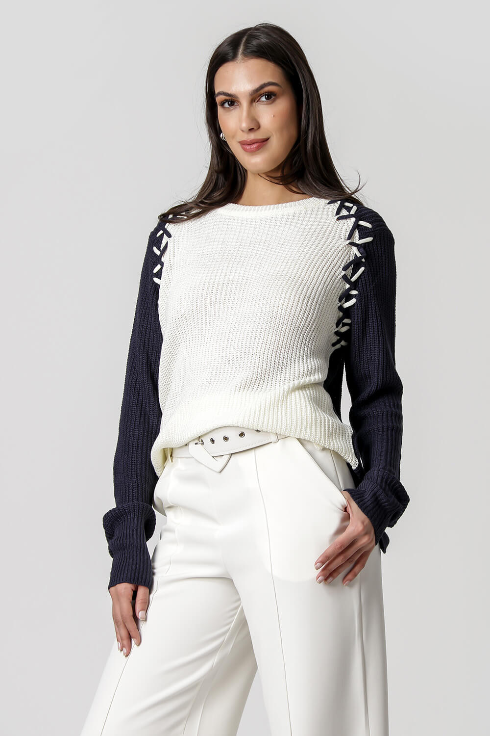 Blusa de tricot com manga longa. Possui detalhe trançado na parte superior das mangas e shape mais alongado. Perfeita para dias frios.