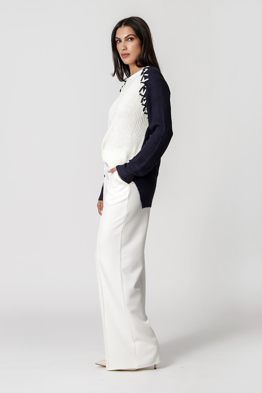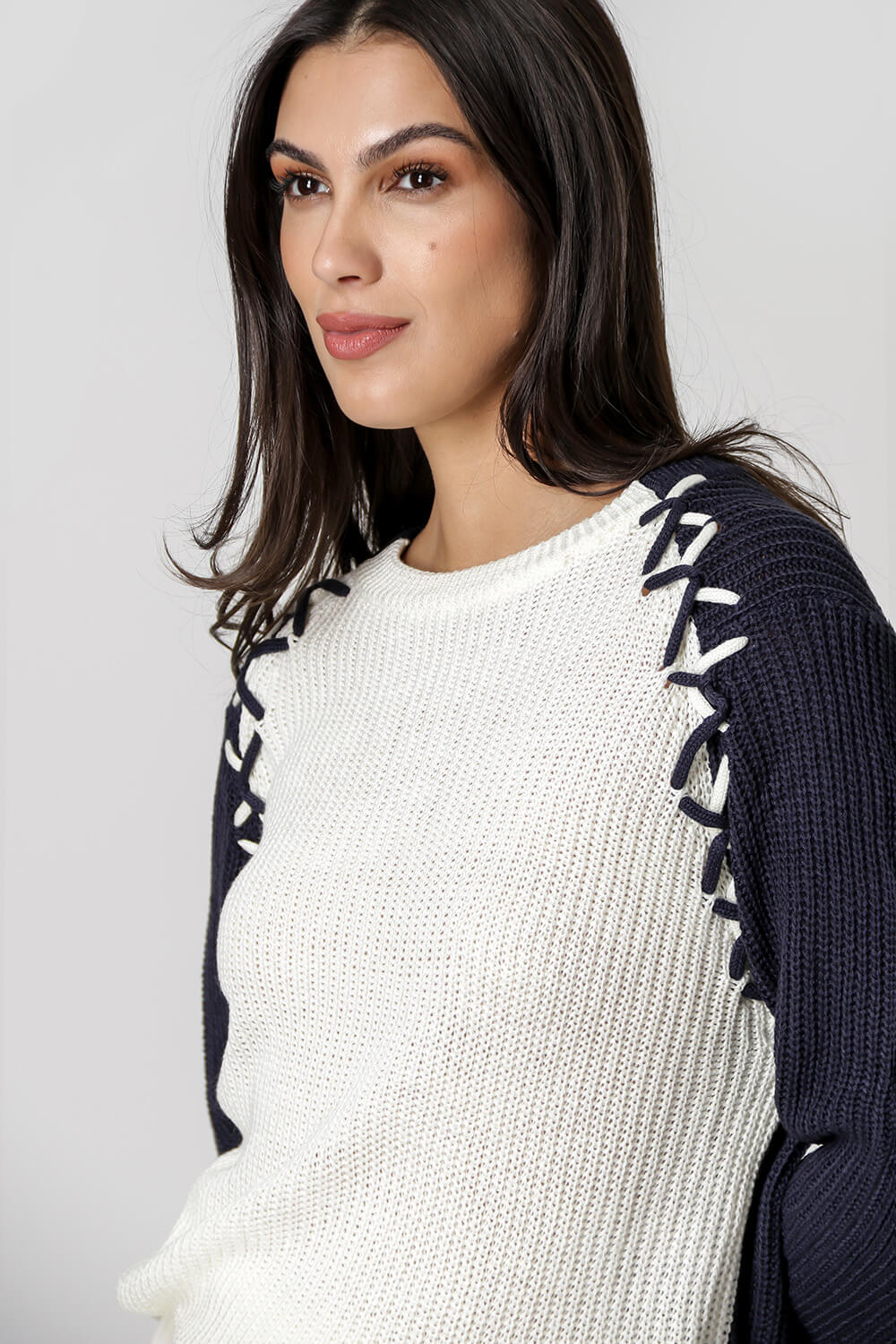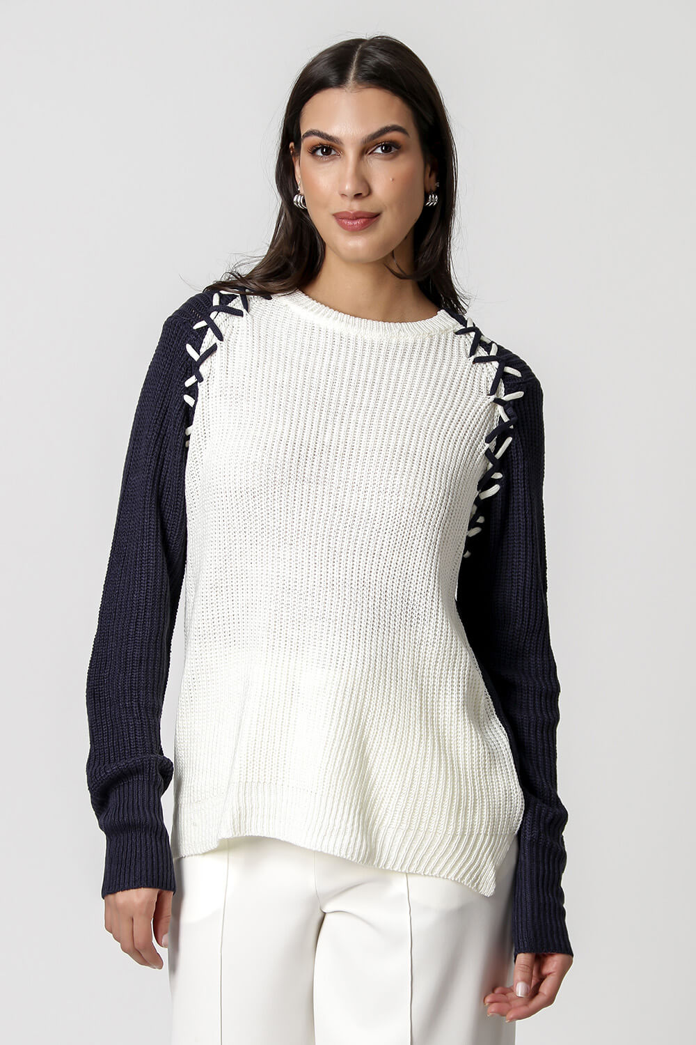 Blusa de tricot com manga longa. Possui detalhe trançado na parte superior das mangas e shape mais alongado. Perfeita para dias frios.
