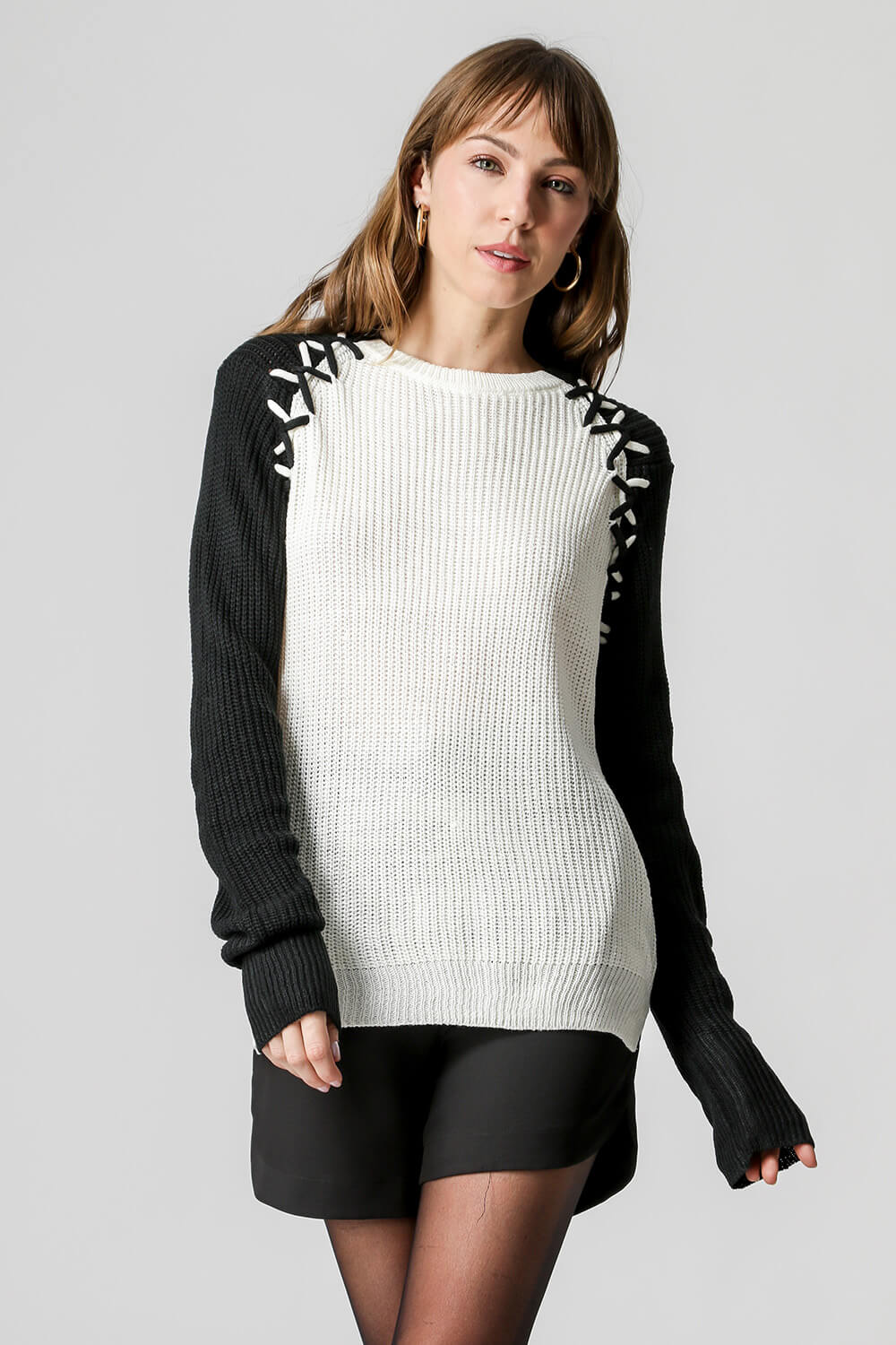 Blusa Tricot Bicolor com Detalhe Trançado - OFF WHITE-PT