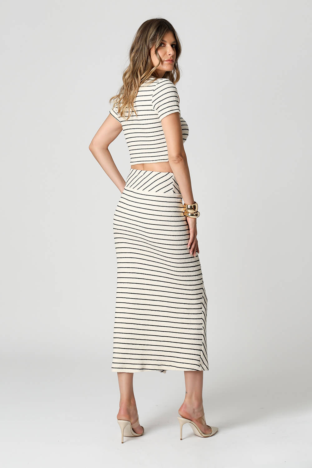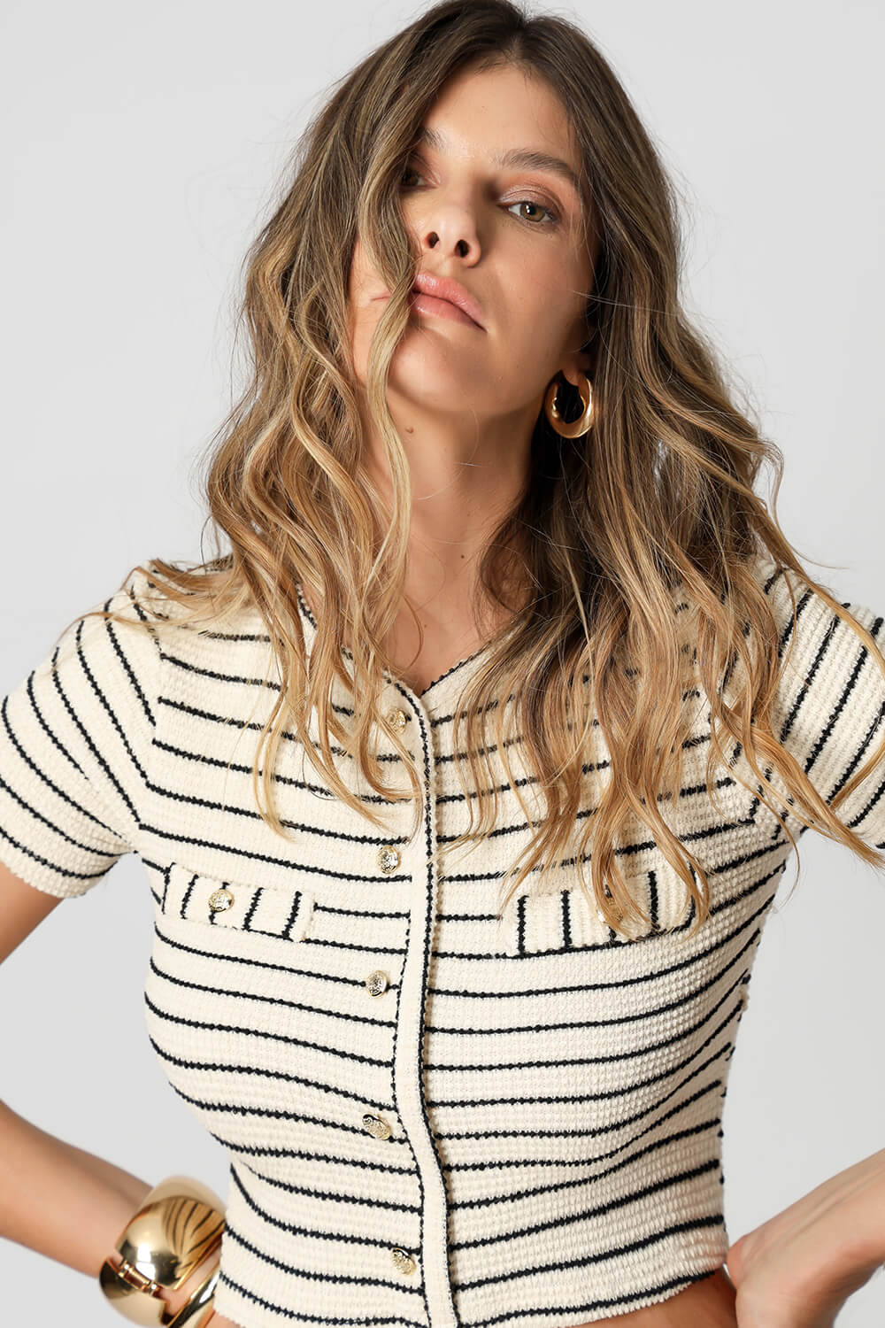 Blusa em tricot listrado com lapela e vista com botão brasão, que adiciona charme ao visual. As listras horizontais dão um toque moderno e estiloso à peça, ideal para compor looks casuais com elegância.