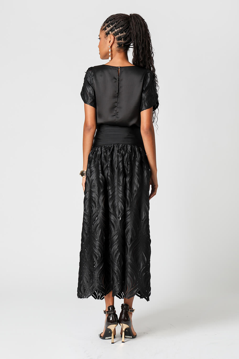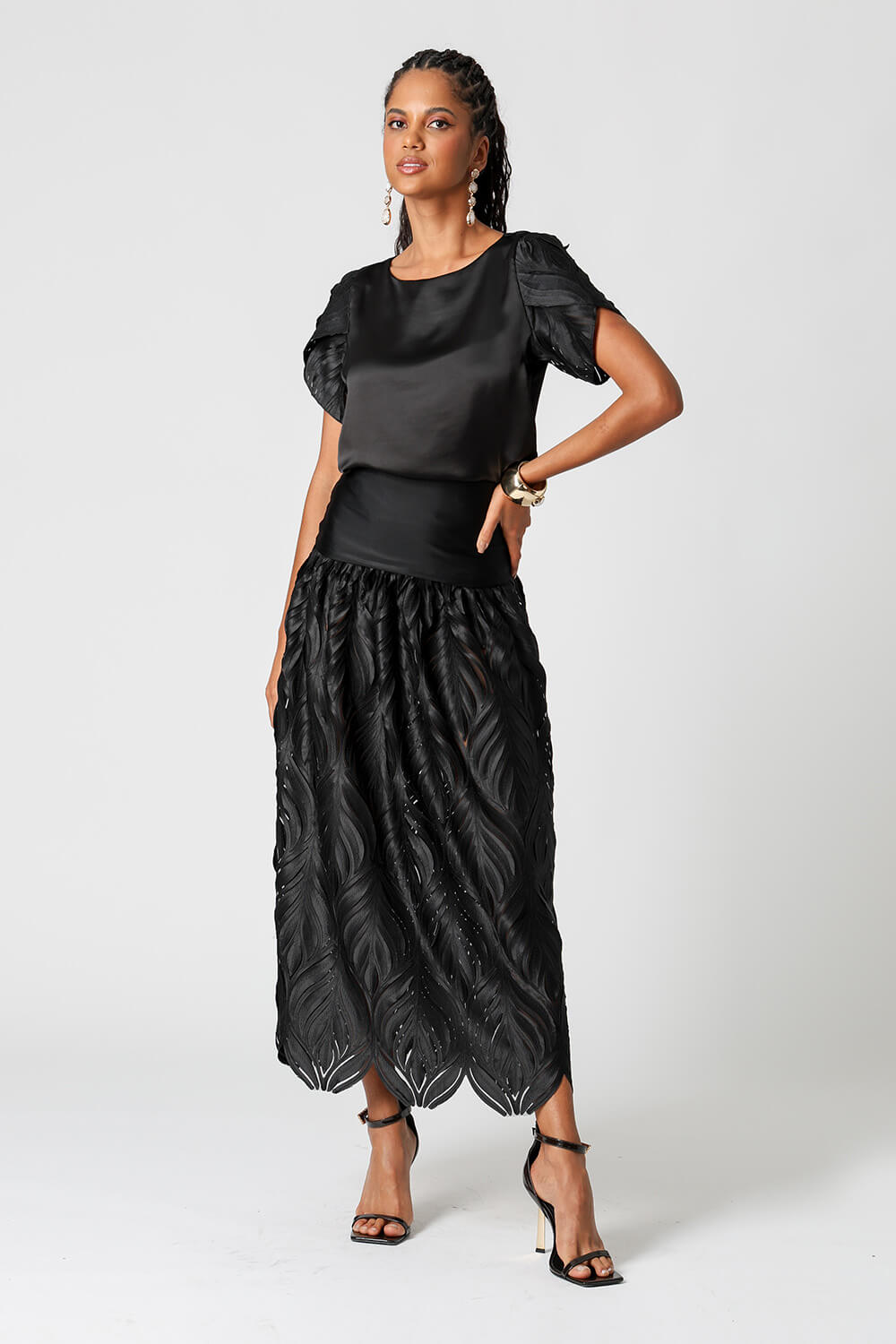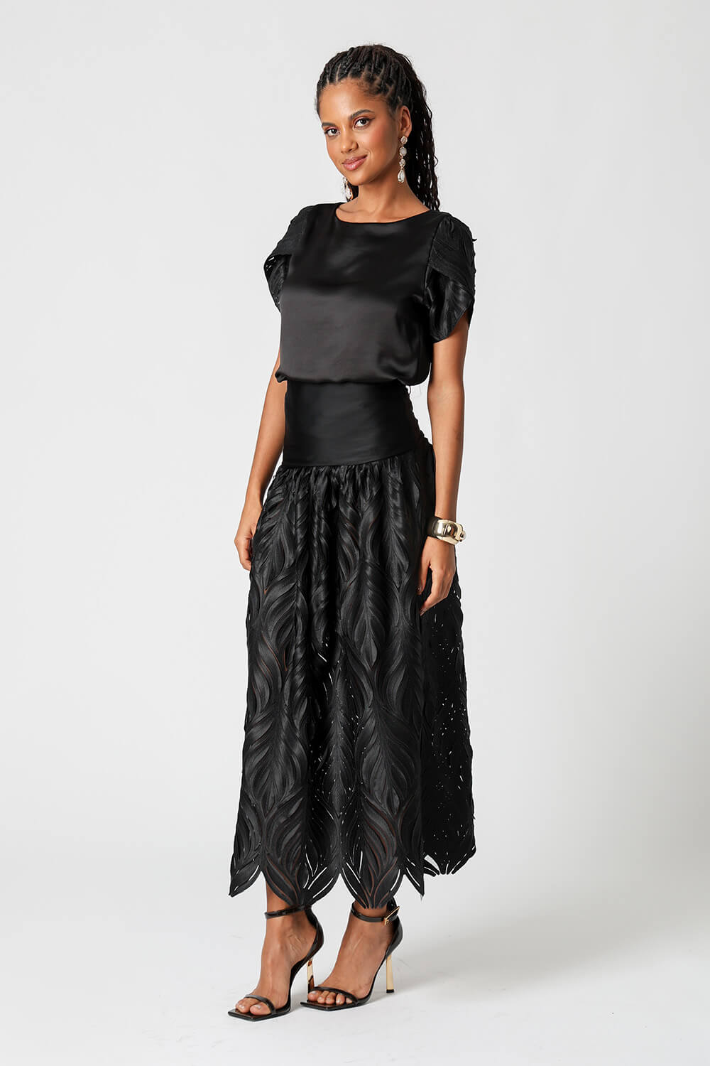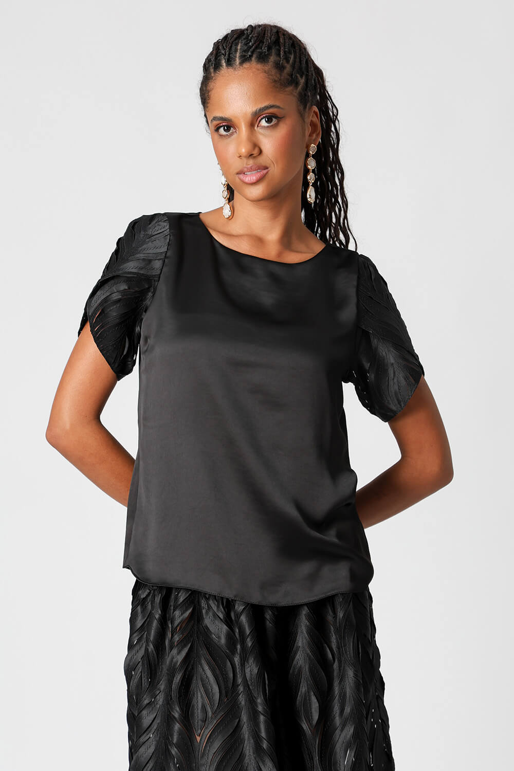 Blusa elegante confeccionada em cetim com tule bordado a laser, destacando mangas estilo tulipa que trazem delicadeza e sofisticação ao visual. Perfeita para composições modernas e femininas.