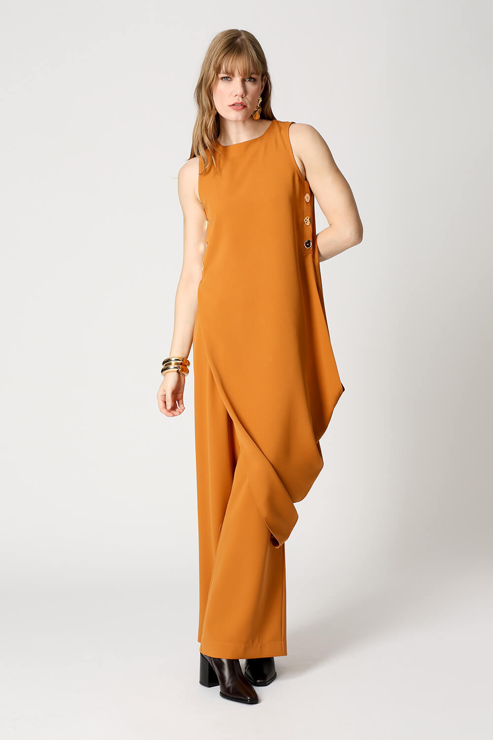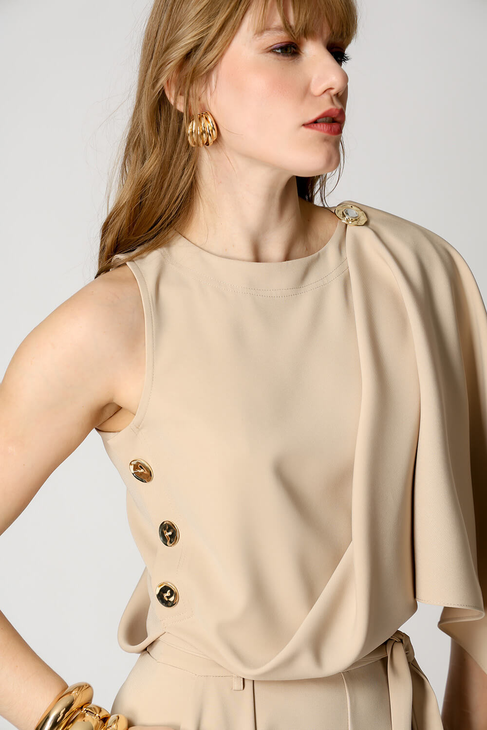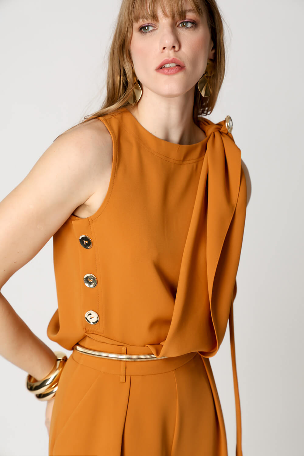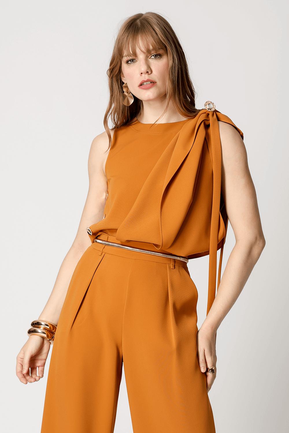 Blusa sem mangas e com modelagem longa. Possui abertura lateral, deixando o braço à mostra de forma elegante. Conta com fechamento lateral por botões e detalhe de broche que adiciona um toque sofisticado à peça. Ideal para compor sobreposições modernas e estilosas.