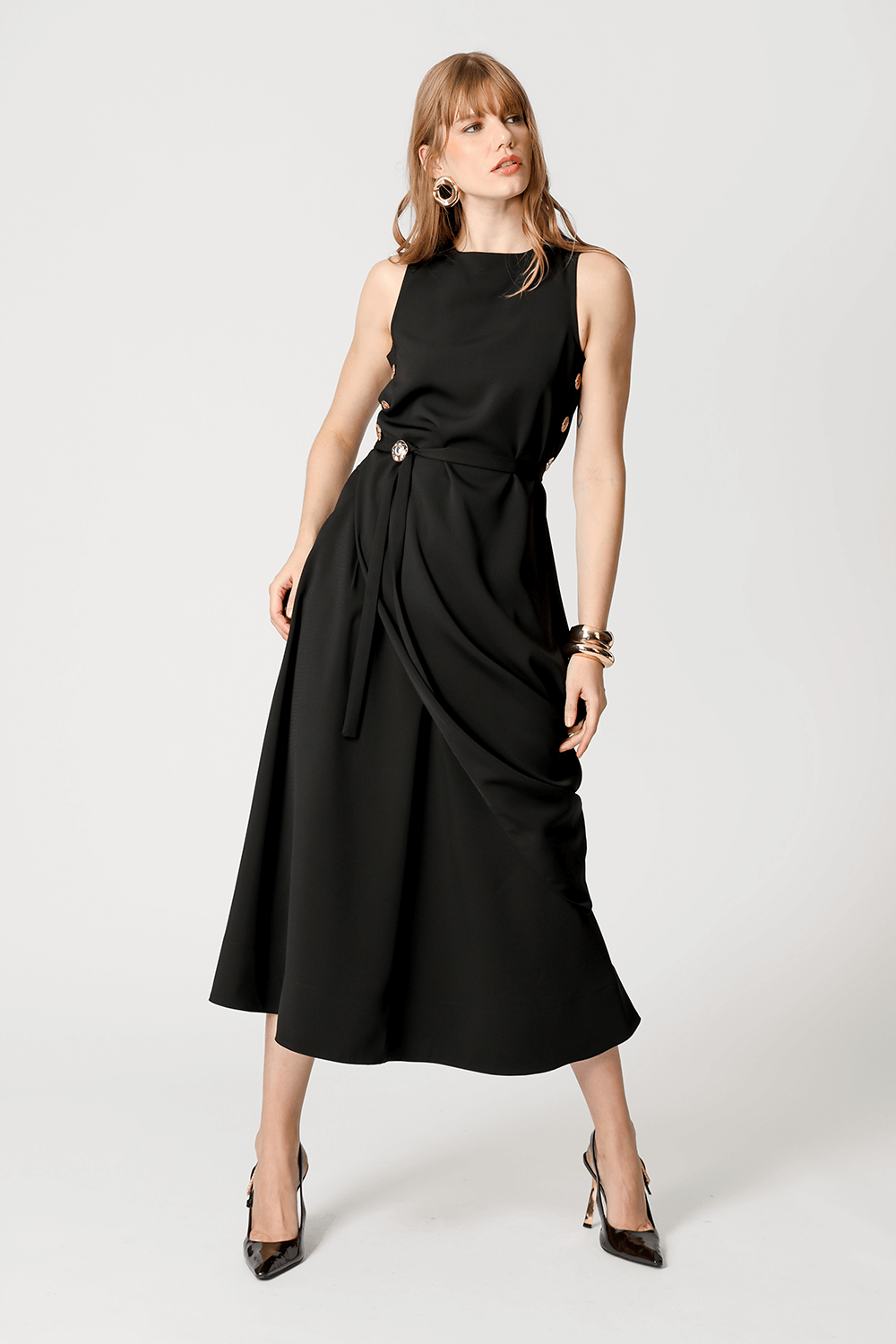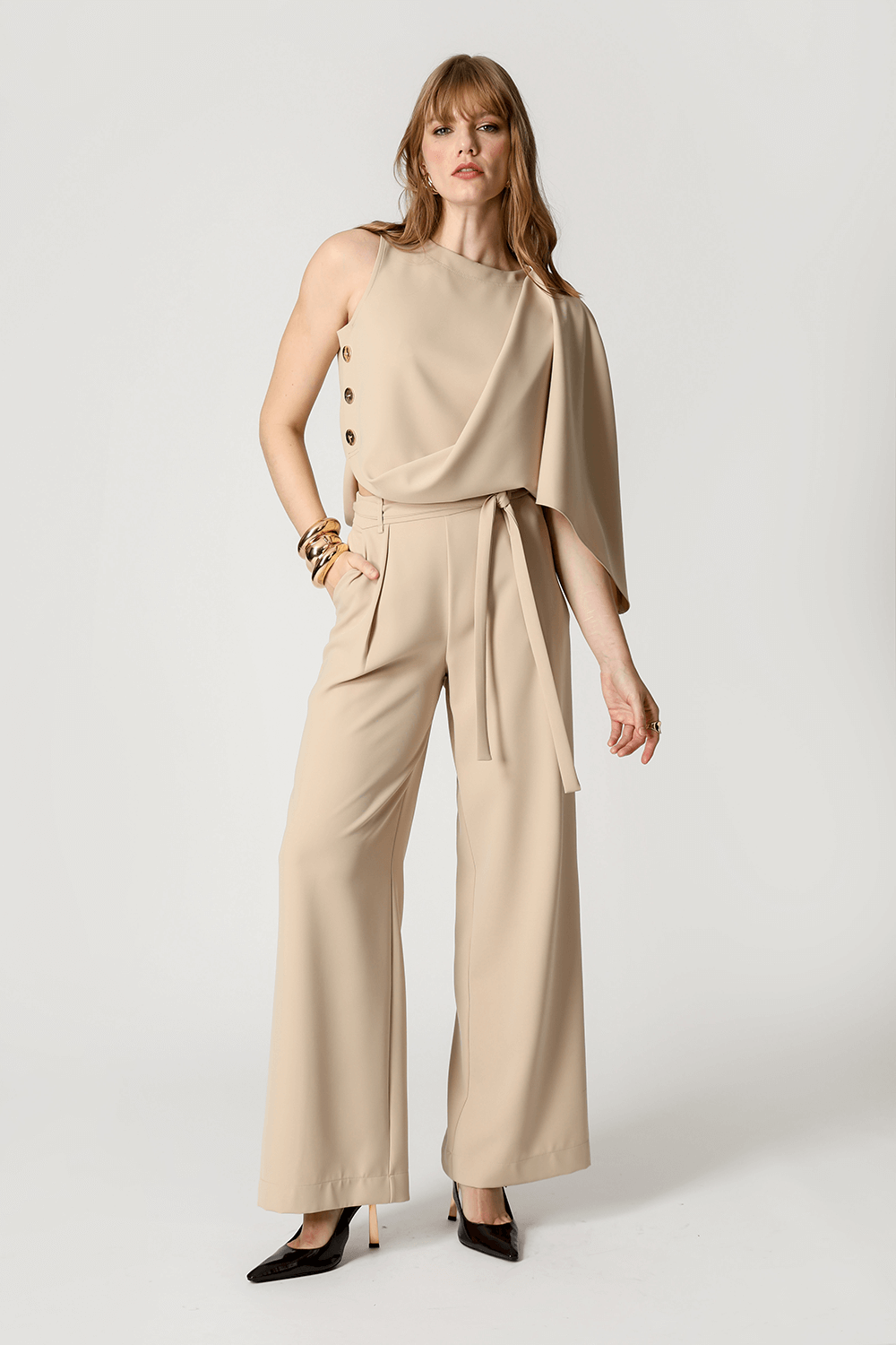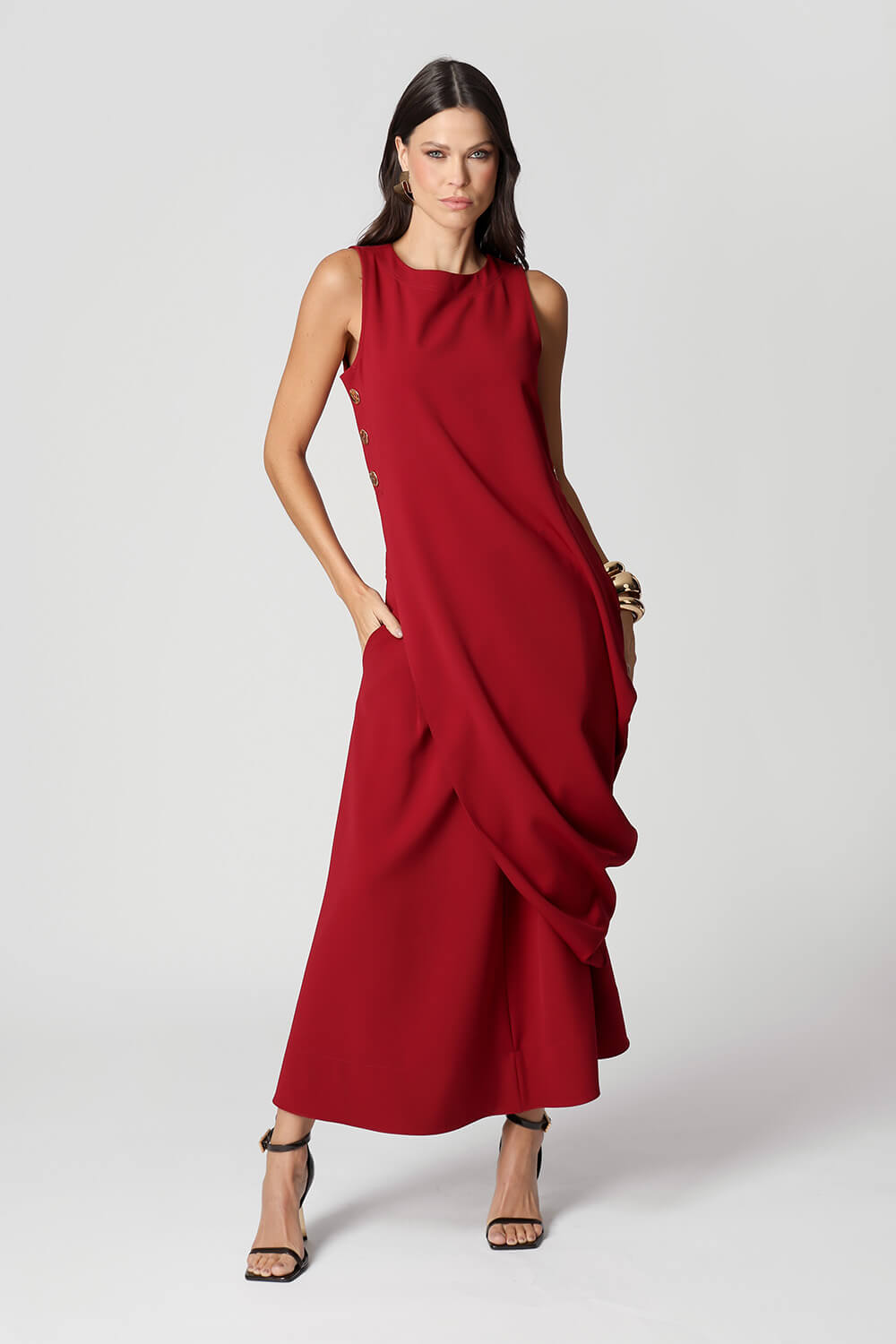 Blusa sem mangas e com modelagem longa. Possui abertura lateral, deixando o braço à mostra de forma elegante. Conta com fechamento lateral por botões e detalhe de broche que adiciona um toque sofisticado à peça. Ideal para compor sobreposições modernas e estilosas.