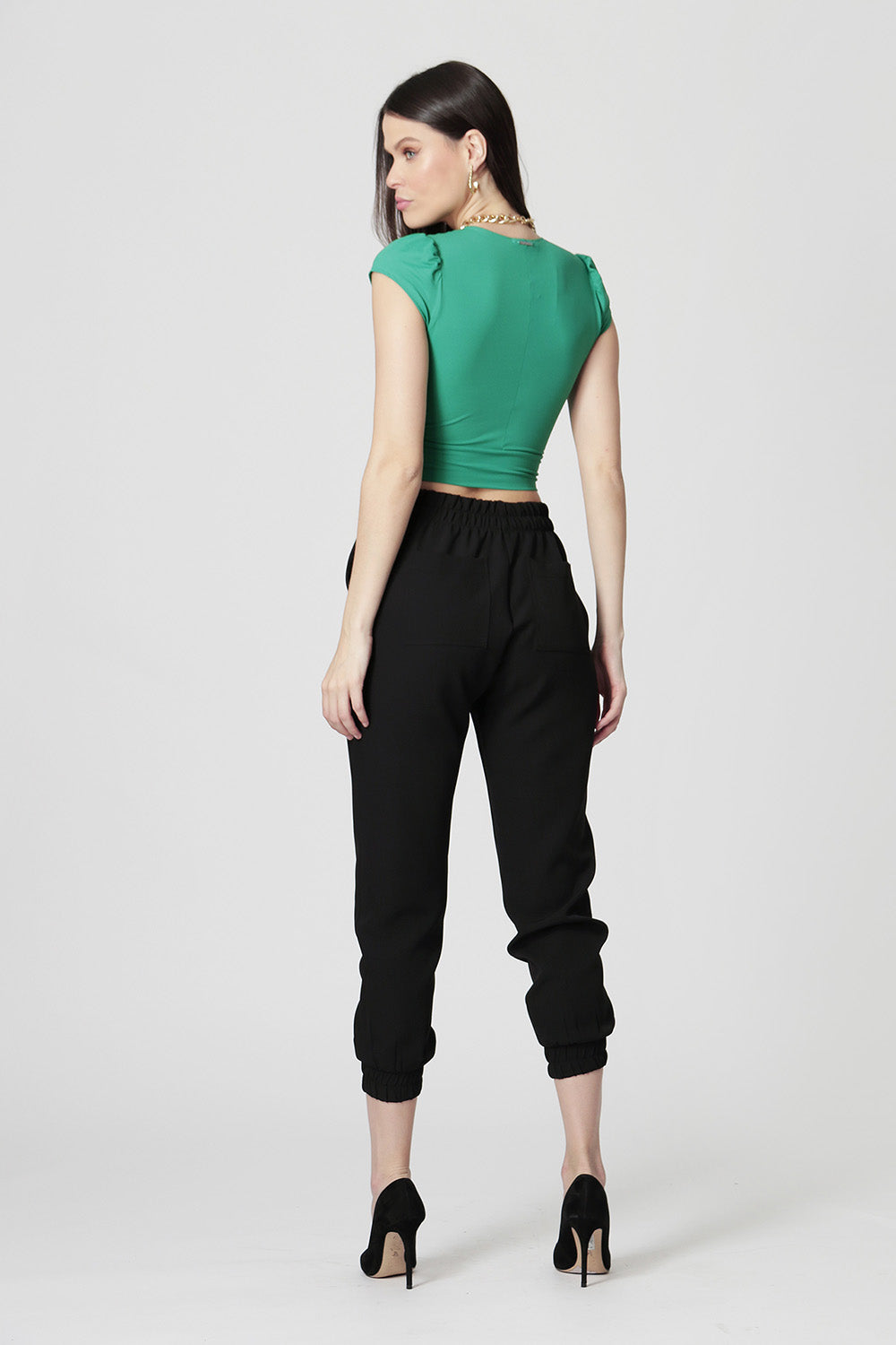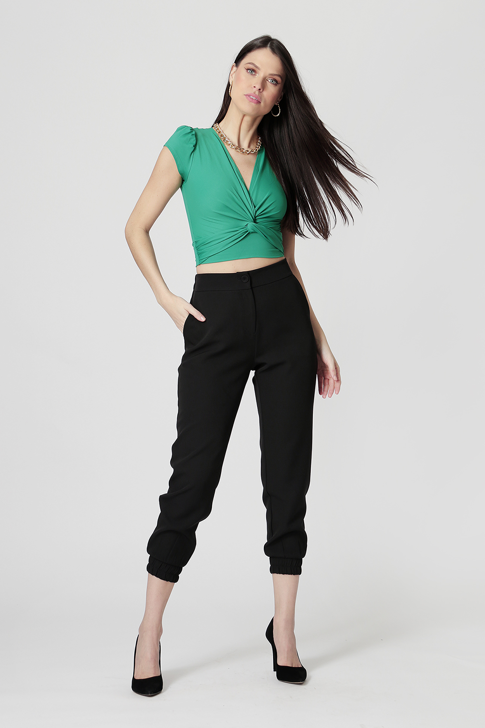 Blusa confeccionada em malha com comprimento curto e shape justo. Possui decote em V profundo e detalhe de nó na barra da frente. Mangas curtas e franzidas compõem a peça também. É um peça casual que deixa o look super despojado.