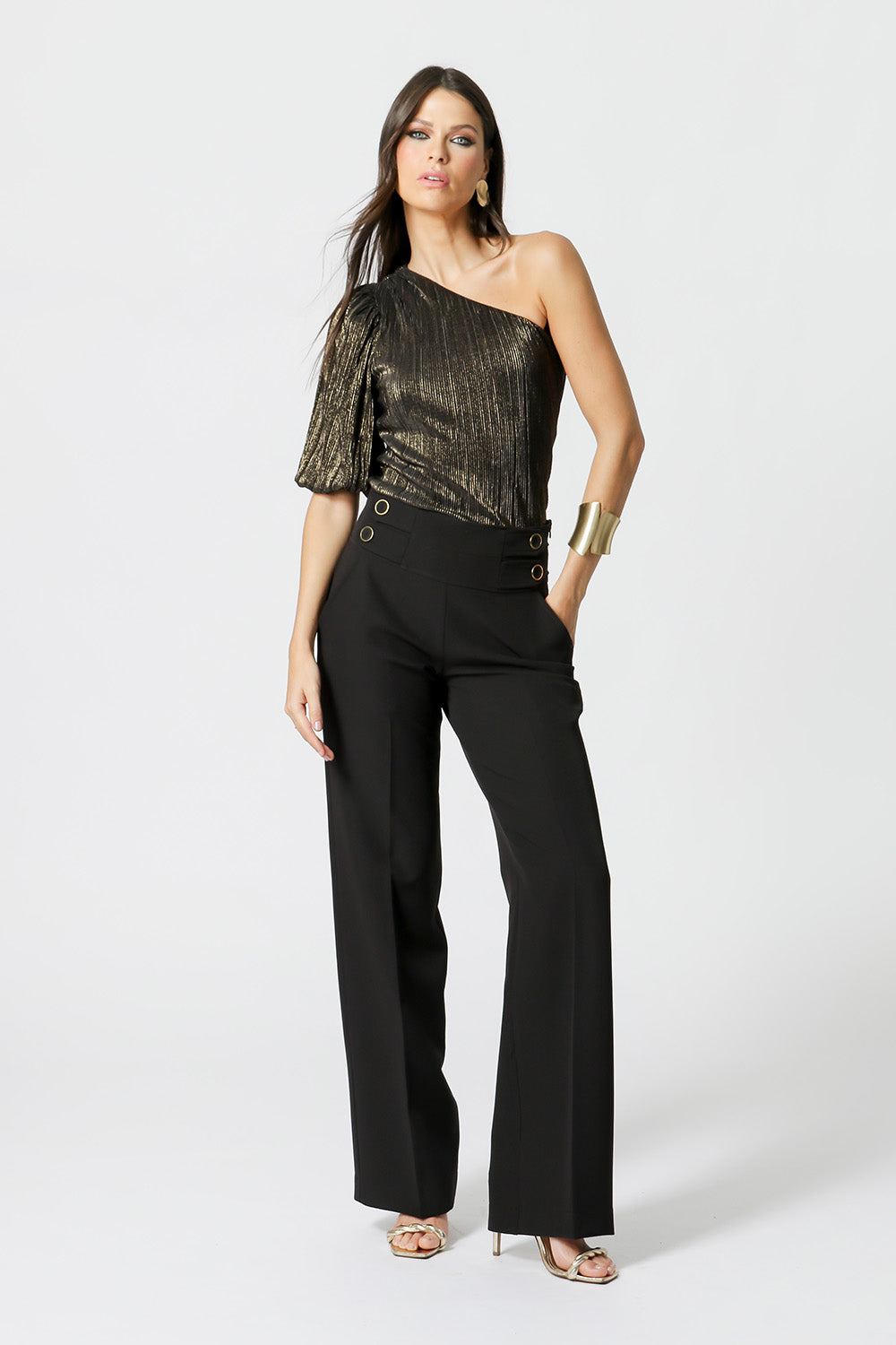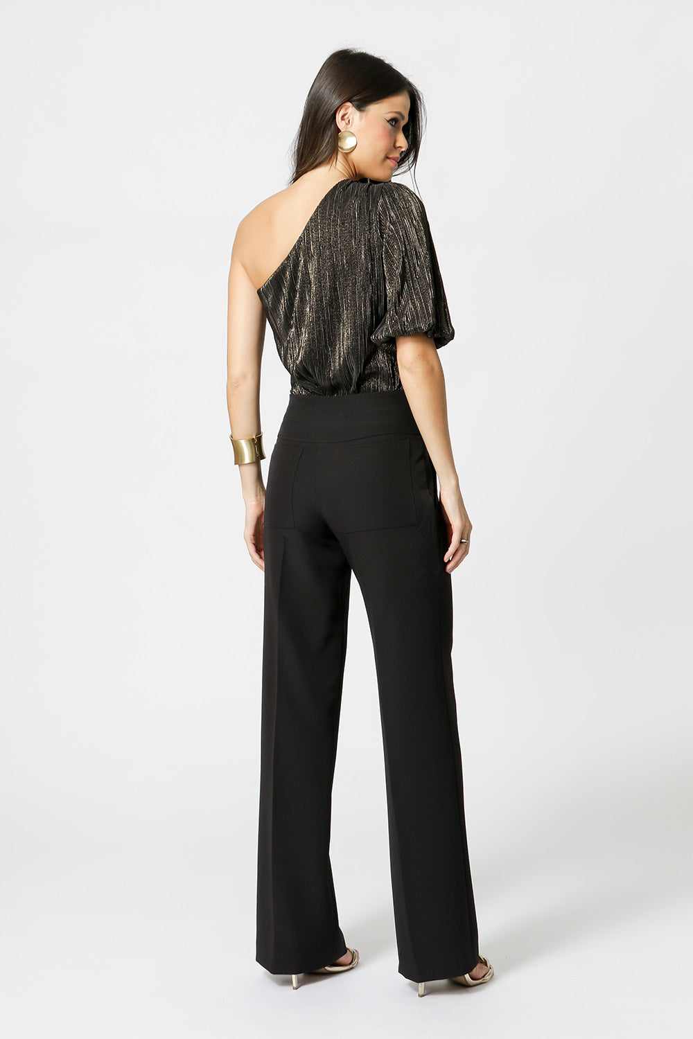 Blusa confeccionada em tecido plissado com um ombro só e manga bufante. Modelo marcante para arrasar no look night.