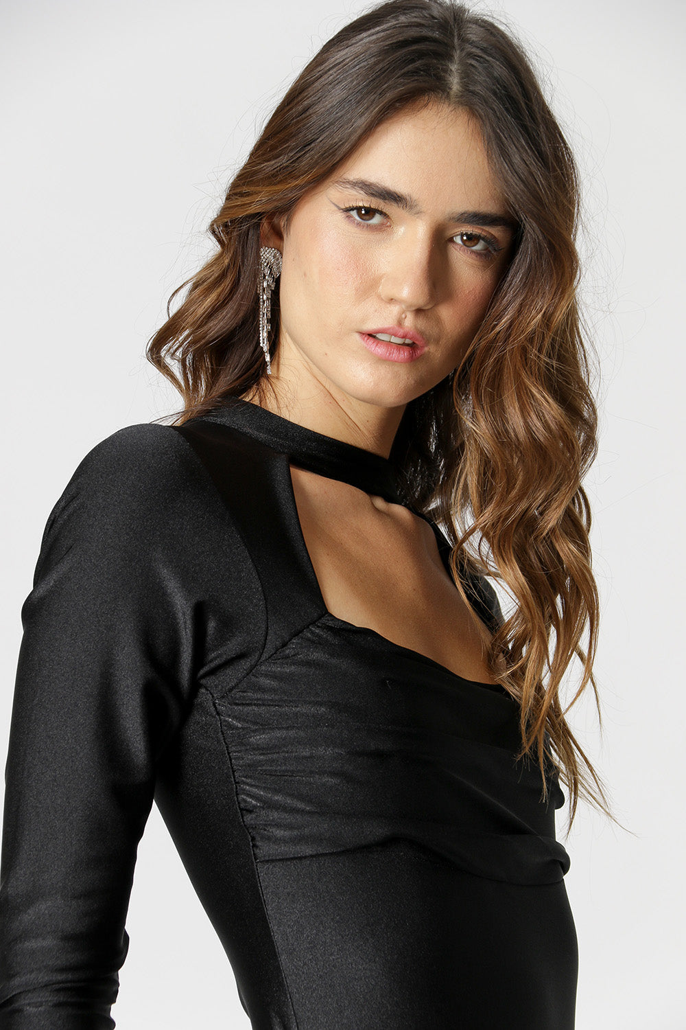 Blusa body confeccionada em malha Amni, com chocker e franzido no busto. Um look jovem e atual para suas night.