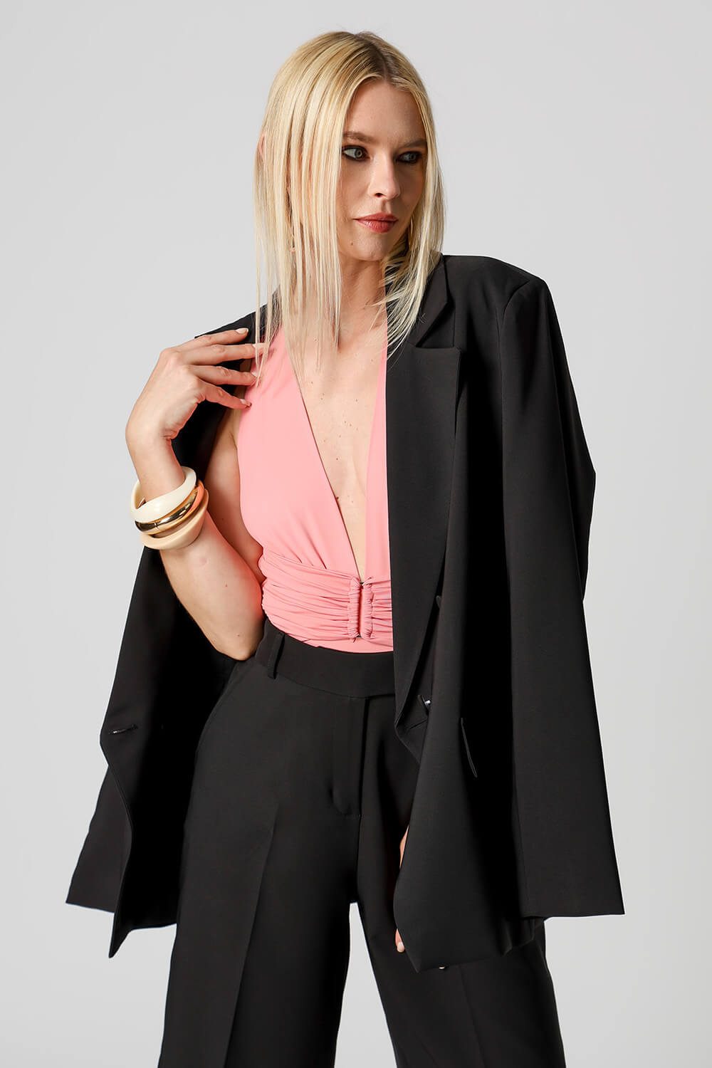 Body em malha Amni com decote profundo e pala franzida na frente, presa por fivela metálica. Peça moderna e sensual, com toque macio e caimento impecável.