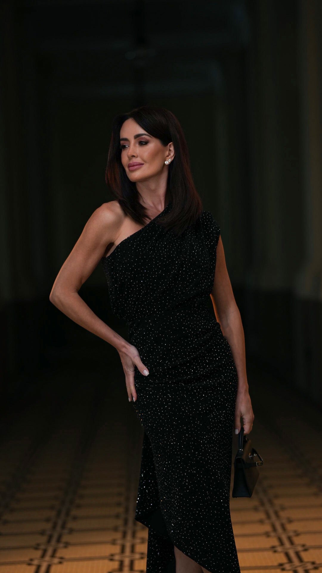 Body elegante de um ombro único confeccionado em malha lurex, com pedrarias aplicadas por toda a peça. Possui pregas no ombro que formam um elegante drapeado frontal com efeito blusado. Toque sofisticado, caimento perfeito e muito brilho para produções marcantes.