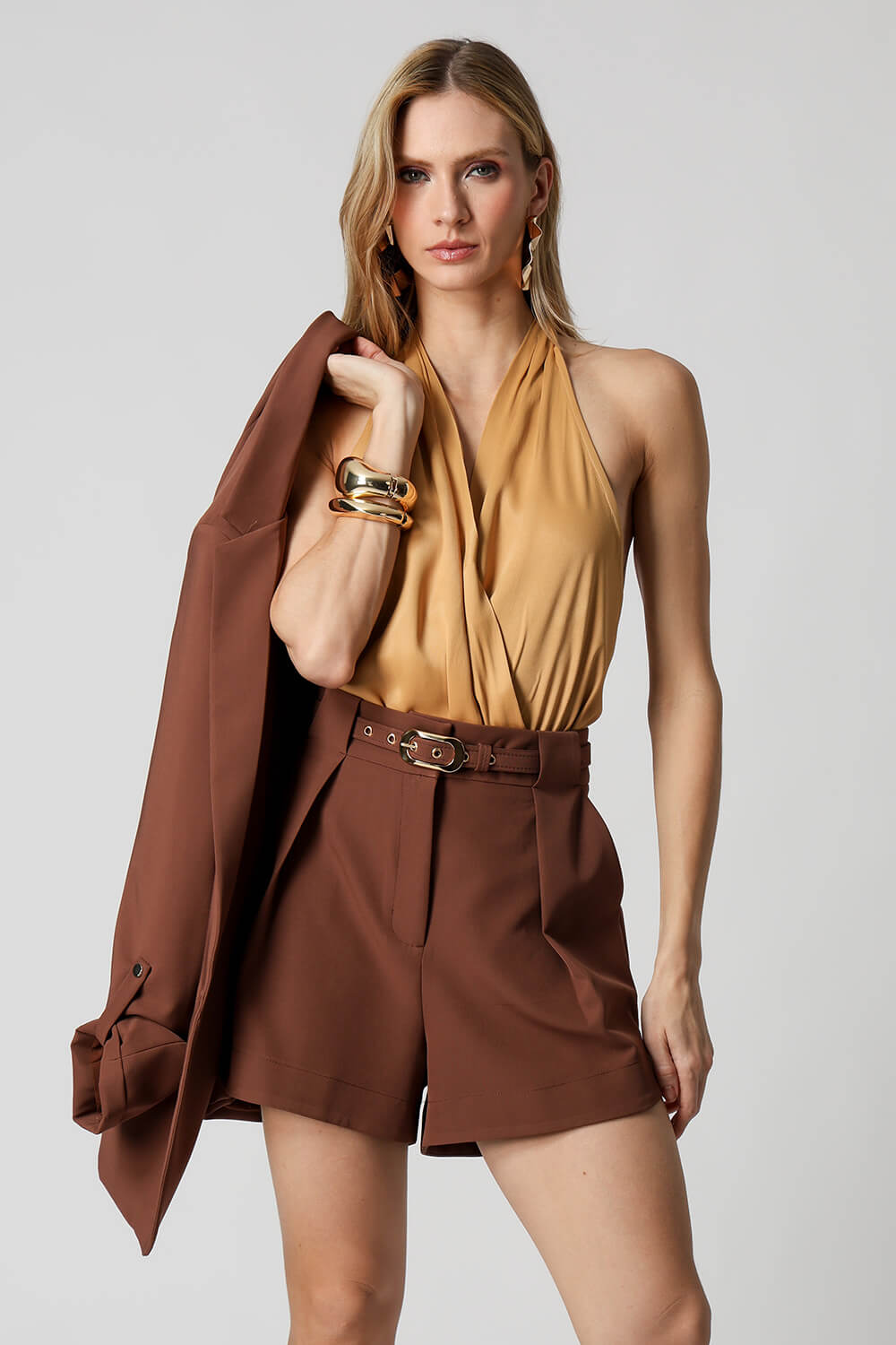 Body elegante com frente transpassada e costas abertas com amarração única. Confeccionado em cetim premium, garante brilho sofisticado e caimento perfeito para produções modernas e femininas.