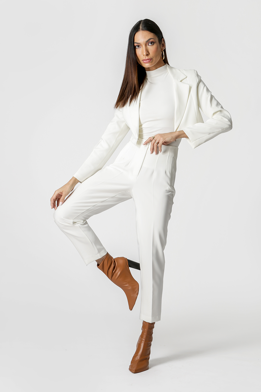 Calça com modelagem cenoura em tecido de alfaiataria. Pregas frontais pespontadas e bolsos frontais e traseiros. A peça coringa e cheia de elegância para compor o look.