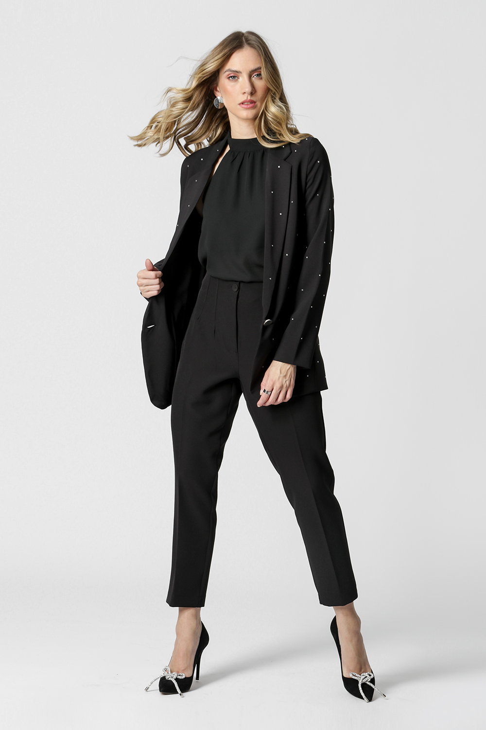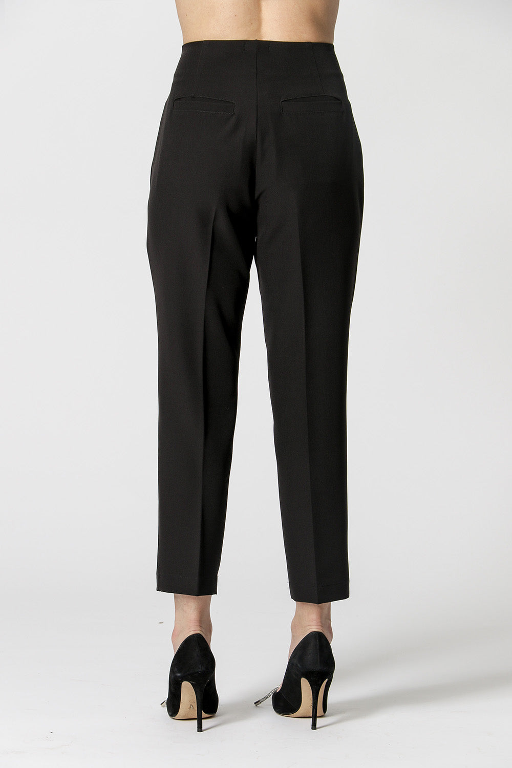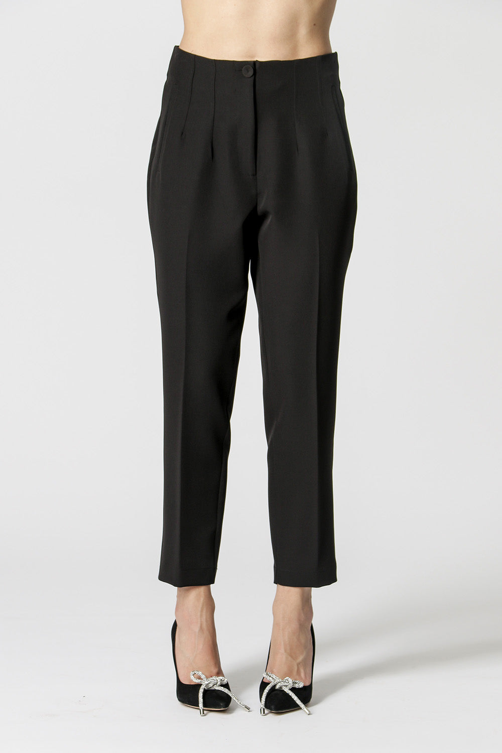 Calça com modelagem cenoura em tecido de alfaiataria. Pregas frontais pespontadas e bolsos frontais e traseiros. A peça coringa e cheia de elegância para compor o look.