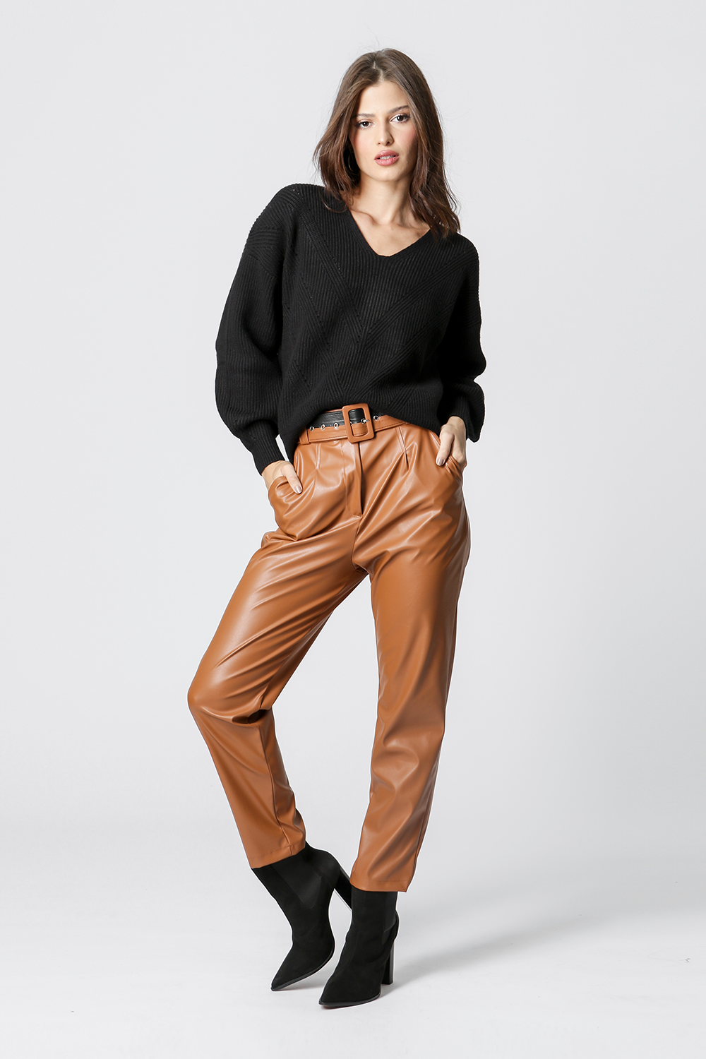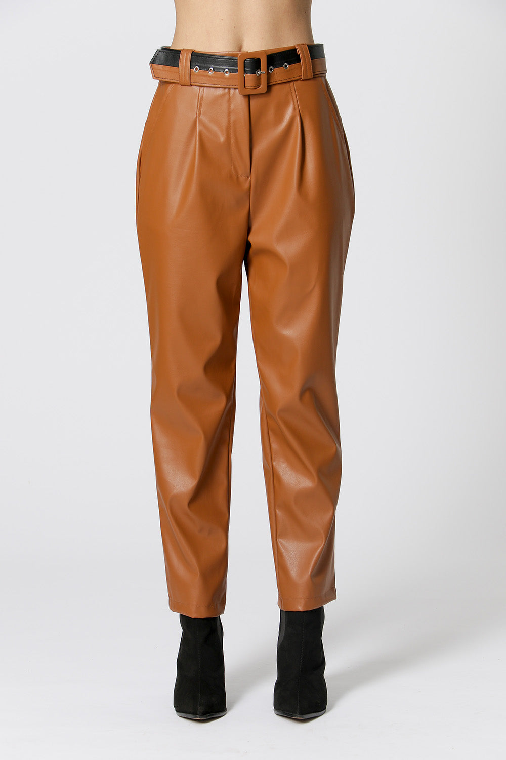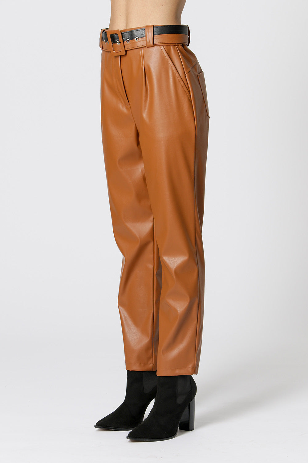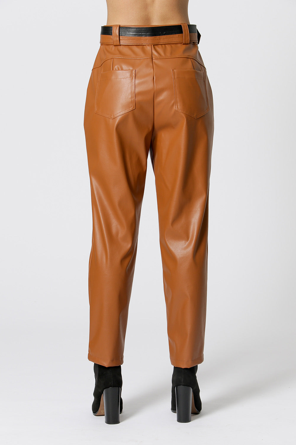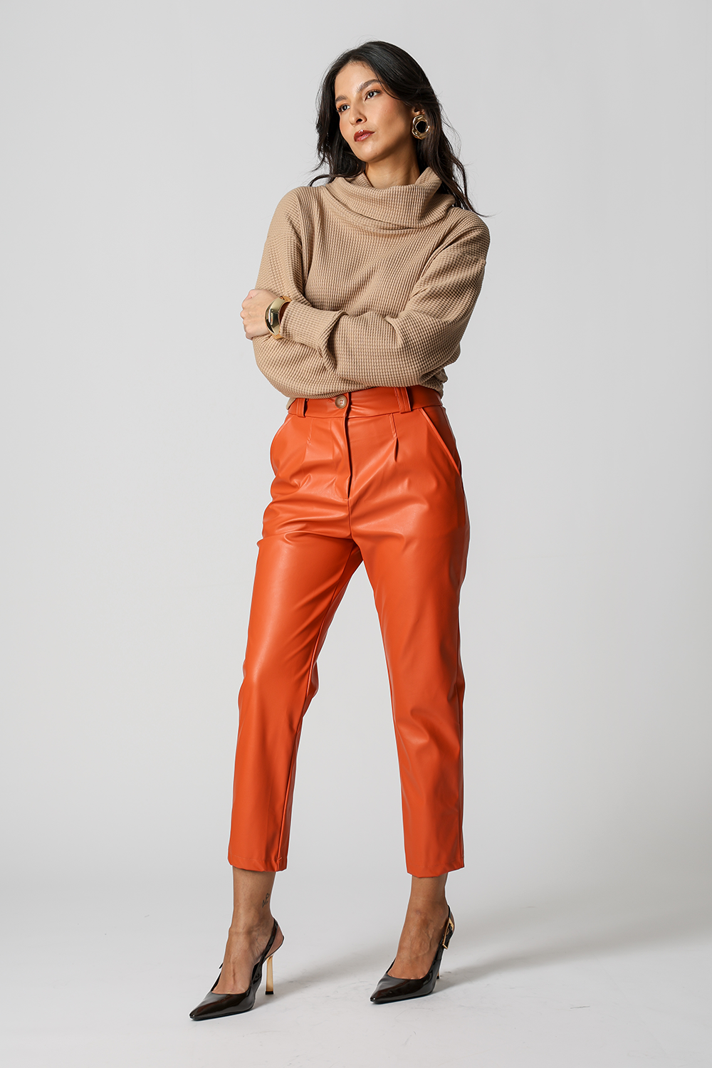 Calça de modelagem cenoura confeccionada em couro sintético com faixa pespontada bicolor. É uma peça super diferencial que da um ar mega estiloso no look.