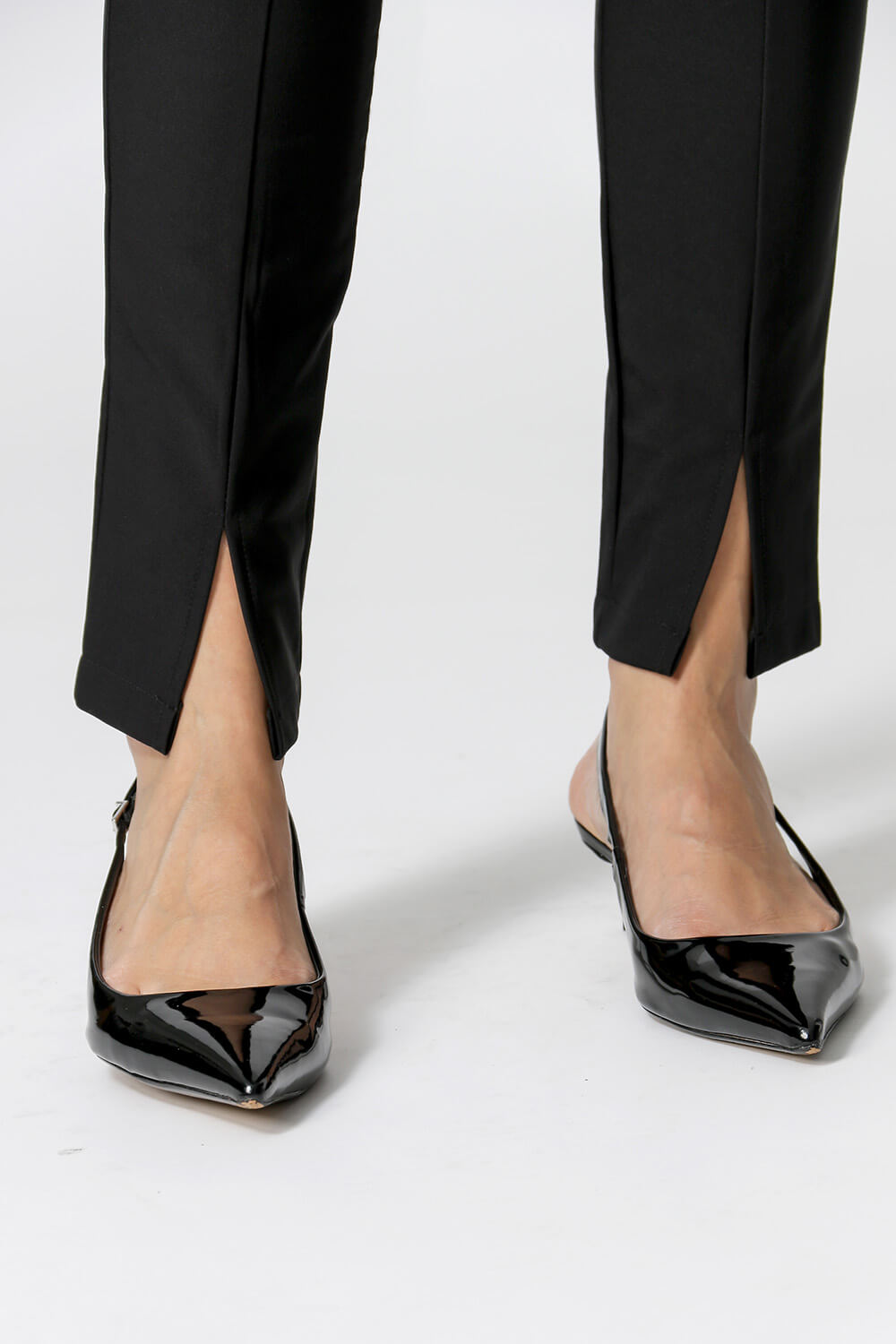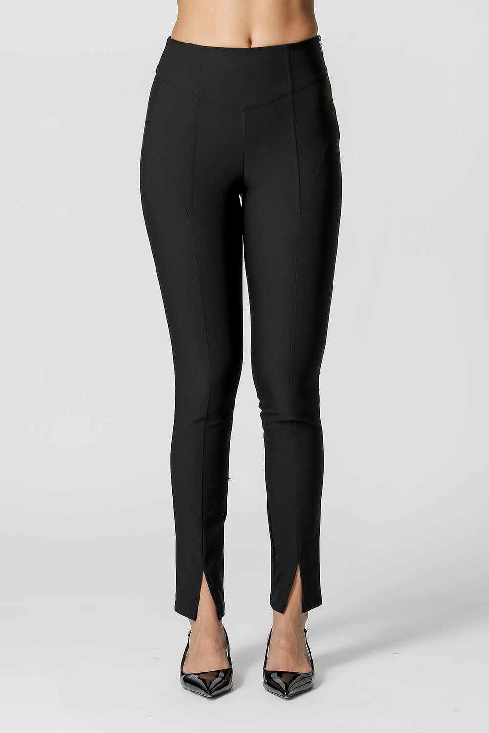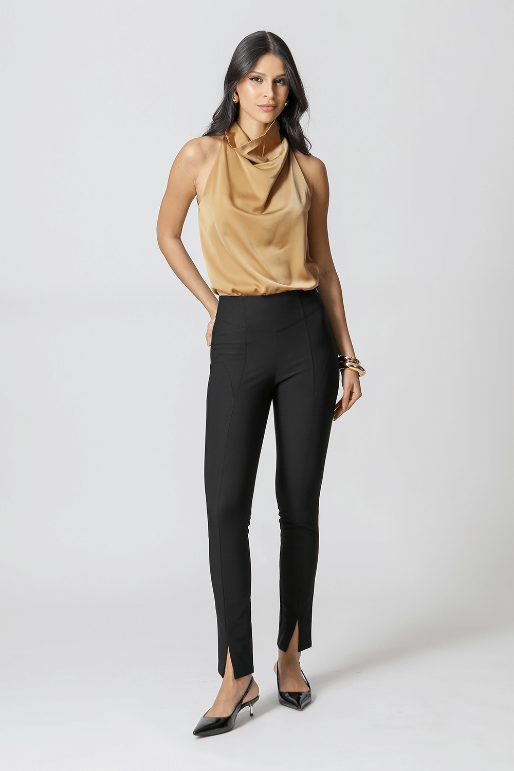 Calça com recortes e fenda frontal. Uma peça que compõe looks de trabalho e casuais.