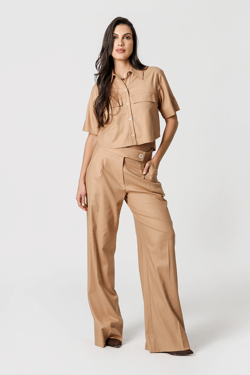 Calça Cos Transpassado De Linho pantalona com bolso faca e passadoria vincada e barra larga. Uma peça atemporal, ideal para look work casual.